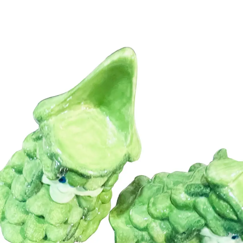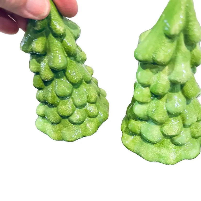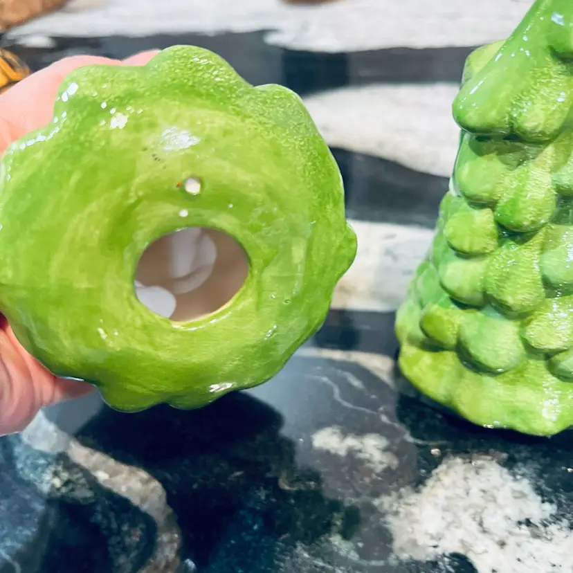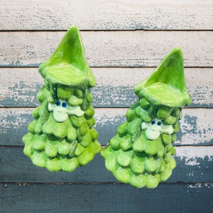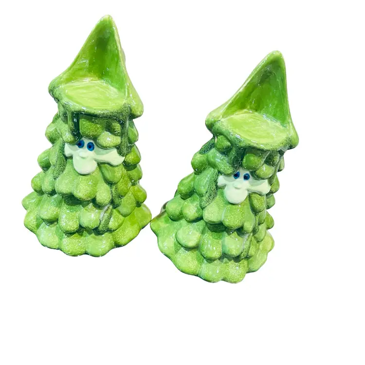 Add a touch of vintage charm to your Christmas decor with this set of two Weirdo Anthropomorphic Christmas Tree Tea Light Candle Holders. These unique candle holders feature an abstract pattern and a green glazed finish that will complement any festive occasion. Perfect for adults, these tree-shaped candle holders are sure to bring a hint of nostalgia to your holiday decor.
