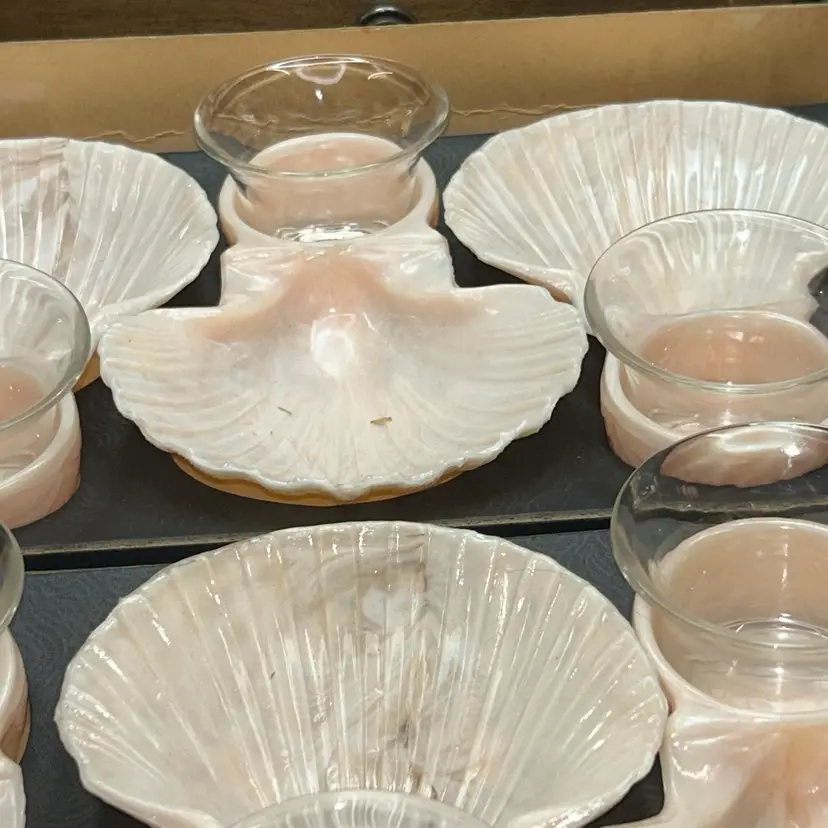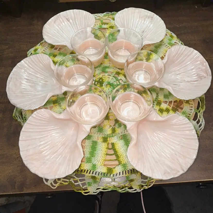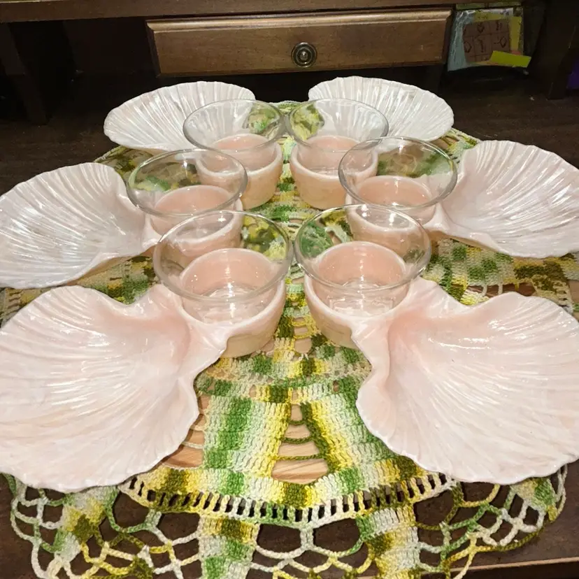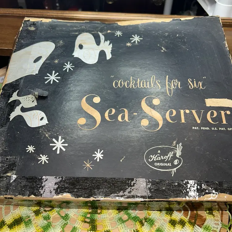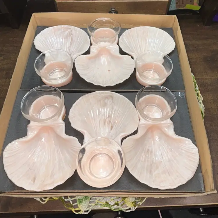 Box is in rough shape but bottom has all sides and inserts. Top has 2 sides. The Shrimp Cocktail dishes and sauce glasses are in new condition. Sauce glasses are marked Federal Glass. Box is 14” x 12”. Each plastic shell dish is 6” long x 4.5” at widest. Sauce glasses are 2.5” in diameter at top, 2” tall, and 1.75” diameter across bottom.