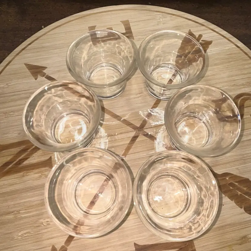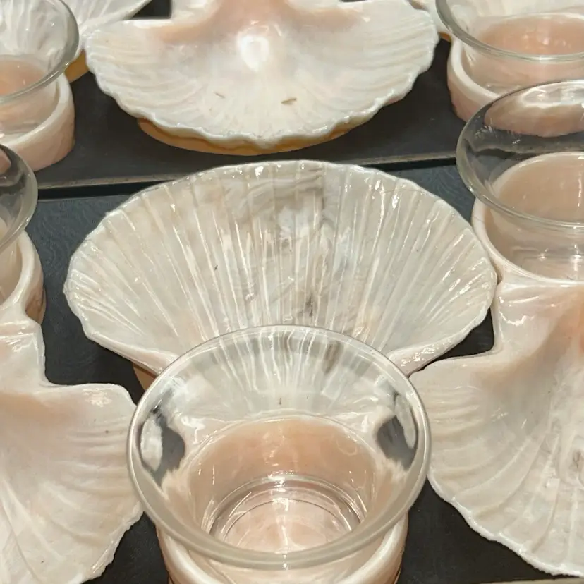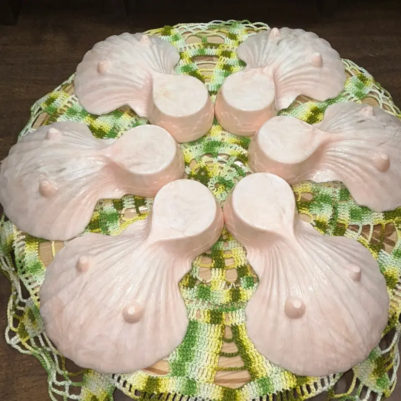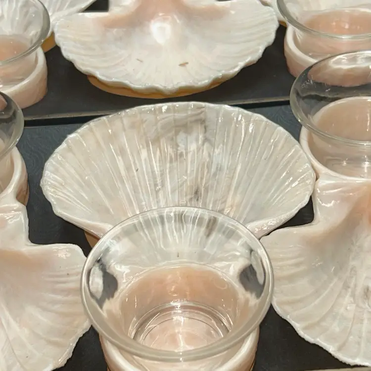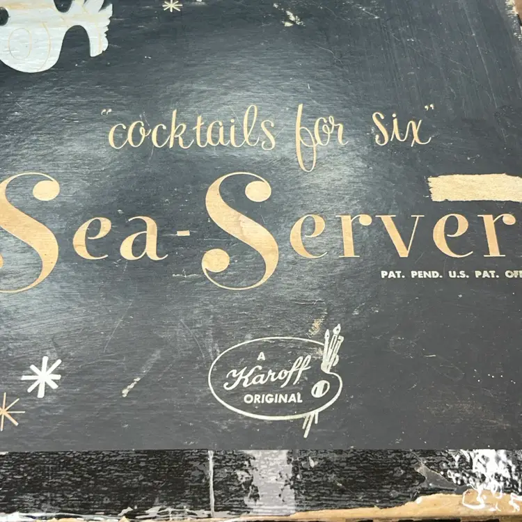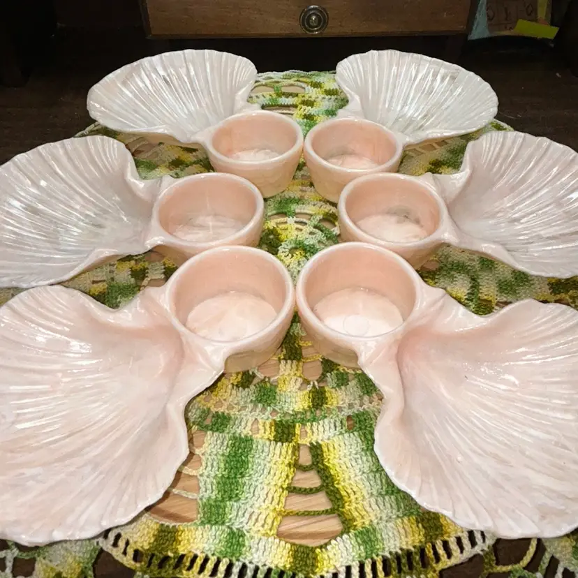 Box is in rough shape but bottom has all sides and inserts. Top has 2 sides. The Shrimp Cocktail dishes and sauce glasses are in new condition. Sauce glasses are marked Federal Glass. Box is 14” x 12”. Each plastic shell dish is 6” long x 4.5” at widest. Sauce glasses are 2.5” in diameter at top, 2” tall, and 1.75” diameter across bottom.