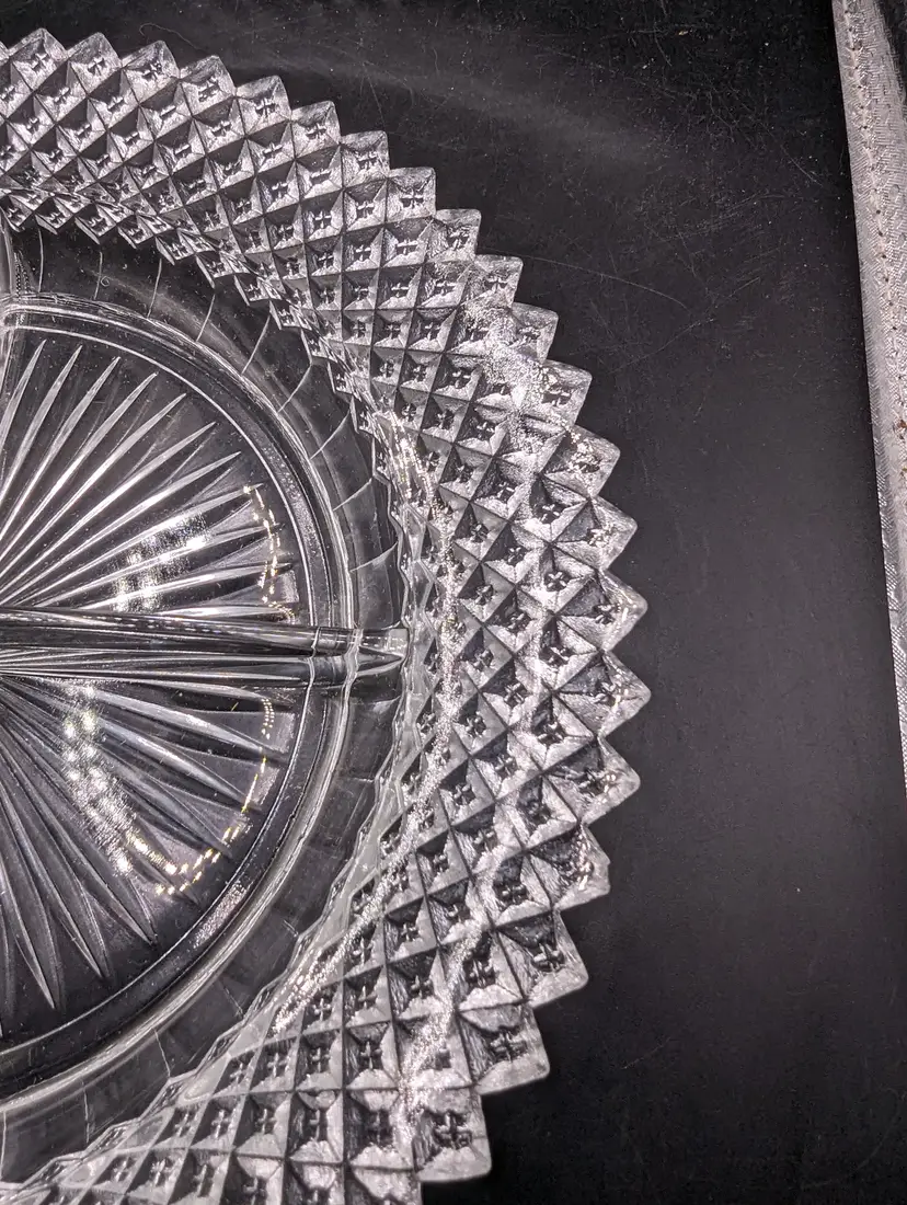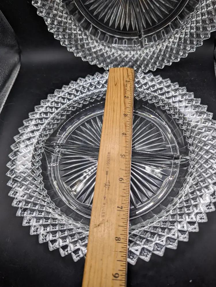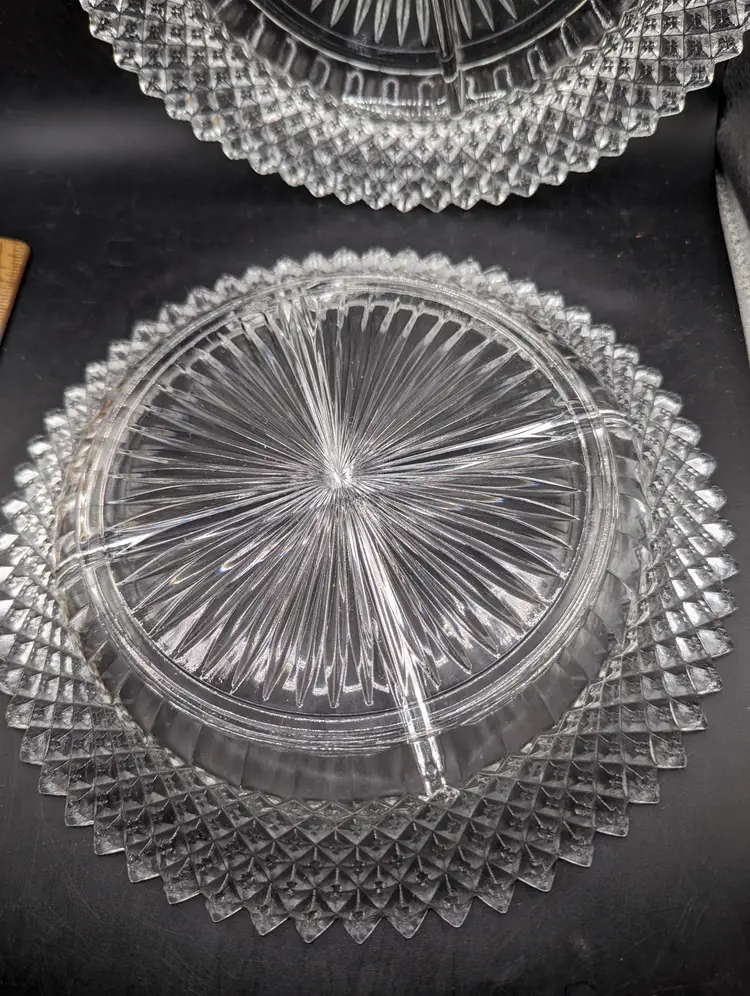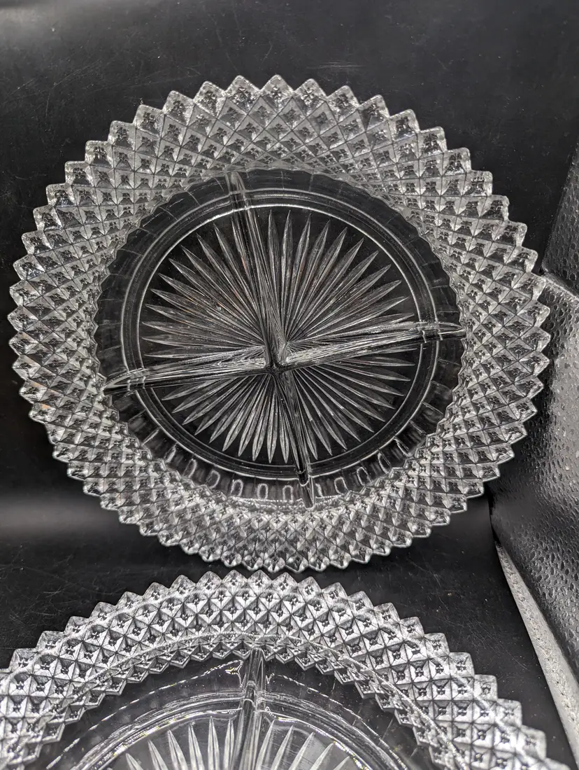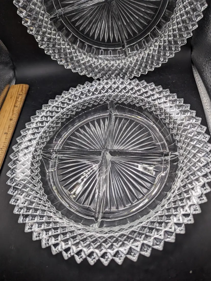 This is a lovely Vintage Set of 2 Anchor Hocking Miss America 4 Part Divided Relish Dish As Is. Please see all pictures for condition and measurements. There are two teeth that have chips. Still a very nice set.