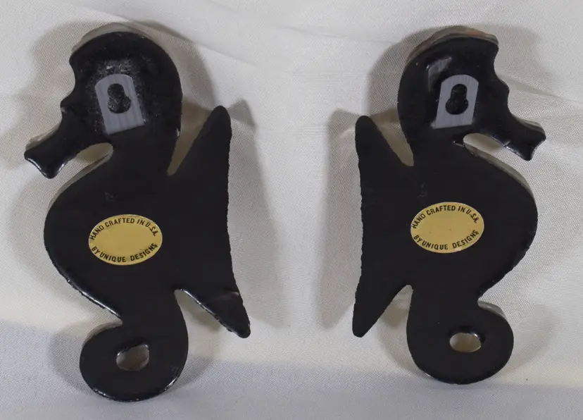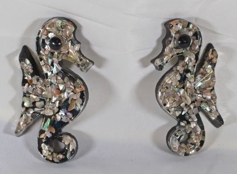 Vintage Set of 2 Black Lucite & Abalone Seahorse Wall Plaques. In good condition. Each measures 2.75" wide x 5.25" long x .50" thick.