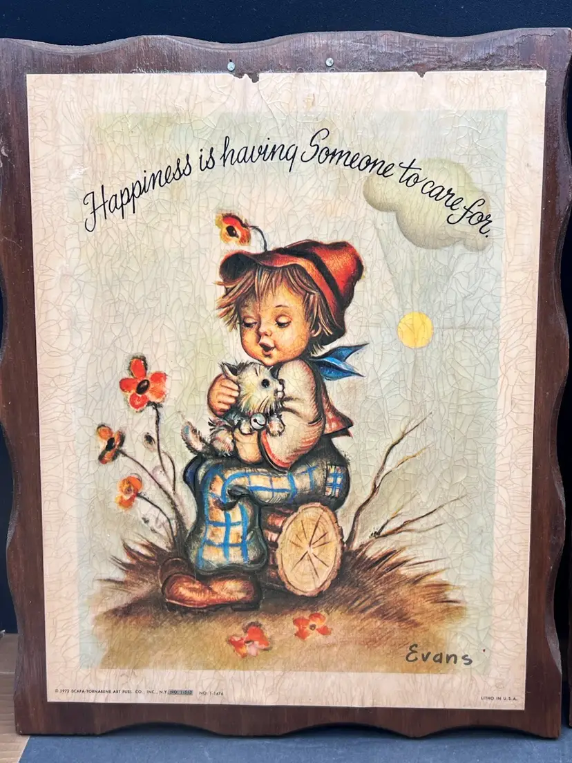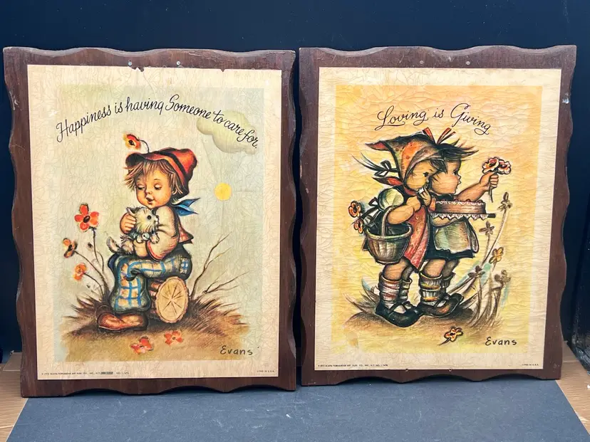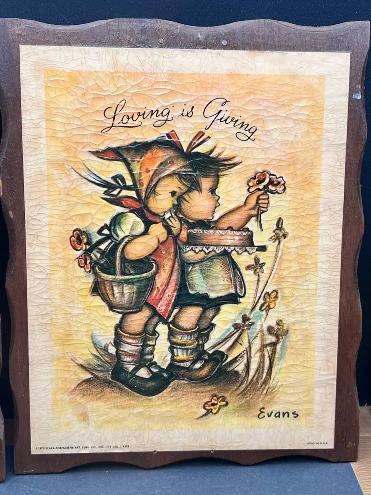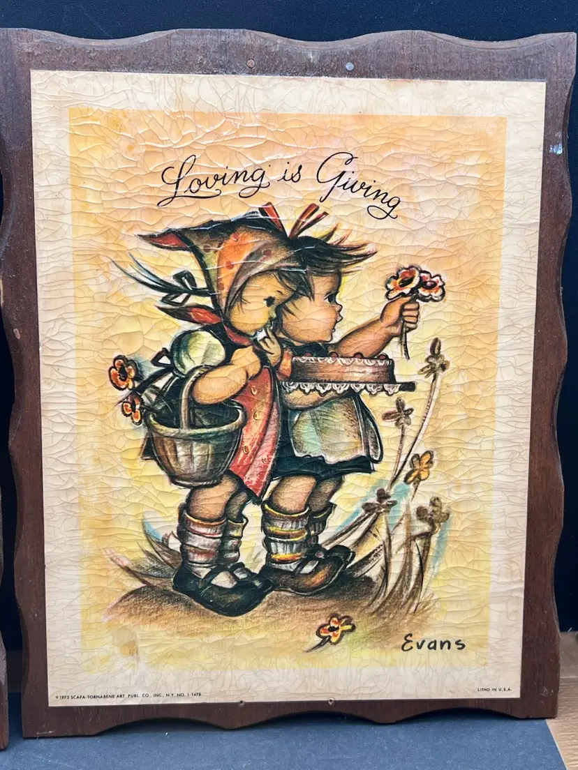 Vintage Set of 2 Hummel Lithograph Pictures Mounted On Wood 1972 Little Boy And A Dog On A Stump, ‘Happiness Is Having Someone To Care For’ 1973 Two Little Girls Picking Flowers ‘Loving Is Giving’ By Evan’s, Made In USA