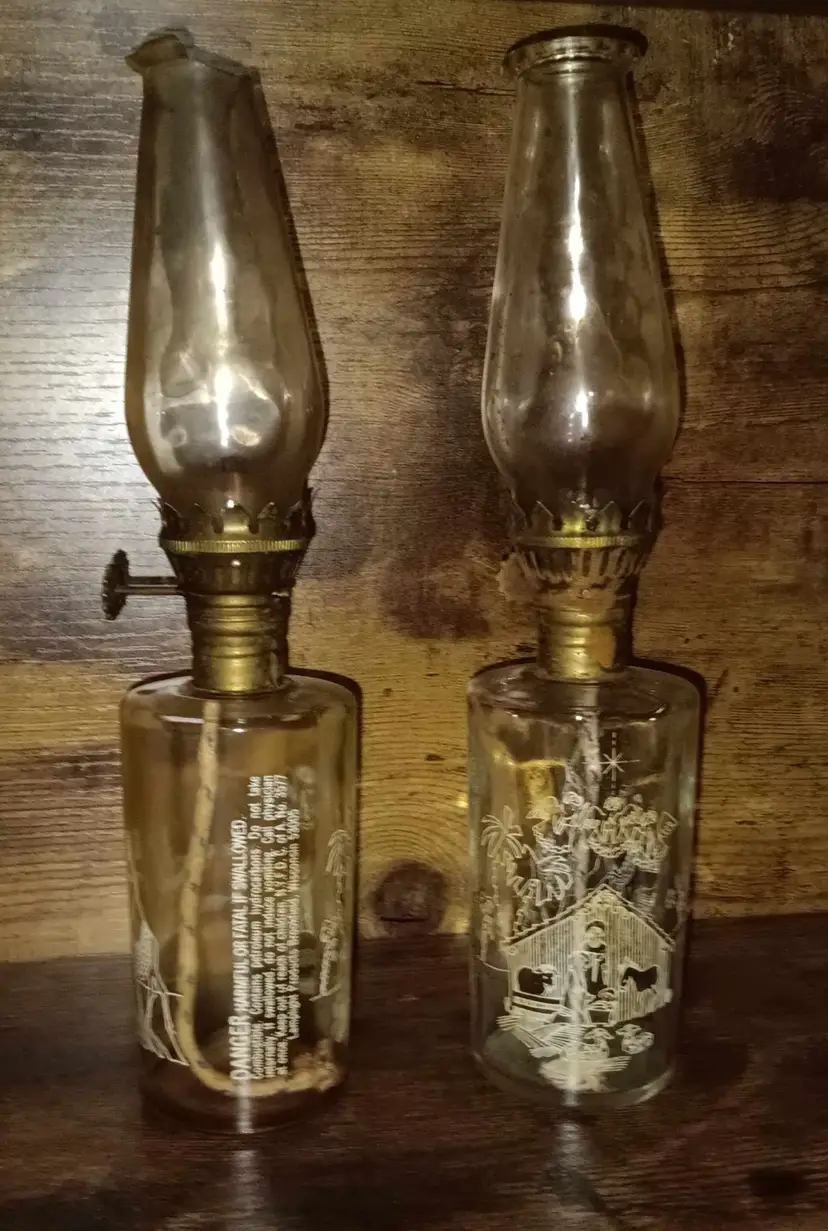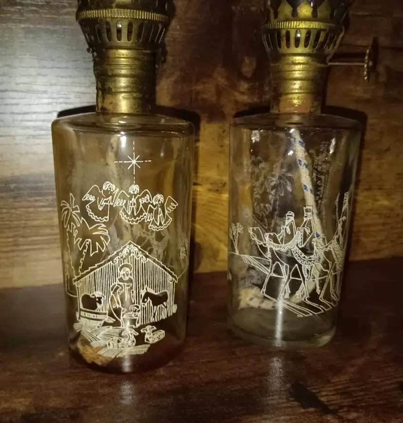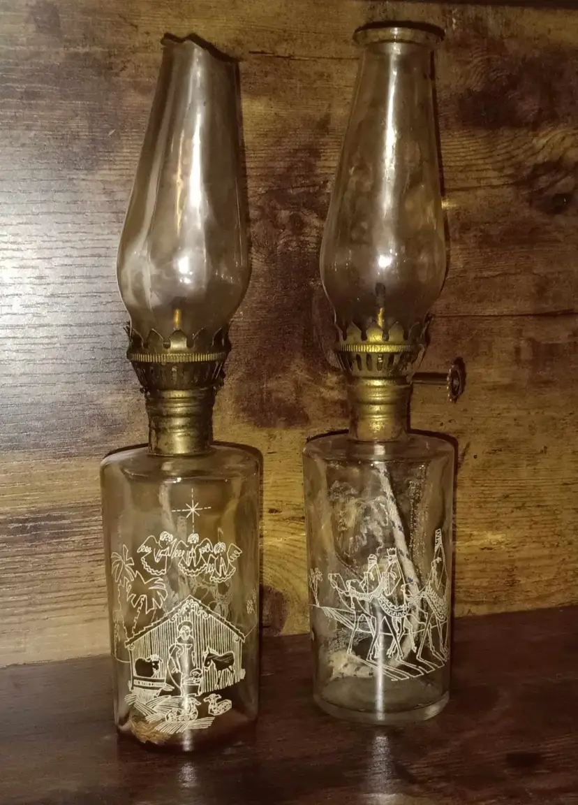Set of 2 matching oil lanterns. Features a beautiful nativity scene along the outside. Both are in working order with wicks intact. One of the globes on top has a chip, see photos. In good condition otherwise. The lantern measures 10 inches tall and the base is 2 inches across.
