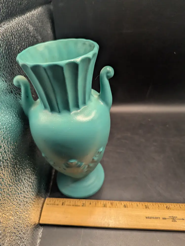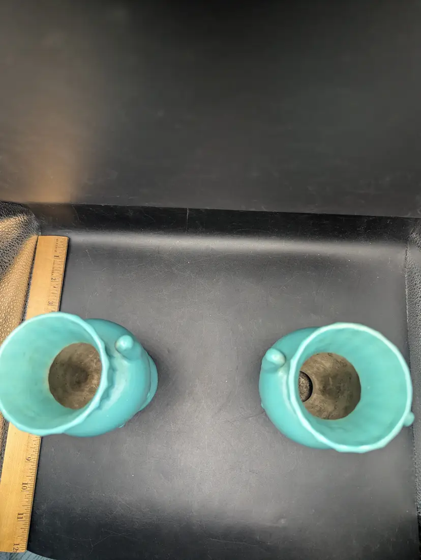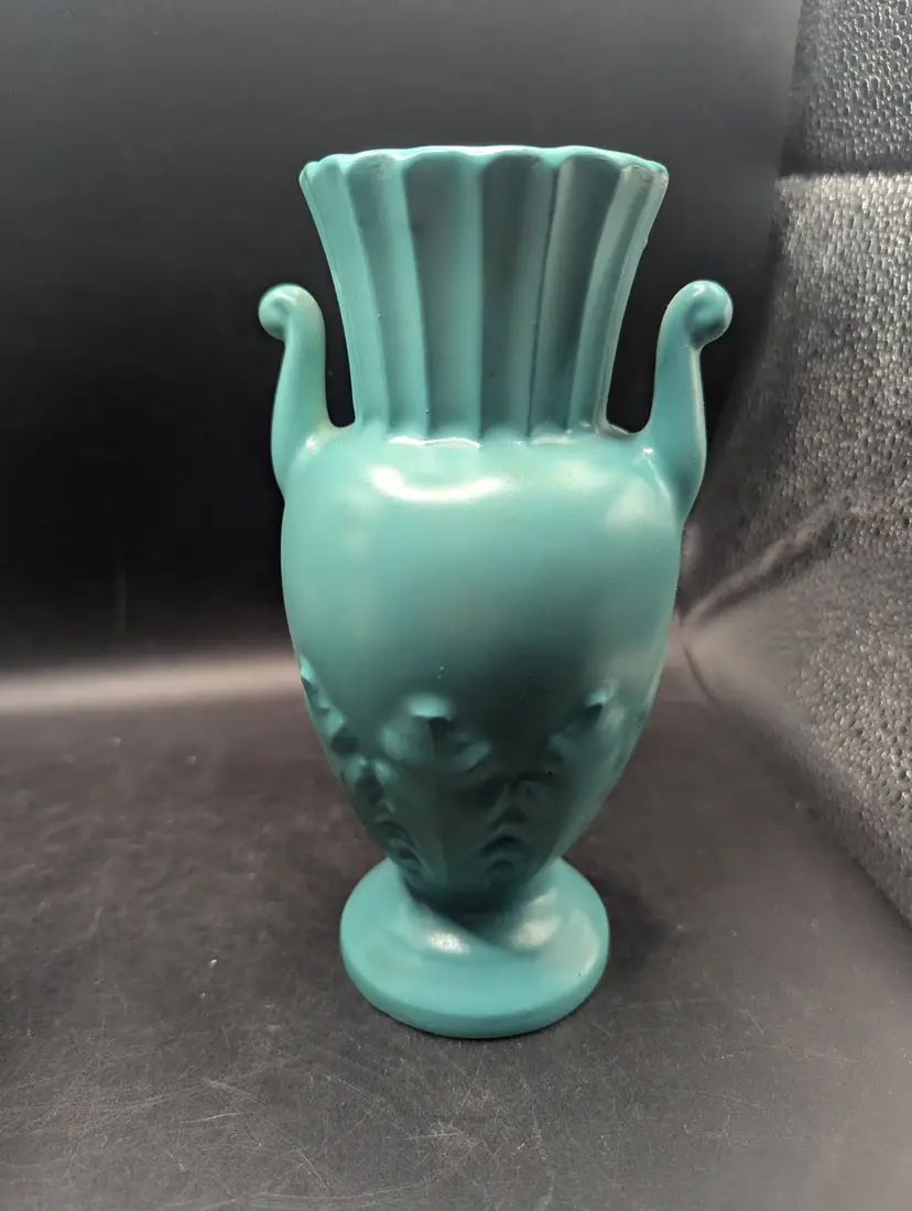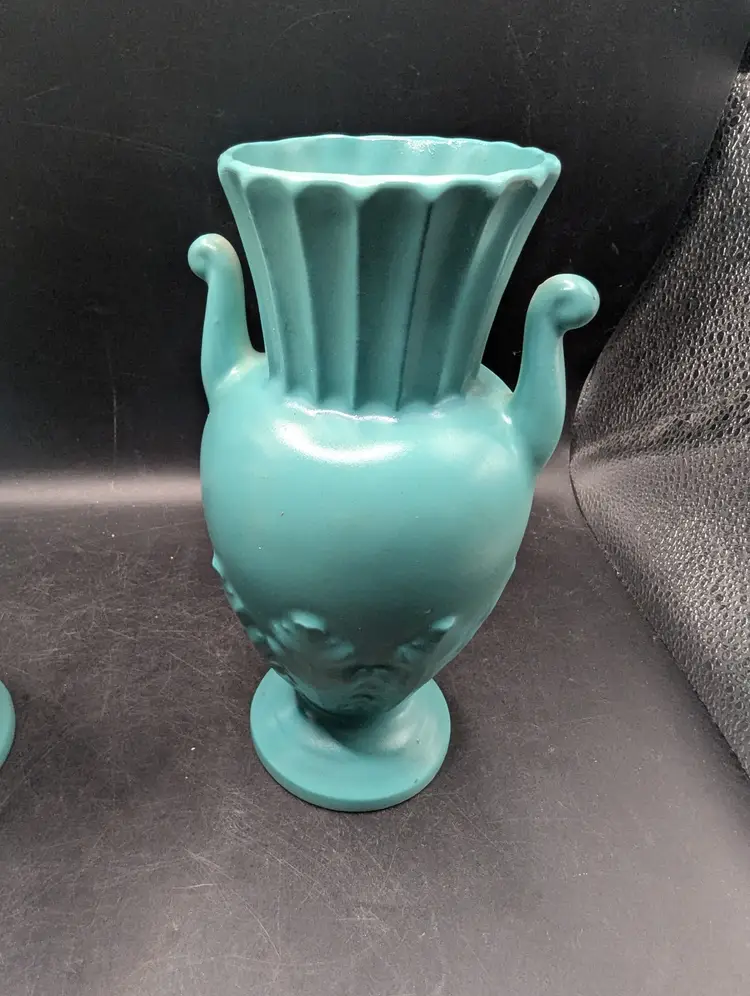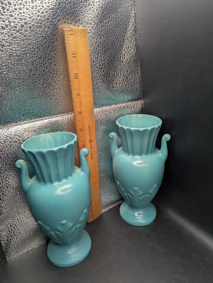 This is a stunning Vintage Set Of 2 Mid Century Art Deco Erphila Czechoslovakia Vases. They are done in a lovely turquoise glaze with a leaf design all the way around the belly of the vase and they have a ribbed neck with double handles. No chips or cracks. Please see all pictures for condition and measurements.