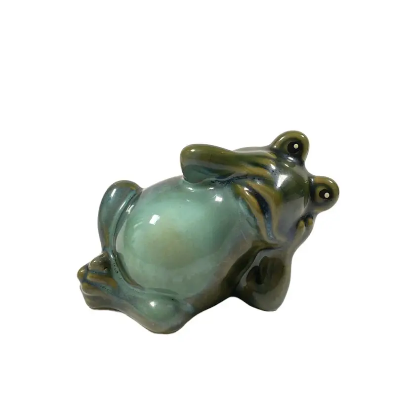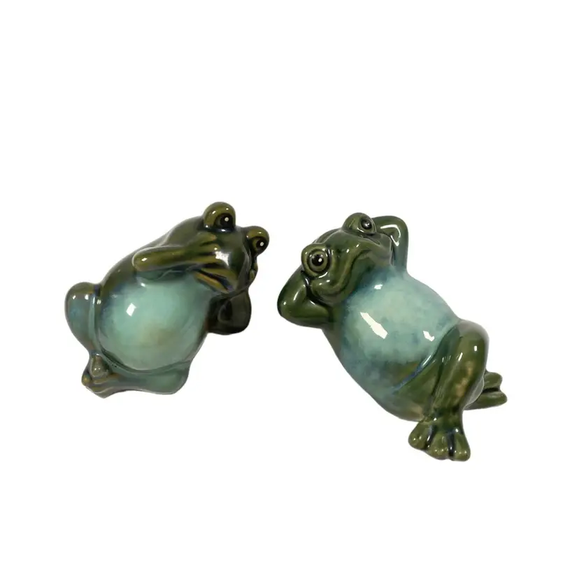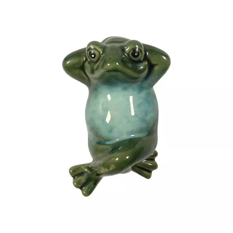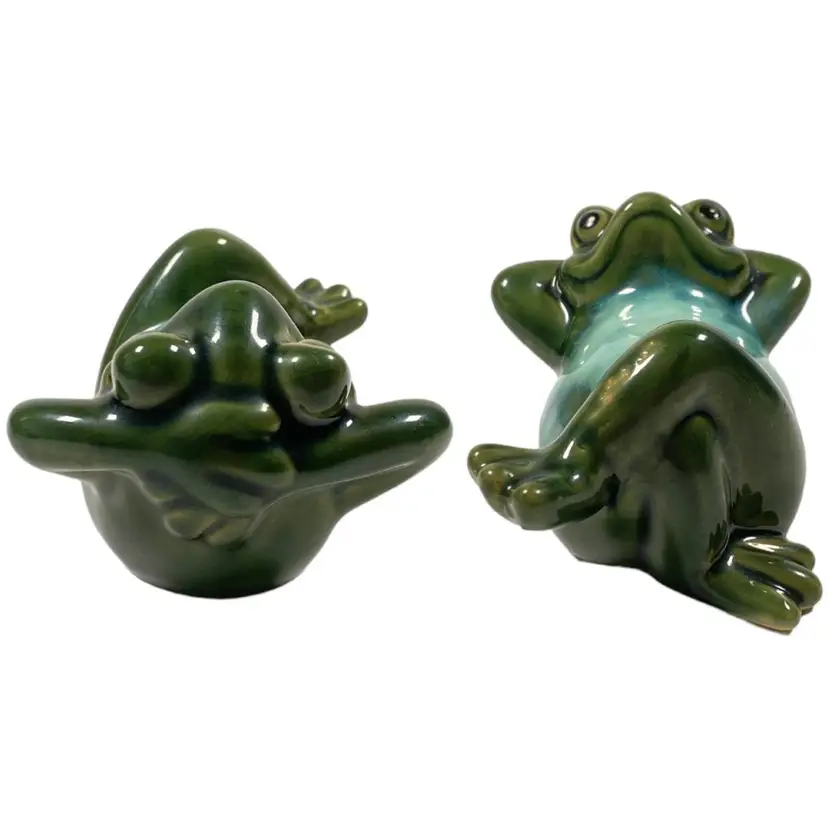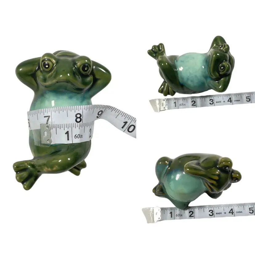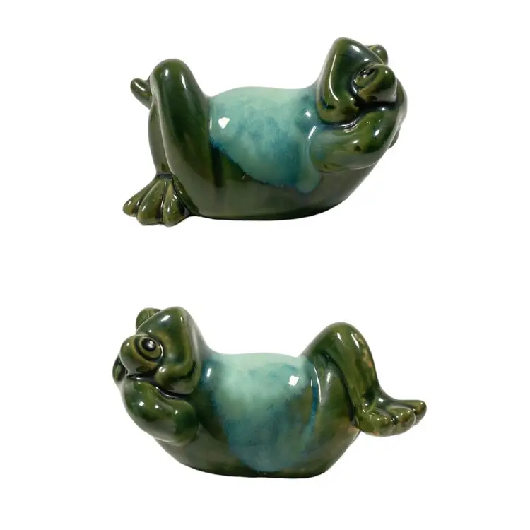 Add a playful and laid-back vibe to your space with this charming set of two ceramic frog figurines. Each frog is depicted in a relaxed, lounging pose with hands behind their head, showcasing delightful character and detail. Finished with a glossy green and aqua blue glaze, these figurines are perfect for frog lovers or as a fun addition to your home, garden shelf, or office decor.