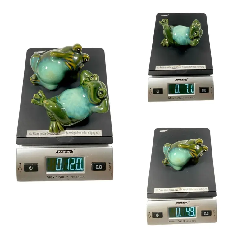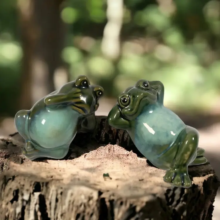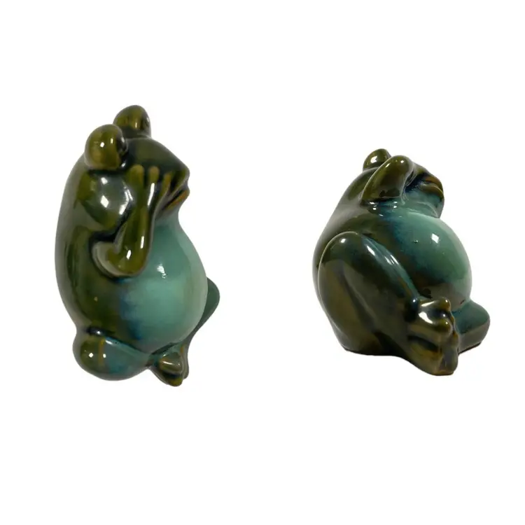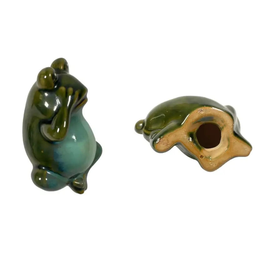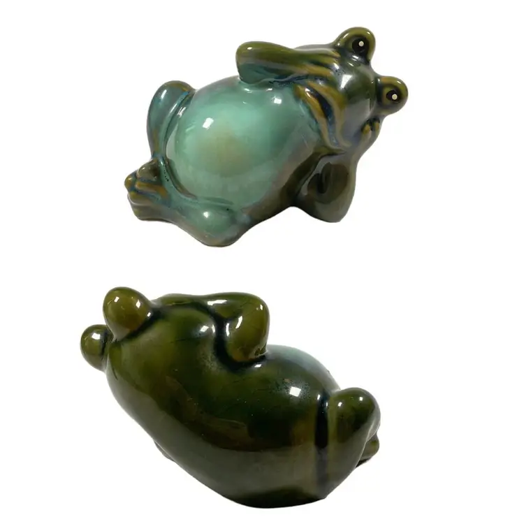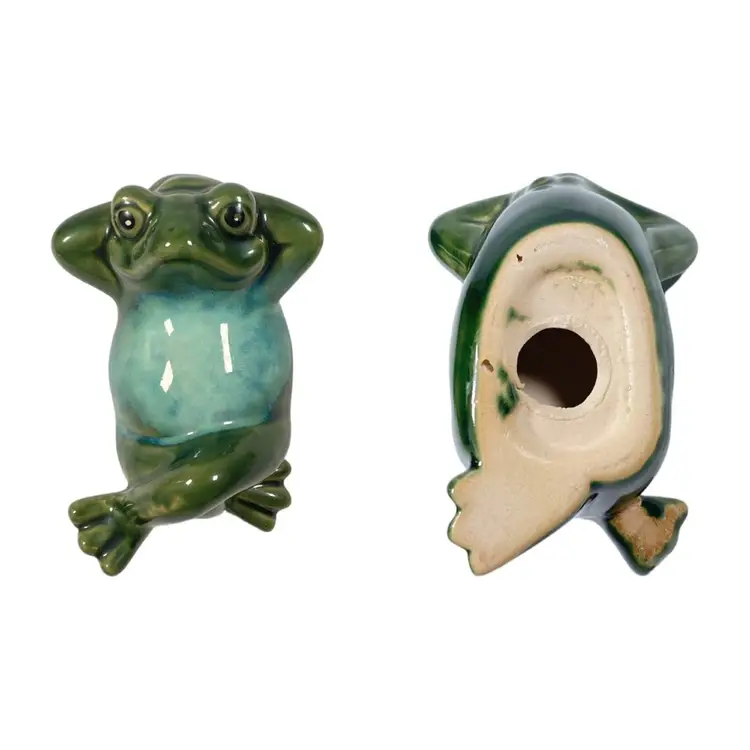 Add a playful and laid-back vibe to your space with this charming set of two ceramic frog figurines. Each frog is depicted in a relaxed, lounging pose with hands behind their head, showcasing delightful character and detail. Finished with a glossy green and aqua blue glaze, these figurines are perfect for frog lovers or as a fun addition to your home, garden shelf, or office decor.