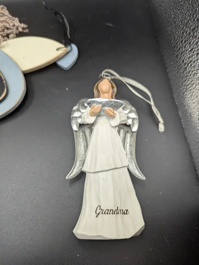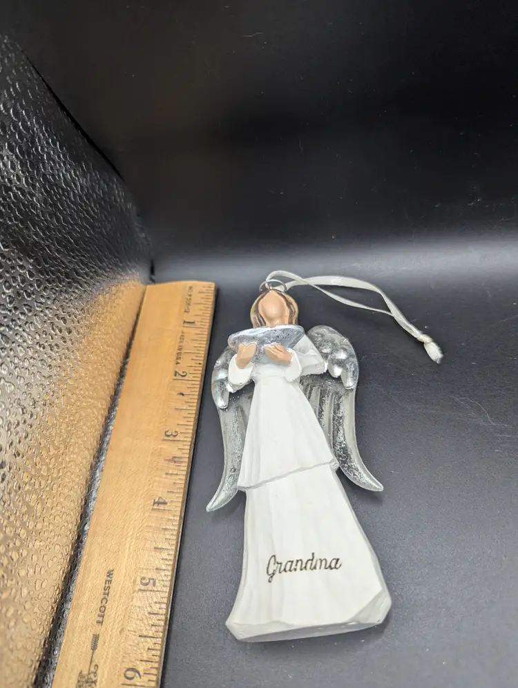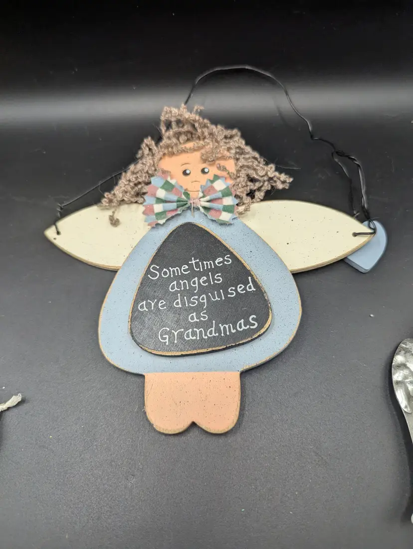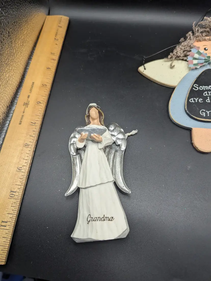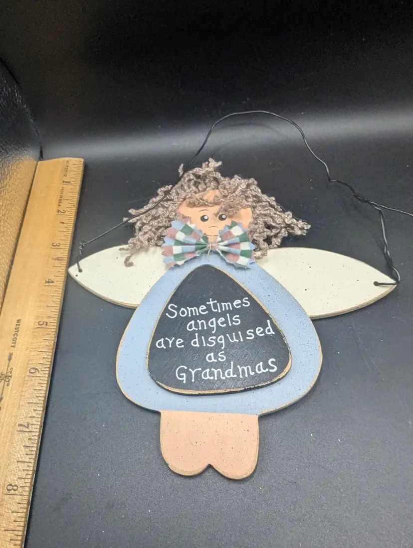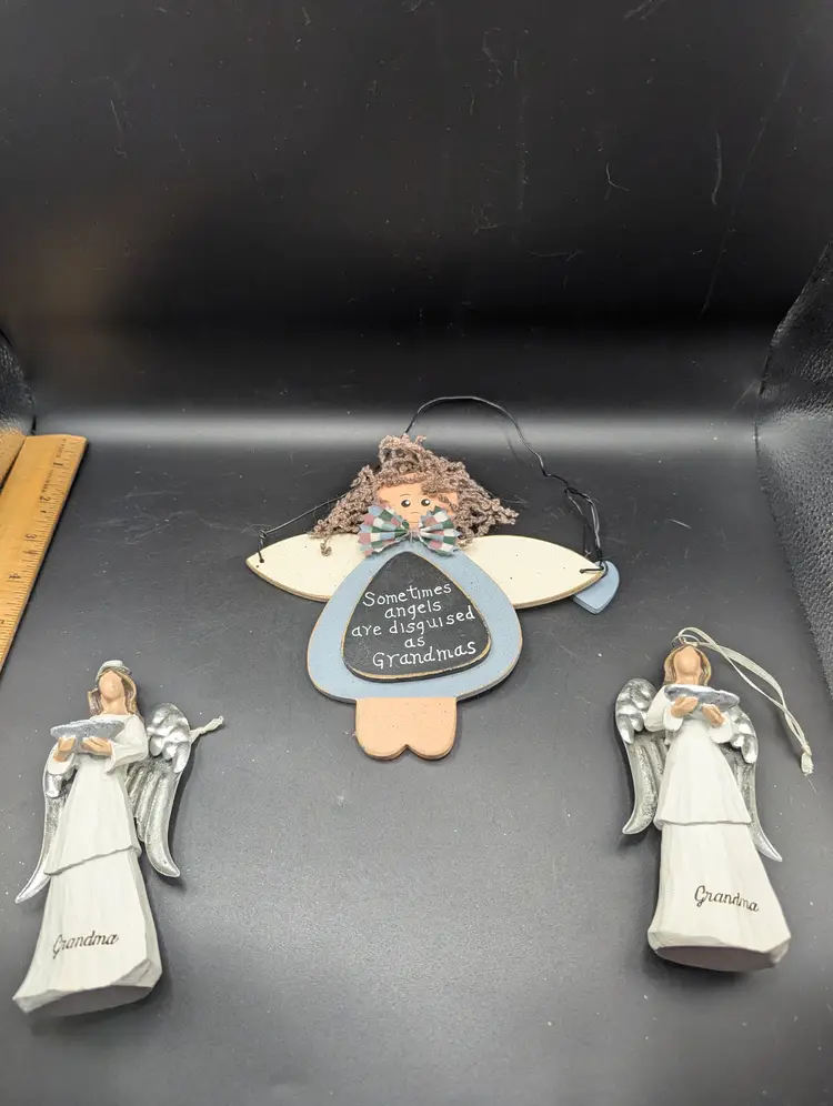 This is a great Vintage Set of 2 St Nicholas Square Grandma Angel Christmas Figure Ornament and One Wooden Grandma Ornament. The one St Nicholas ornament does have a repair as seen in last photo. Please see all pictures for condition and measurements.