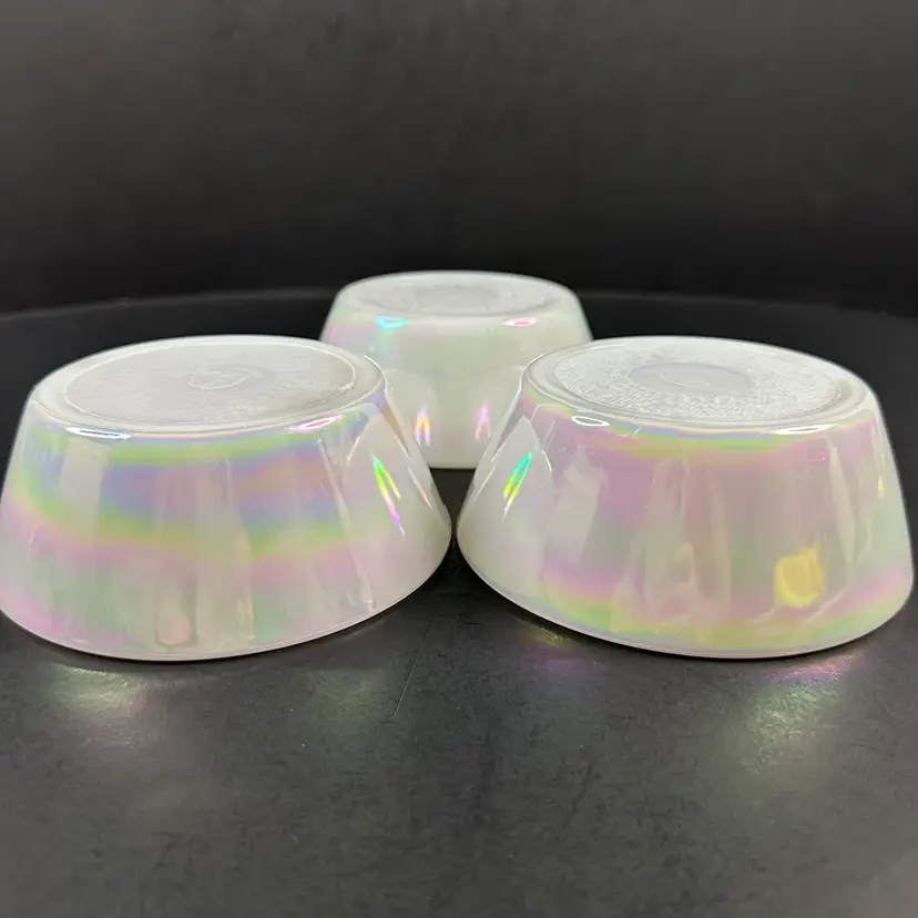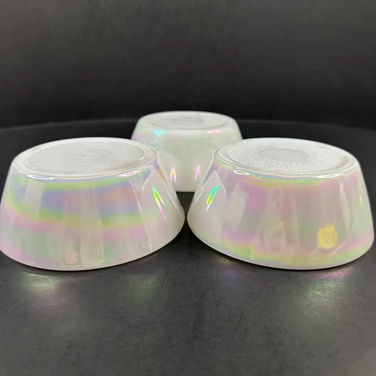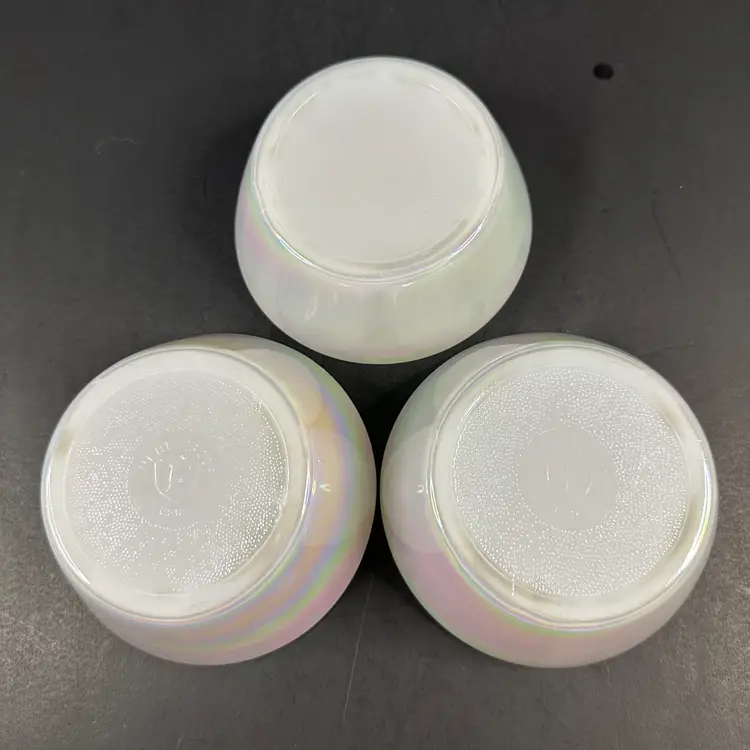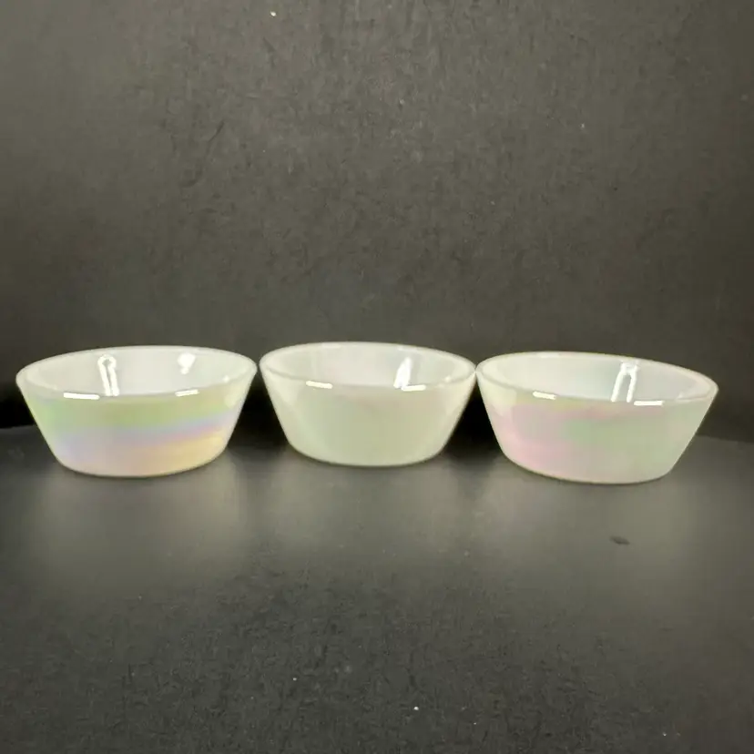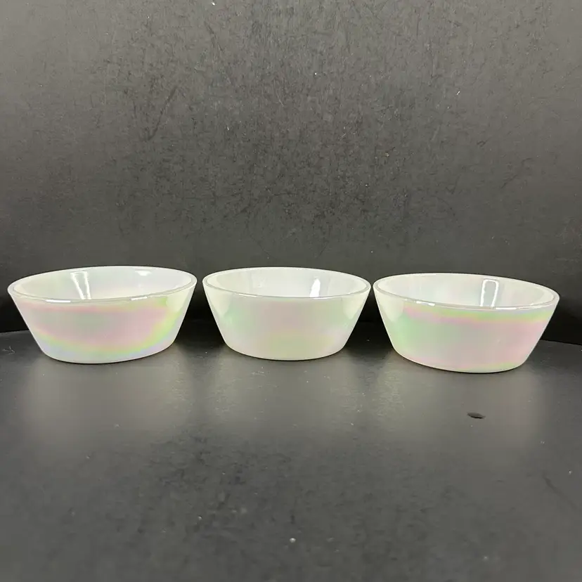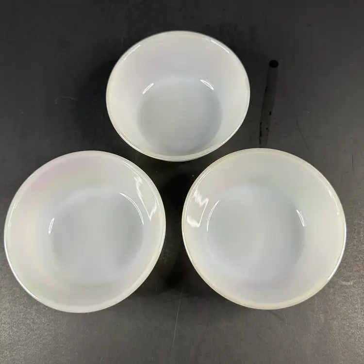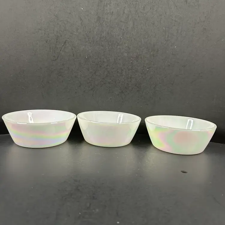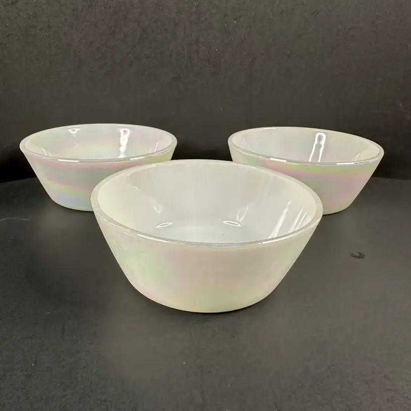 Vintage Set of 3 Federal Glass Moonglow Iridescent Pearl 5" Cereal Bowls in good preowned condition. Each of these bowls stand approximately 2 inches tall with a diameter of 5 inches. No chips, nicks or cracks. Please see photos for all the details.