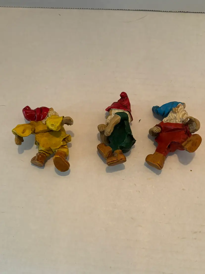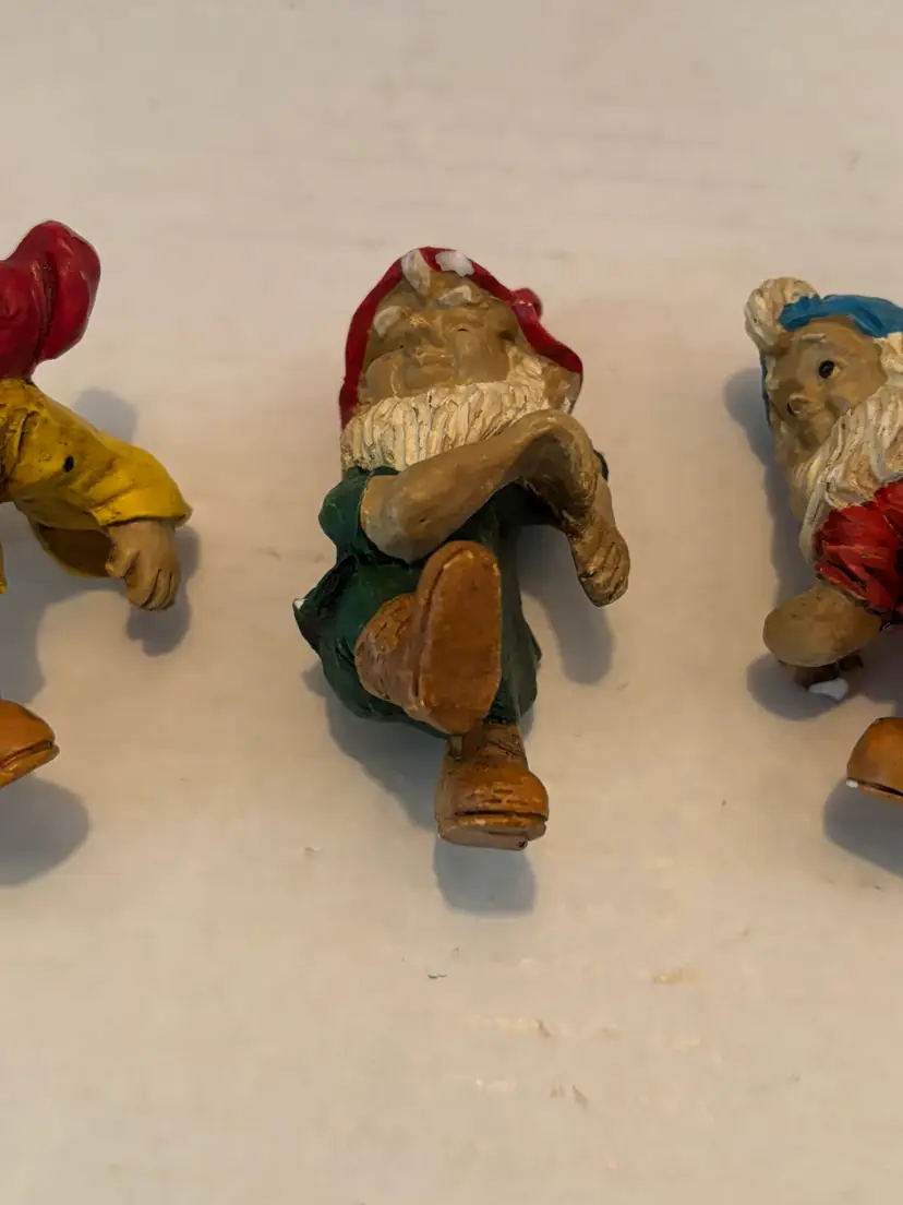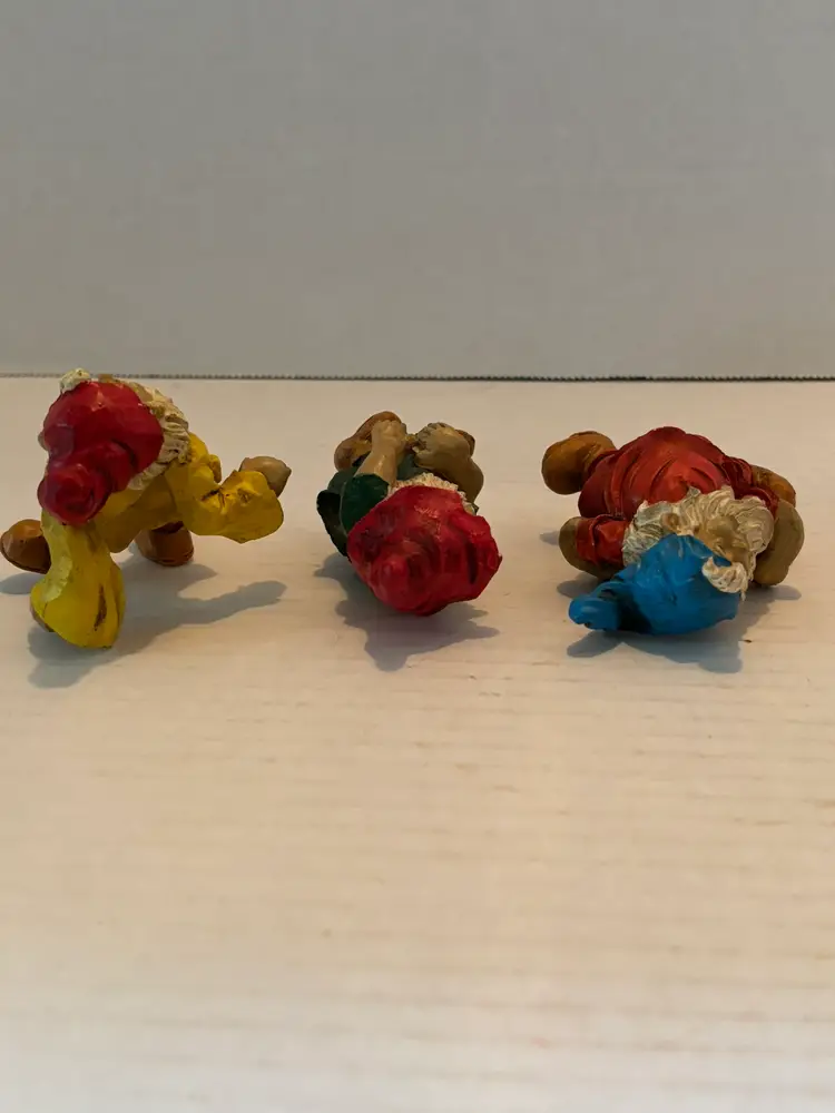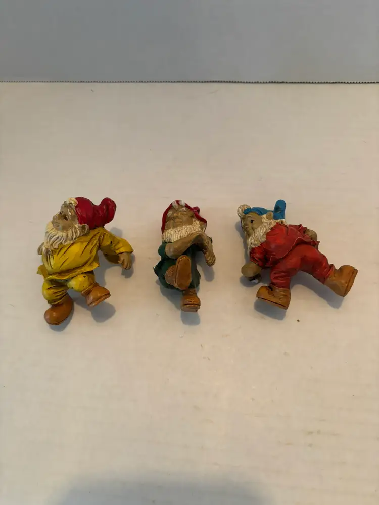This vintage set of 3 gnome figurine hangers-on is a charming addition to any fantasy-themed collection. The green, yellow, and red resin figurines feature gnome-like characters that will bring a touch of whimsy to any space. These unbranded figurines are a unique find for collectors of elves, gnomes, and pixies, adding a magical touch to their display. Perfect for fans of fantasy and mythical creatures, these figurines are sure to delight with their unique design and vibrant colors. 2 of them have some small chips....SEE PICTURE FOR DETAILS