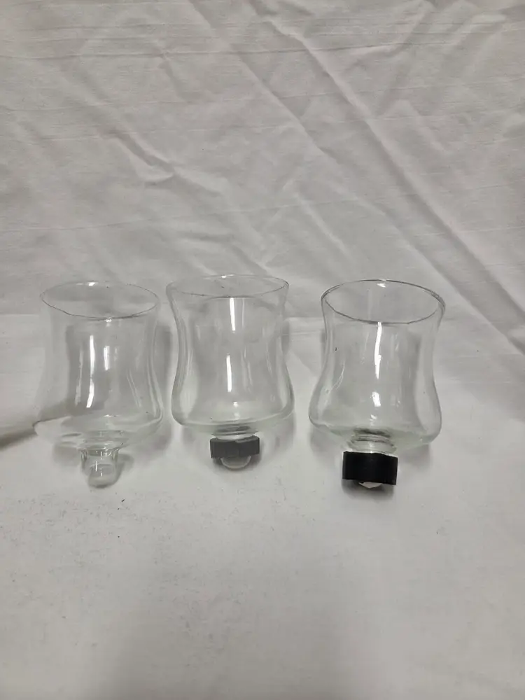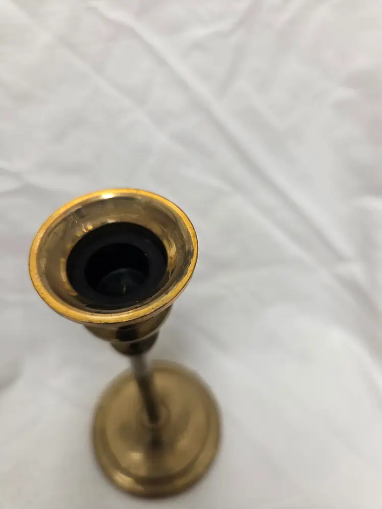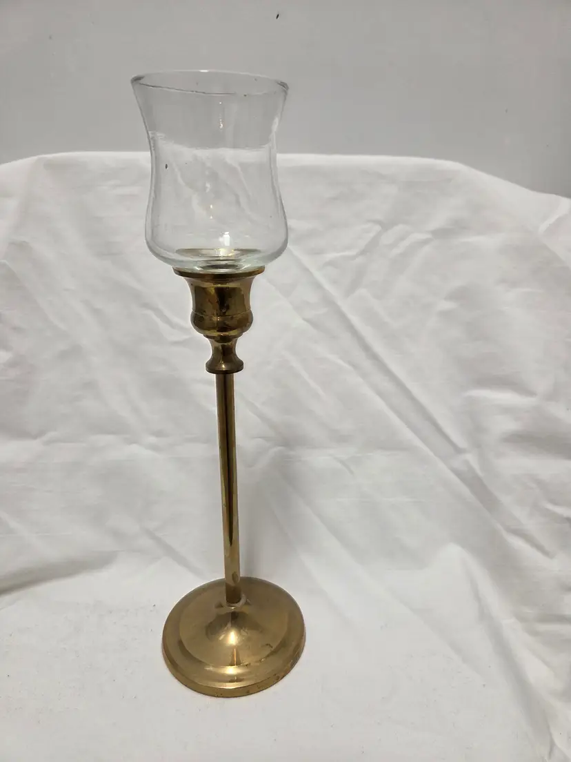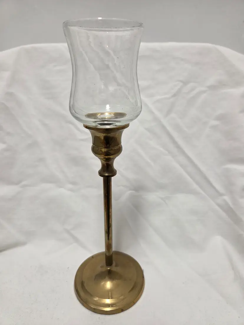 Vintage set of 3 graduated brass candle holders with globes. Vandle holders will need some polishing to be shiny and you might want to replace the rubber rings that hold in the globes. Candle holders lengths without globes 7", 8", and 9".
