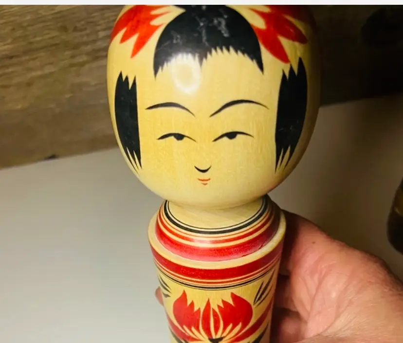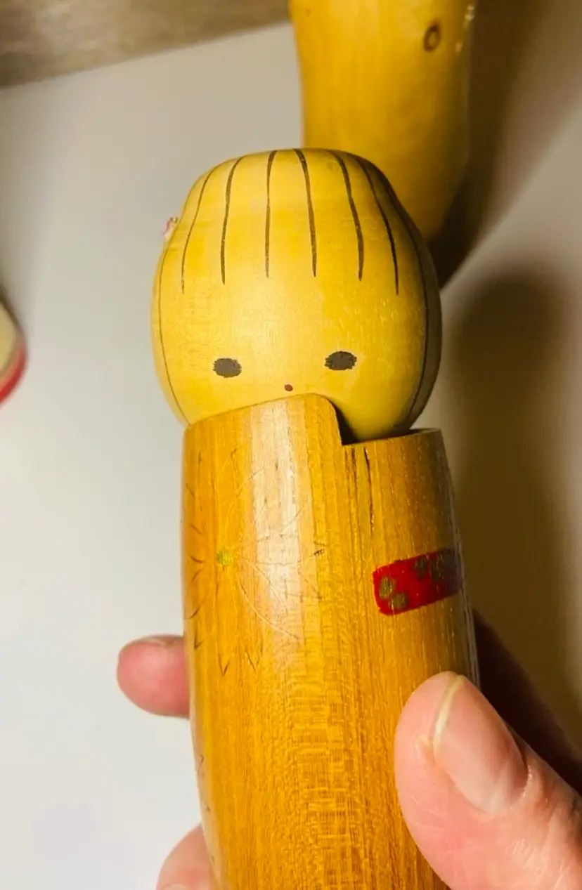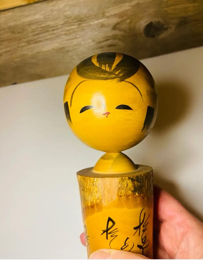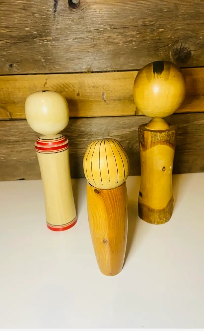 Set of 3 Kokeshi dolls, small, medium and large. Kokeshi dolls are cherished folk toys with a rich history, believed to date back to the Edo period (early 19th century). Originally crafted as souvenirs for hot spring visitors, these dolls were made from local wood by artisans who also produced bowls and utensils. The medium and small are signed on the bottom. The small one looks as if there is something broken off her head (see pic). Otherwise all are in good used condition.