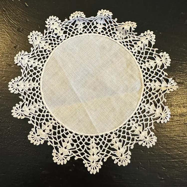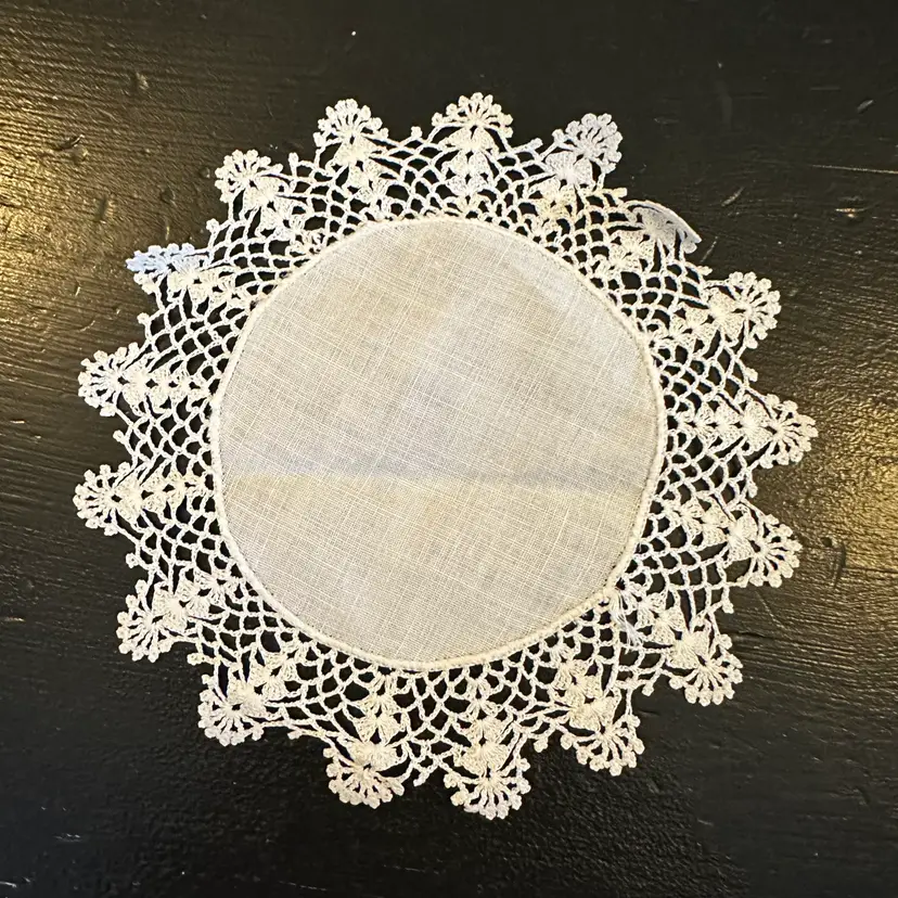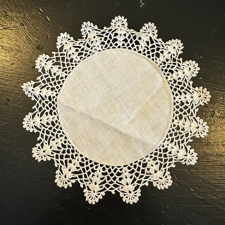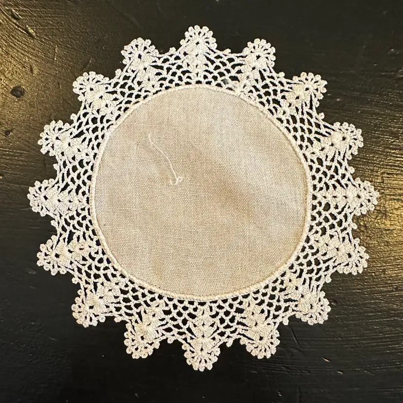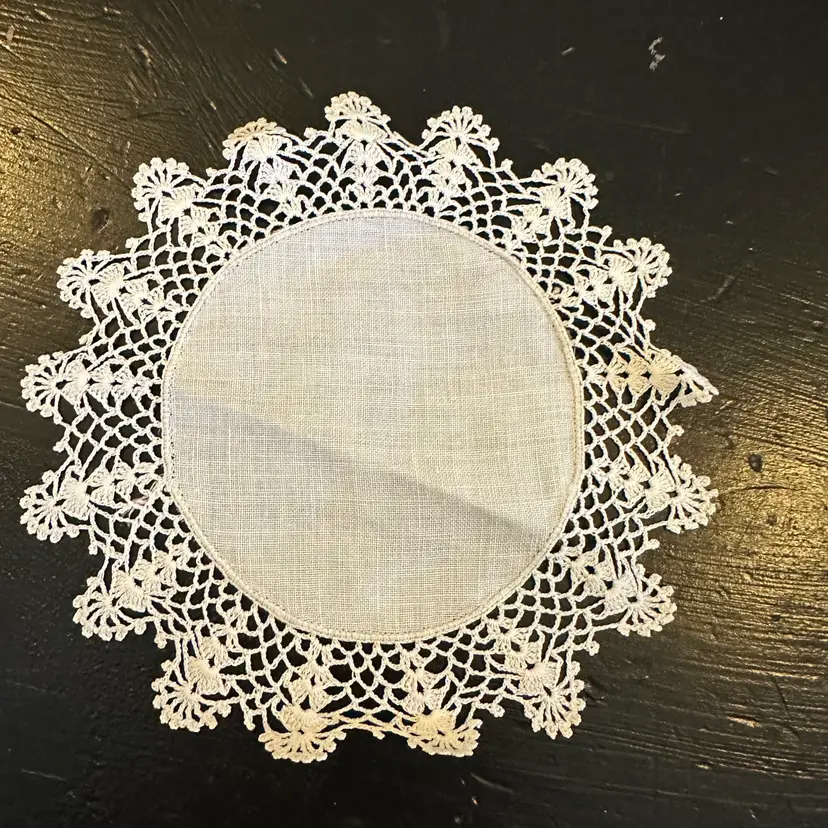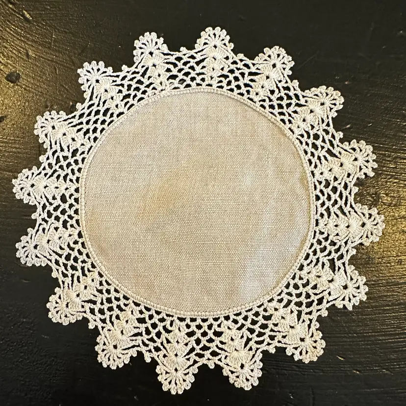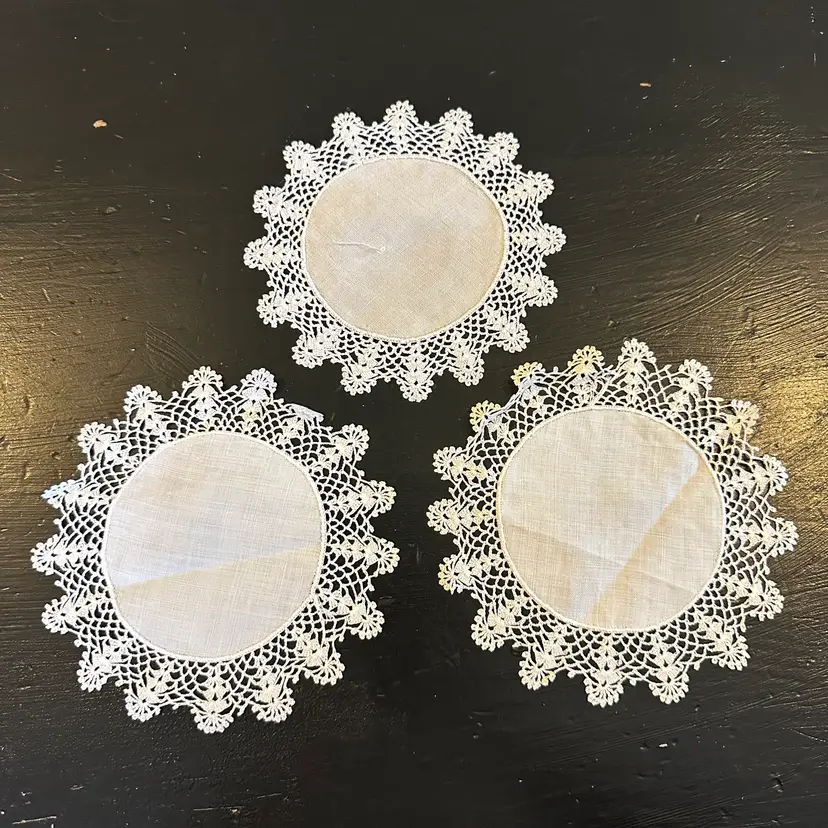 Vintage Set of 3 Matching Linen Centered Hand Crocheted Lace Edged Doilies #47 in good preowned condition. All three doilies have a diameter of approximately 6.75 inches. No tears but some yellowing and staining, stain removal was not attempted. Please see photos for all the details.