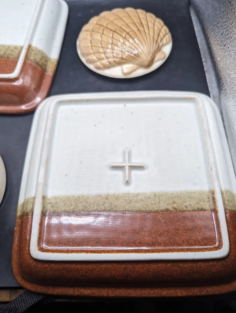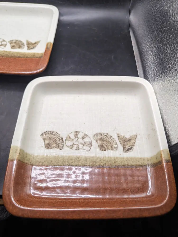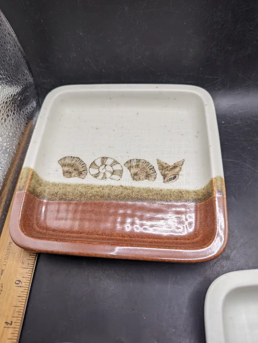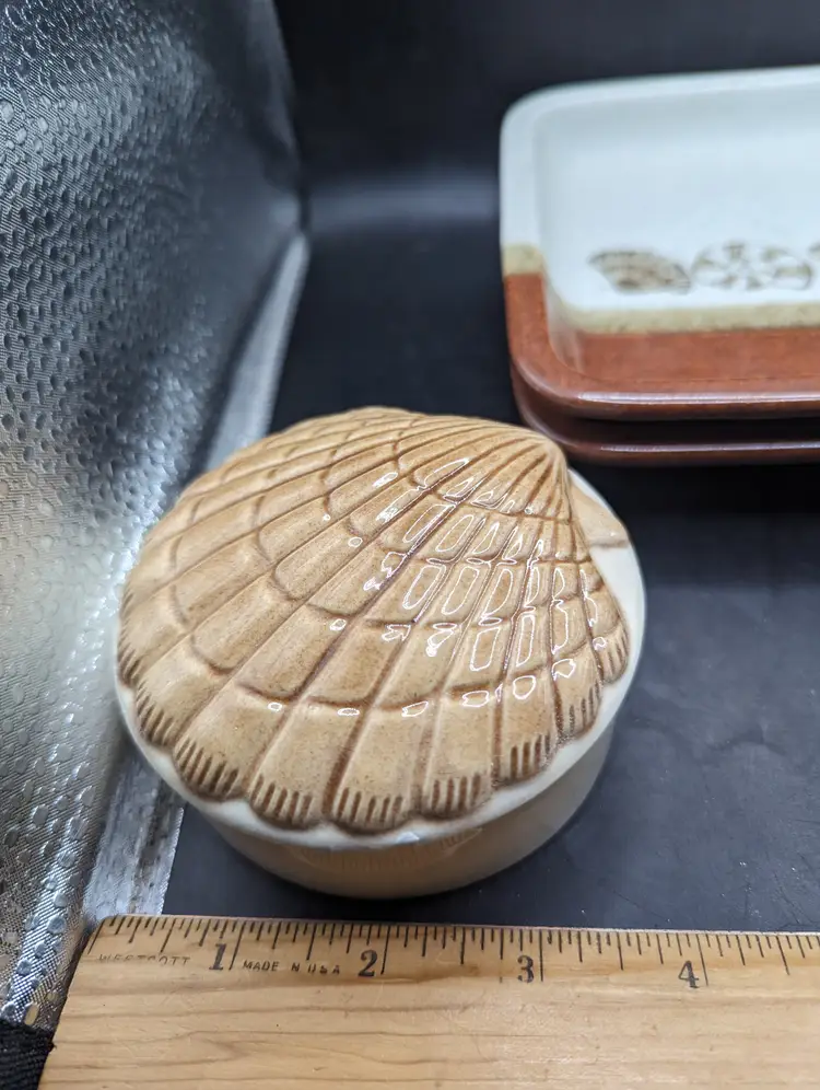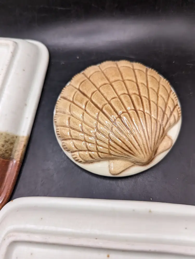 This is a lovely Vintage Set of 3 Nautical Design Trinket/Snack Dishes and Shell Trinket Box. The Trinket box has a small chip on the underside of the lid as seen in picture. Please see all pictures for condition and measurements.