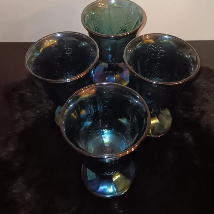 Vintage Set of 4 Blue Carnival Glass Wine Glasses Water Goblets Grape Pattern
