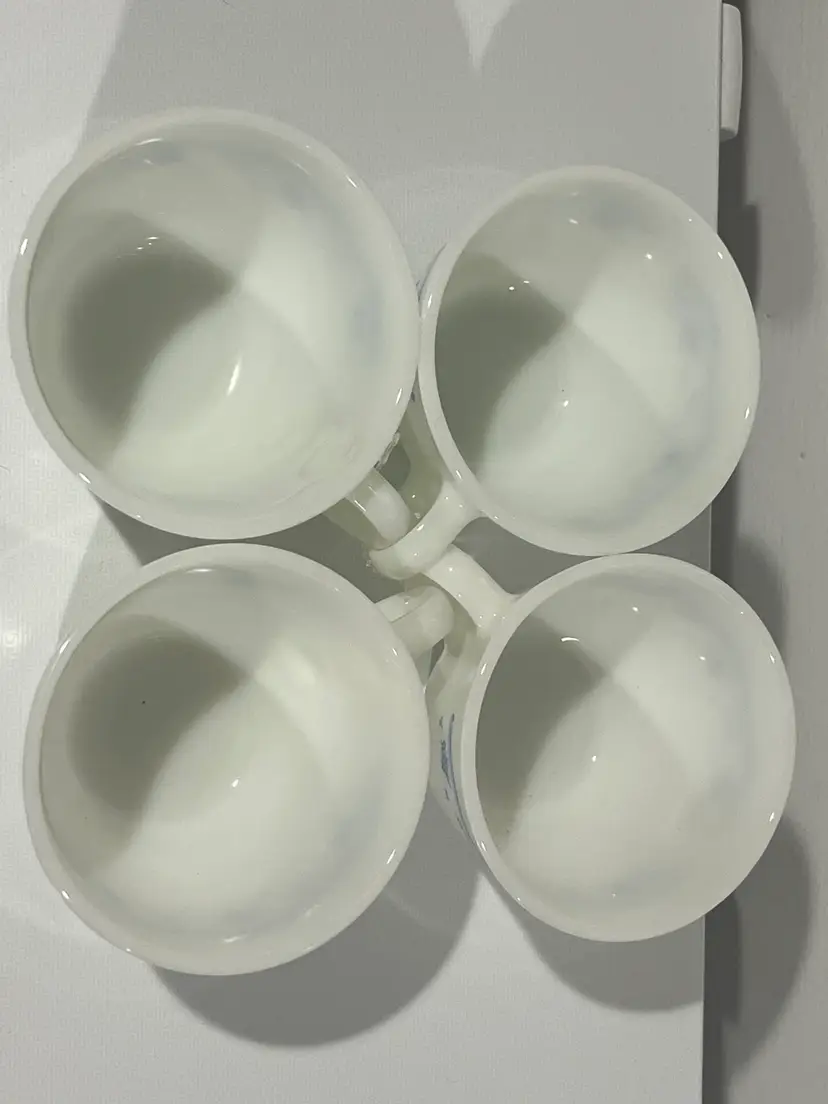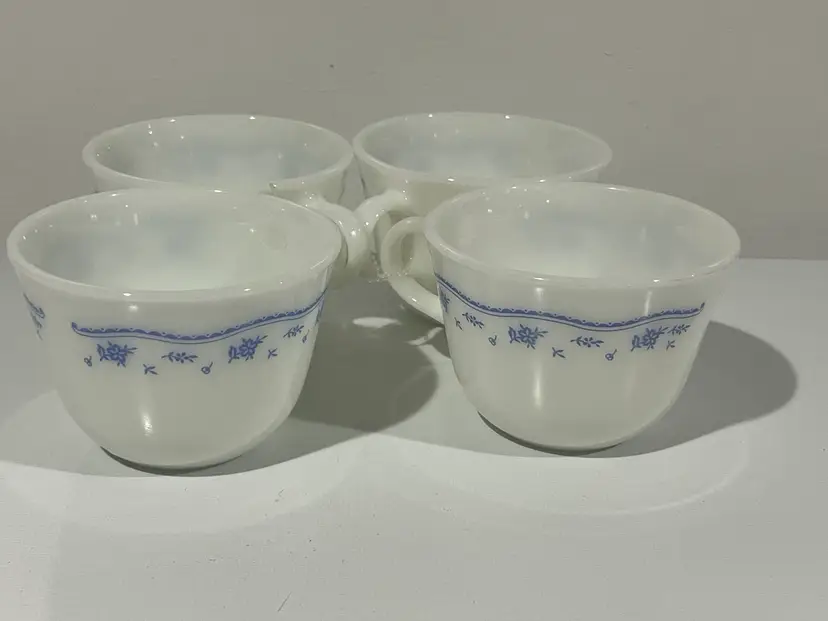 Vintage Set Of 4 Corning Ware Morning Blue Floral Milk Glass Tea Cups. Great condition no chips no discoloring.