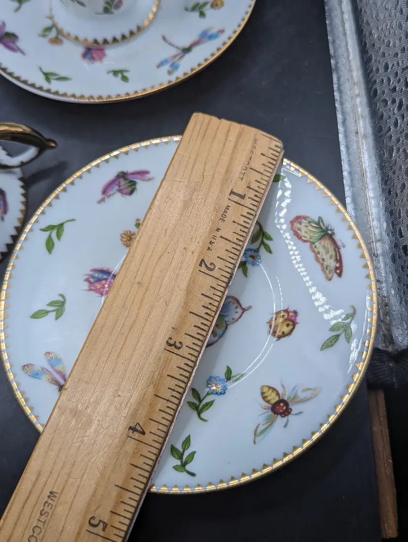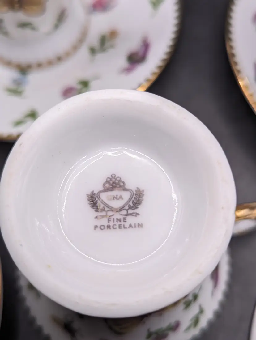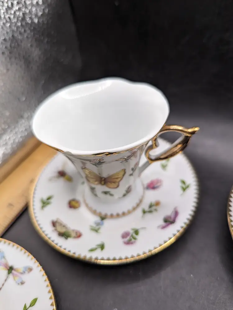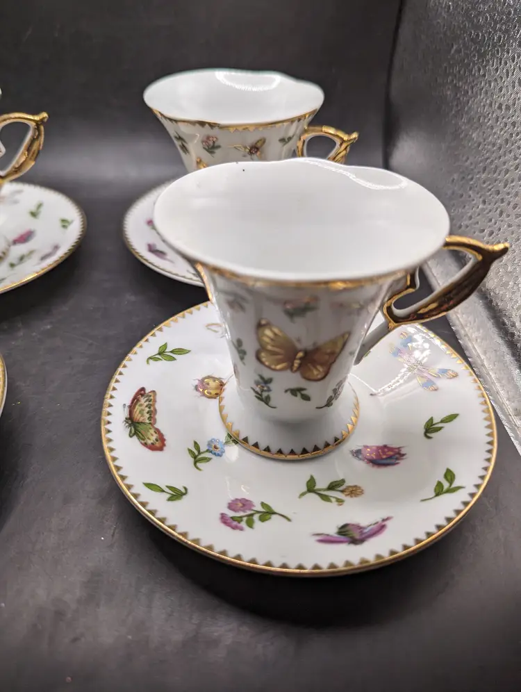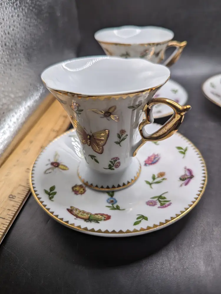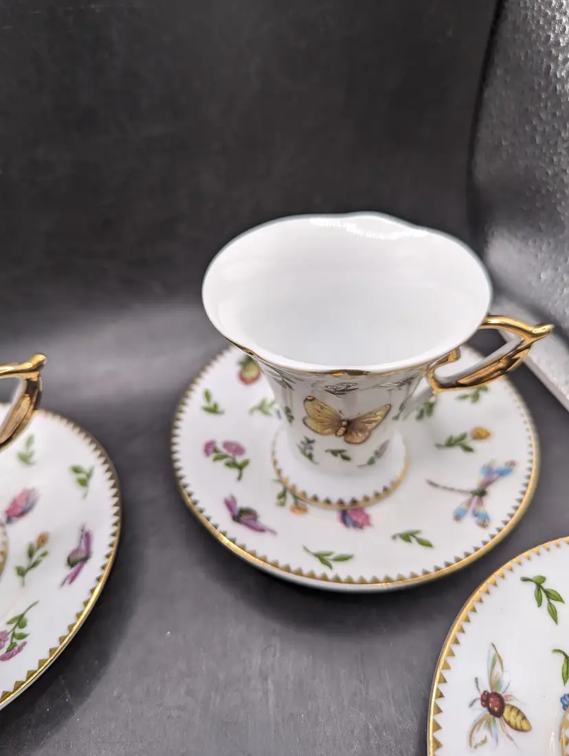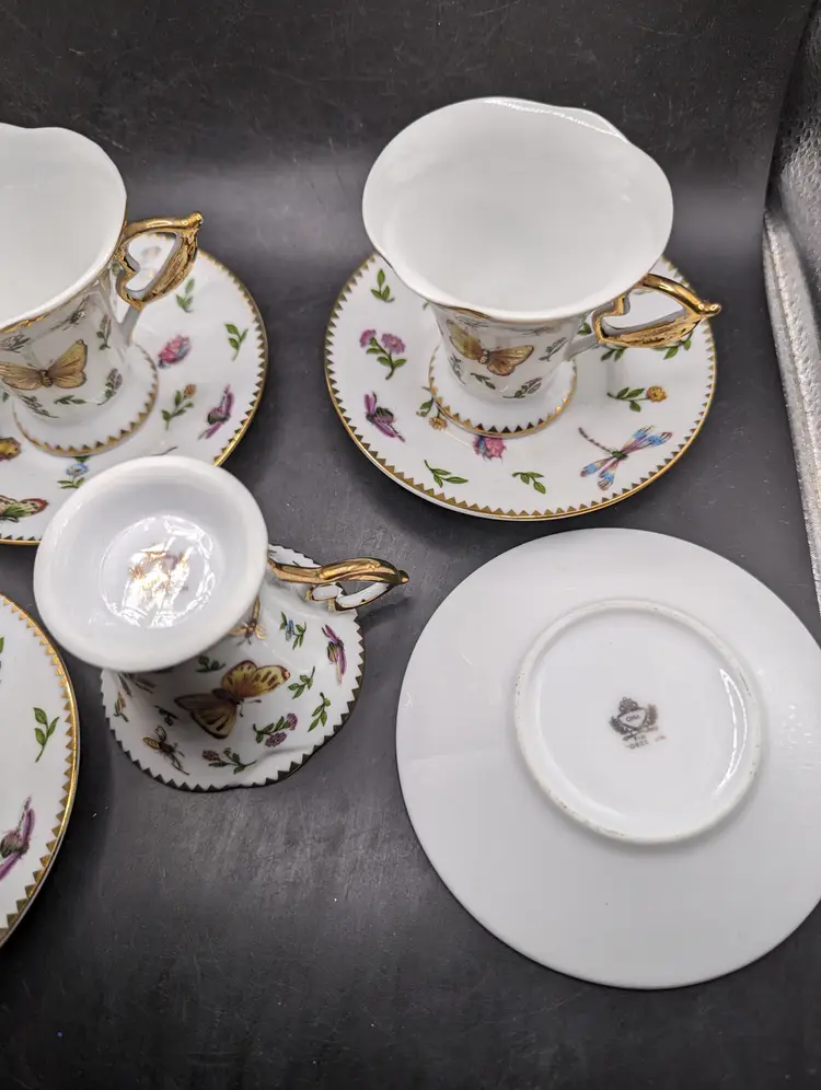 This is a stunning Vintage Set of 4 GNA Demitasse Butterflies, Bees, and Flowers Design With Gold Trim. One cup does have a tiny chip as seen in last picture. Please see all pictures for condition and measurements.