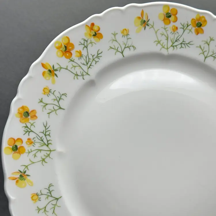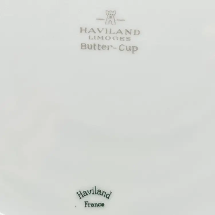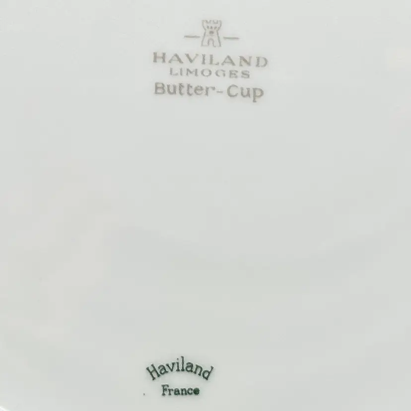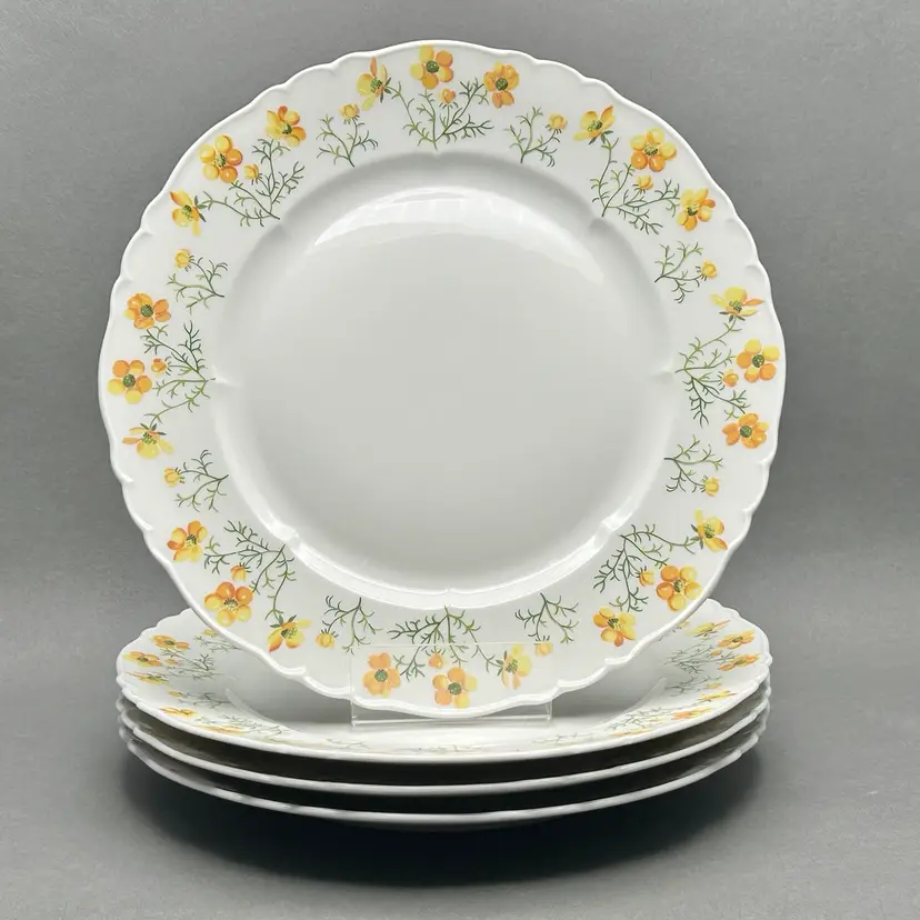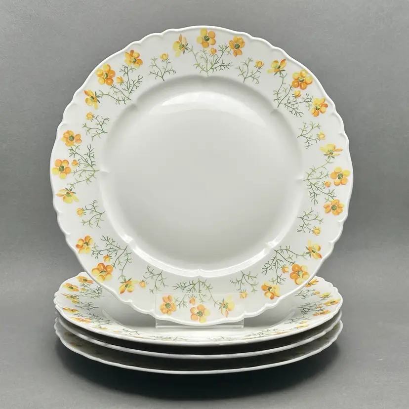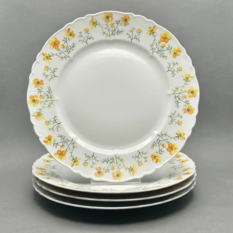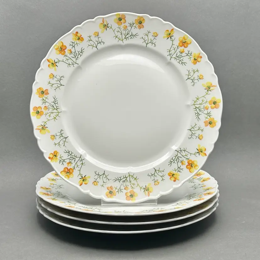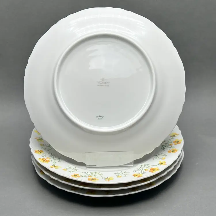 Vintage set of 4 Haviland Limoges France “Butter-cup” hand painted dinner plates. They are white porcelain with a border of yellow Butter-cup flowers.