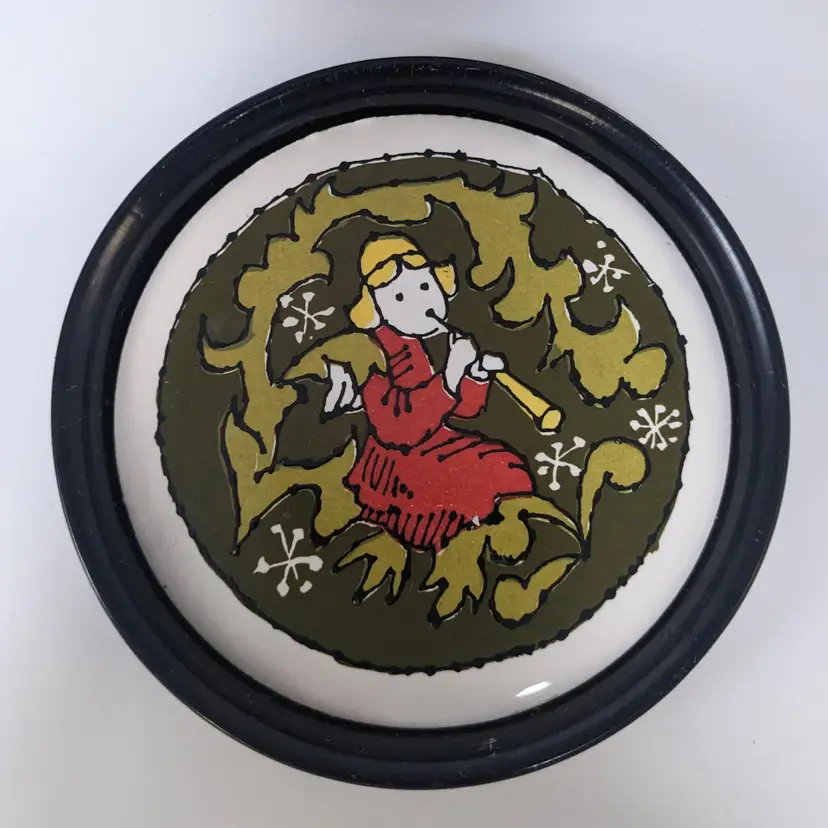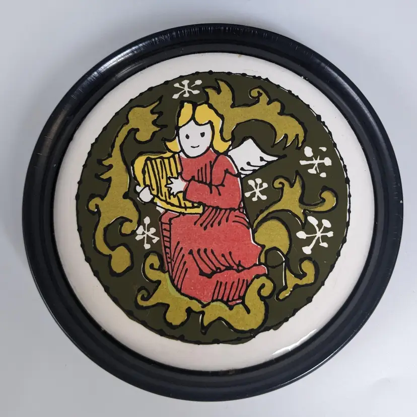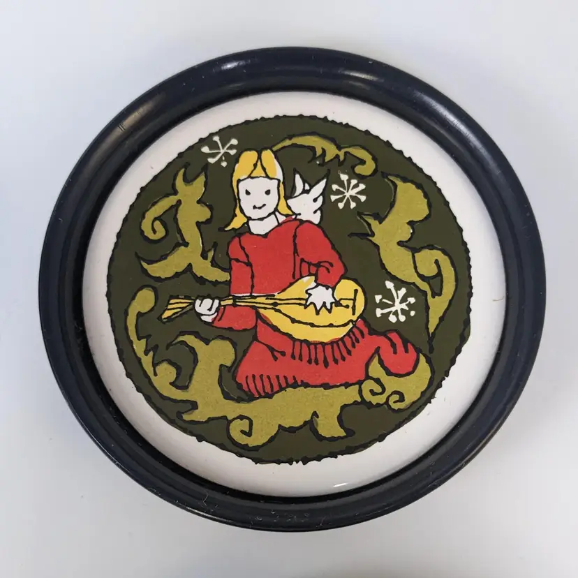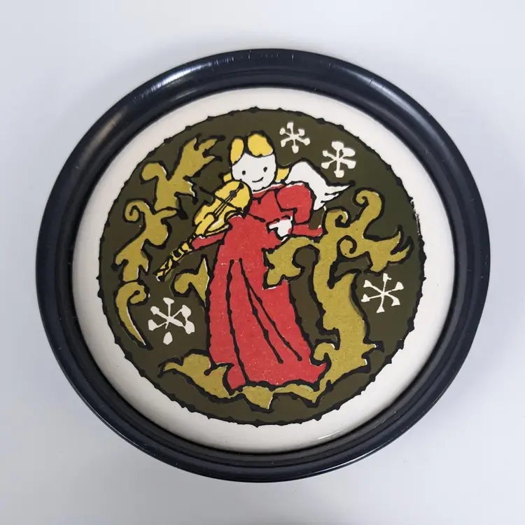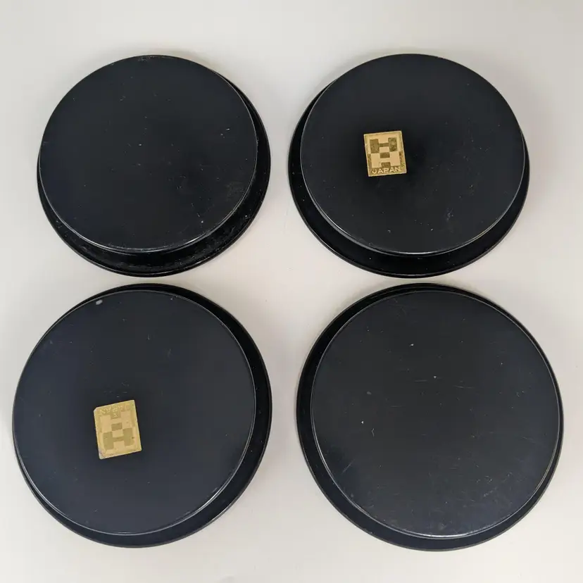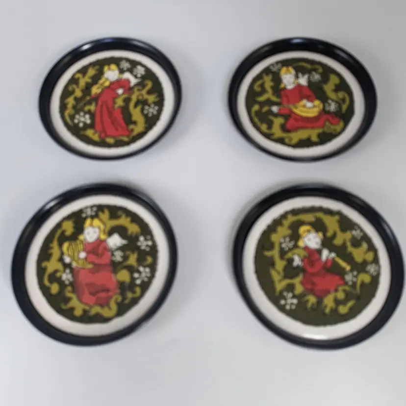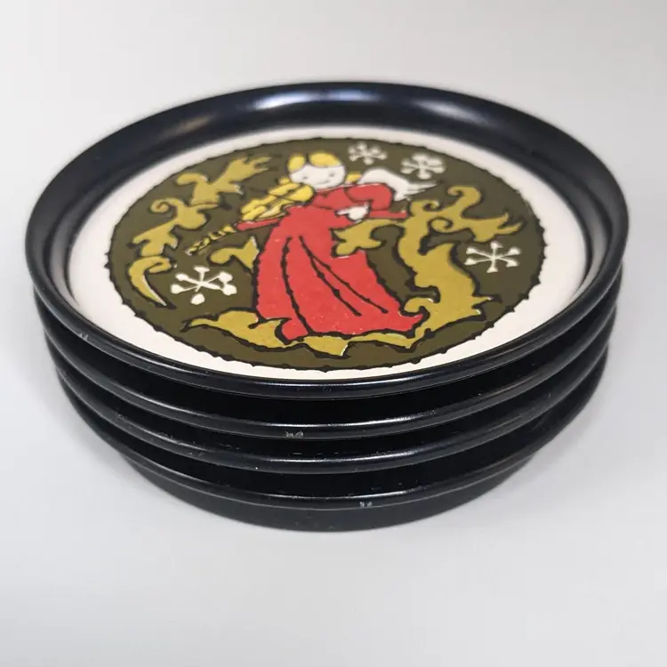 The coasters have metal rims with a ceramic tile insert. Light wear consistent with previous use and age. (2) of the coasters have gold Holt Howard stickers, as shown in picture #7. No cracks, breaks or repairs. Shipped with USPS Ground Advantage.