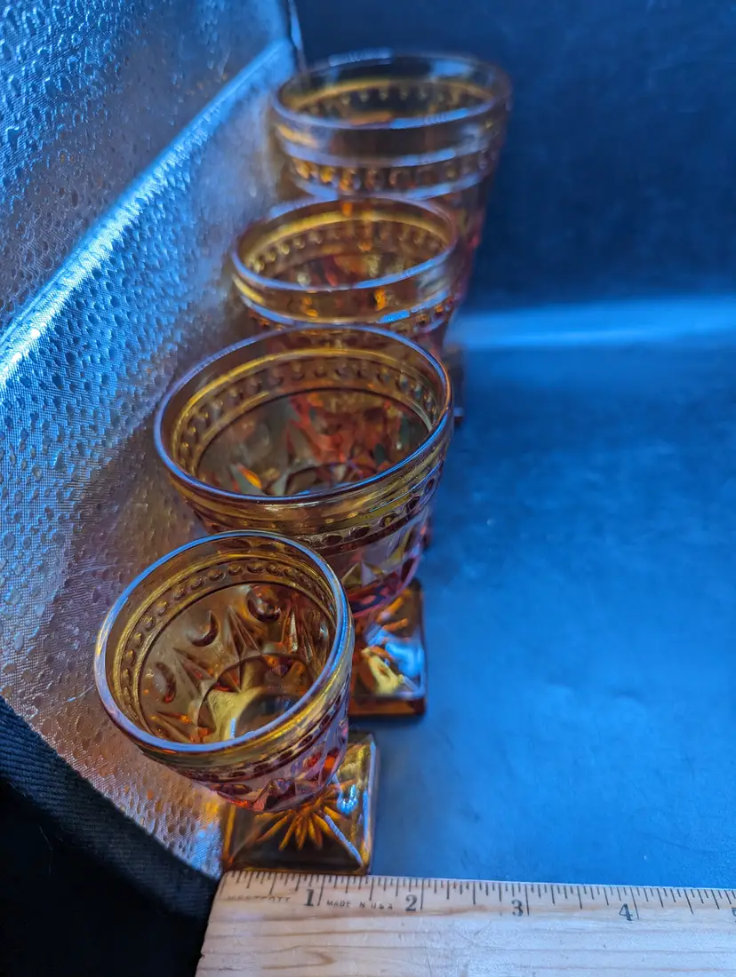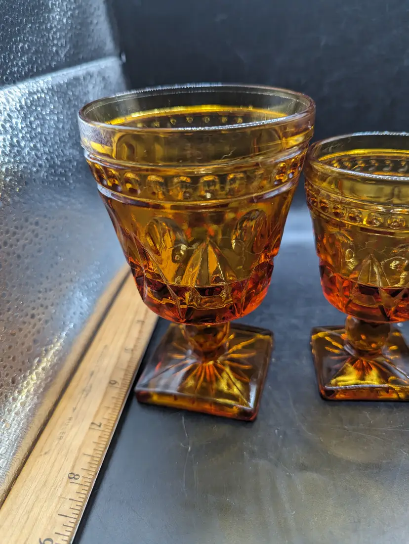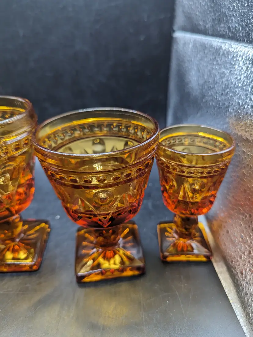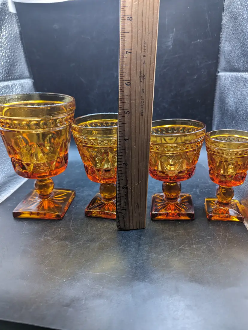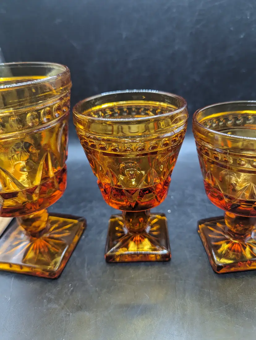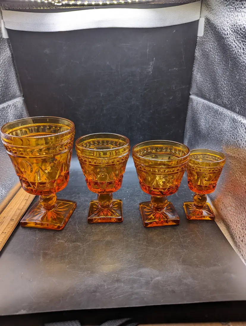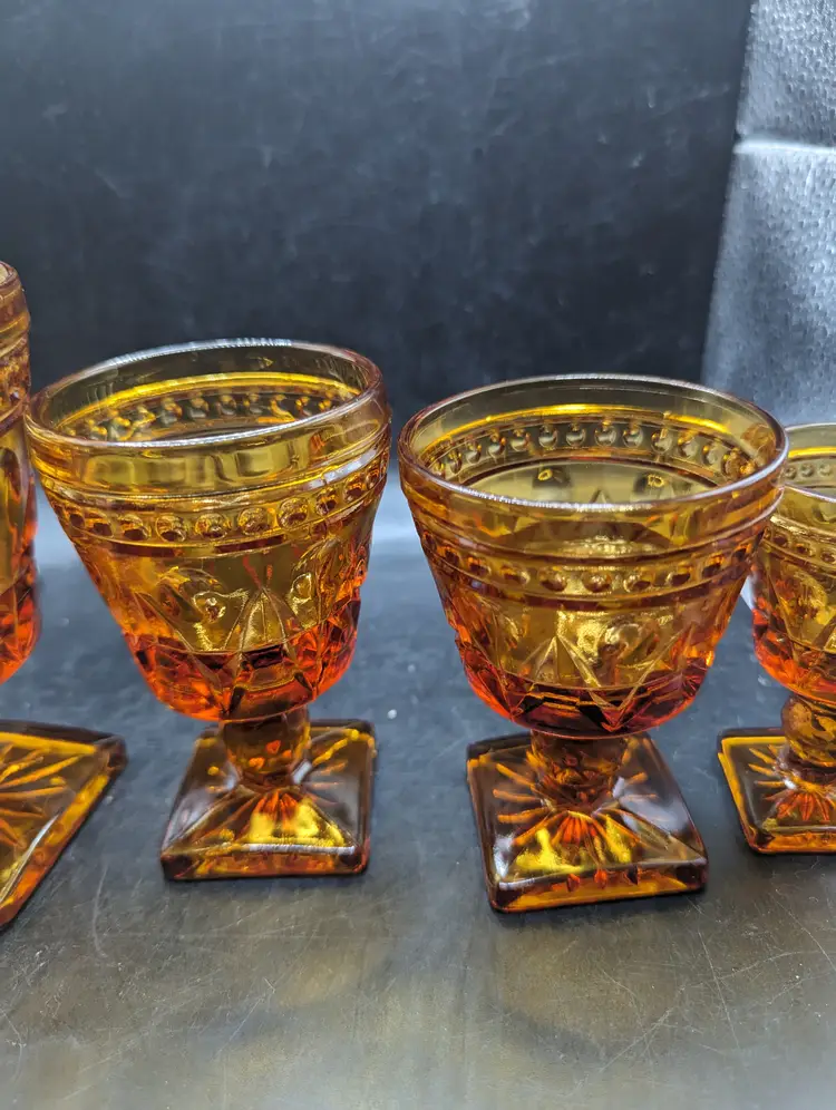 This is a lovely Vintage Set of 4 Indiana Colony Park Lane Square Footed Amber Glasses Graduated Sizes. Please see all pictures for condition and measurements.