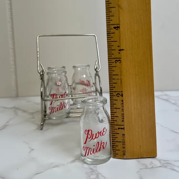 Great vintage set of miniature glass milk bottles in a wire carrier. All in great condition; no chips or cracks. Bottles measure approx. 2” tall.