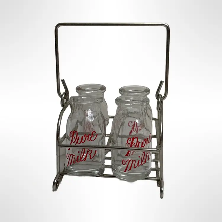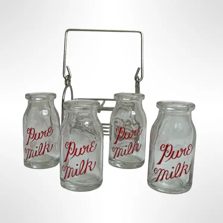 Vintage Set Of 4 Miniature Glass Pure Milk Bottles With Wire Carrier