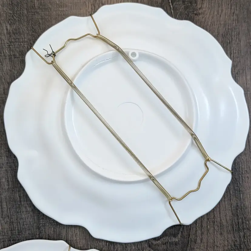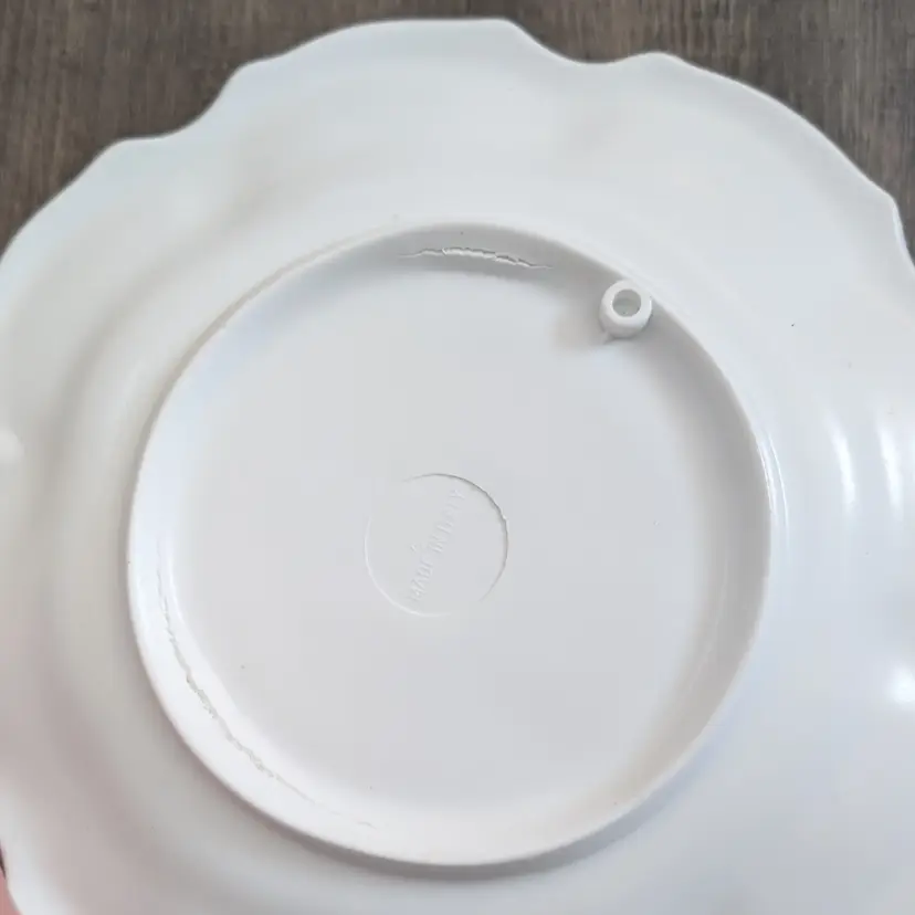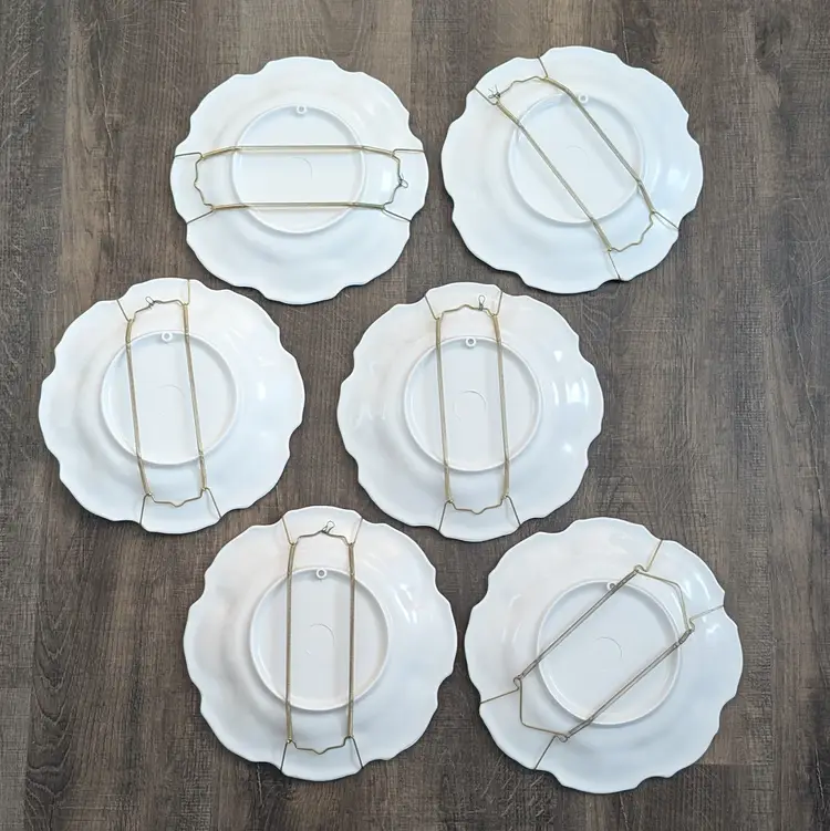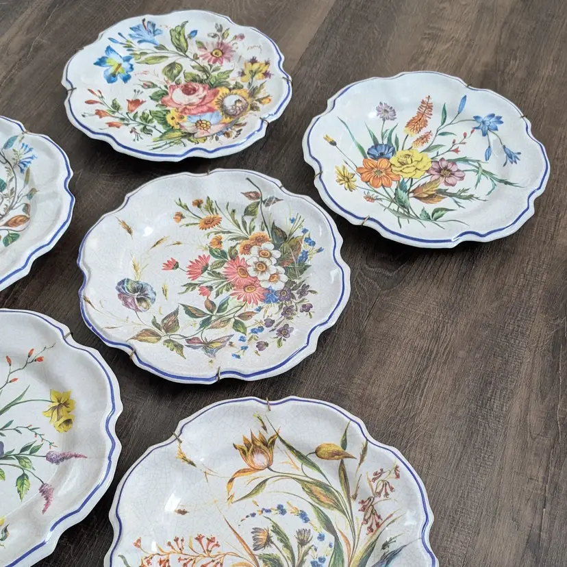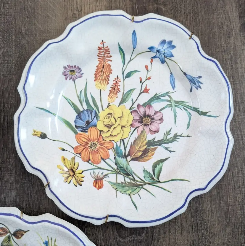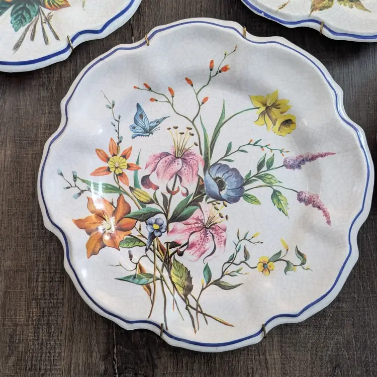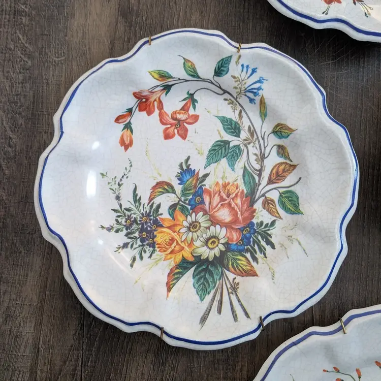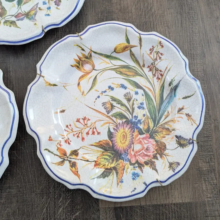 Beautiful melamine plates with scalloped edges, a crackle background, blue edging and gorgeous floral patterns. All size are different patterns. They come with metal plate hangers for easy hanging on the wall (removed for shipping). They are in nice used condition with some minor wear on the the edges and one of the back rims has some cracking (see pictures). Measurements ~ 10.5" dia
