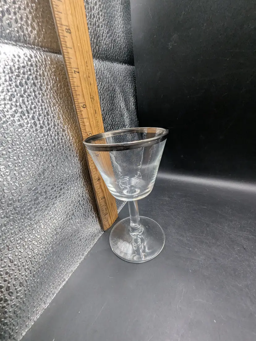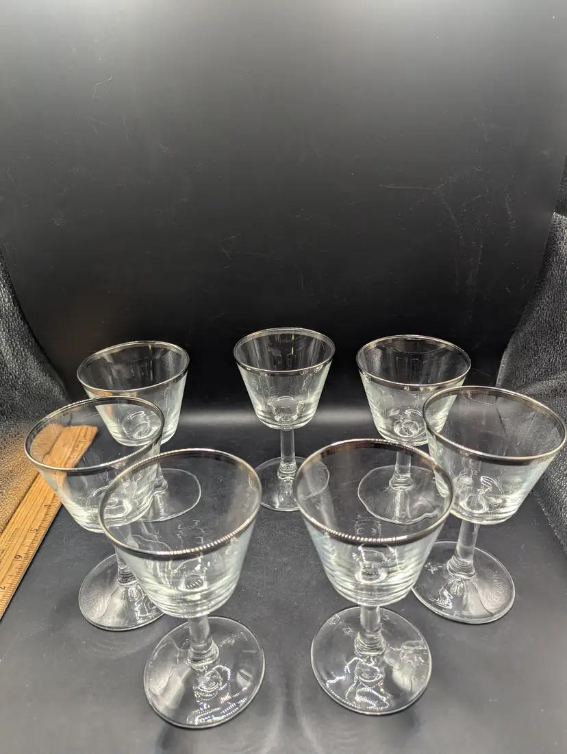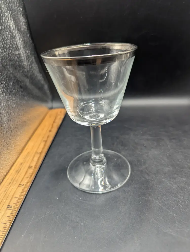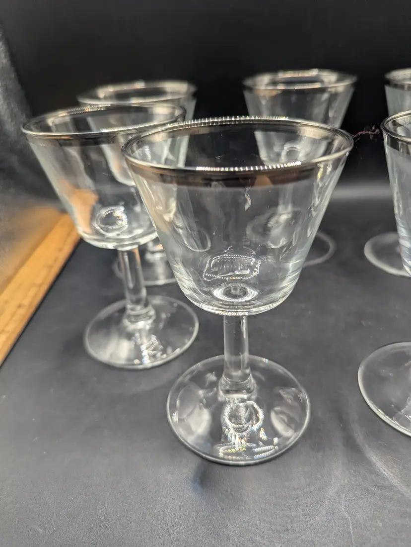 This is a lovely Vintage Set Of 7 France Cristal D'Arques-Durand Wine Glasses Platinum Rim 2.5" Cup from rim to base. No chips or cracks. Please see all pictures for condition and measurements. Please see all other listings that match this pattern including goblets, coupes, cocktail/parfait, etc