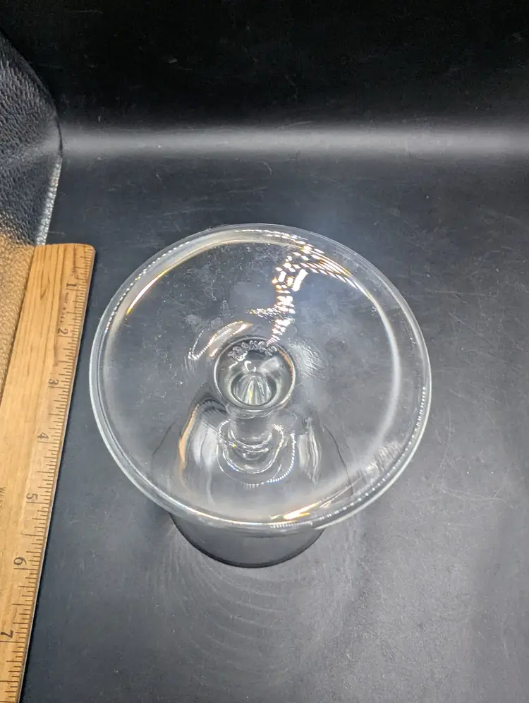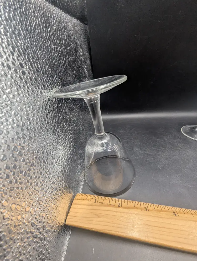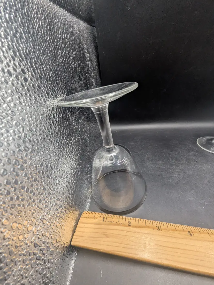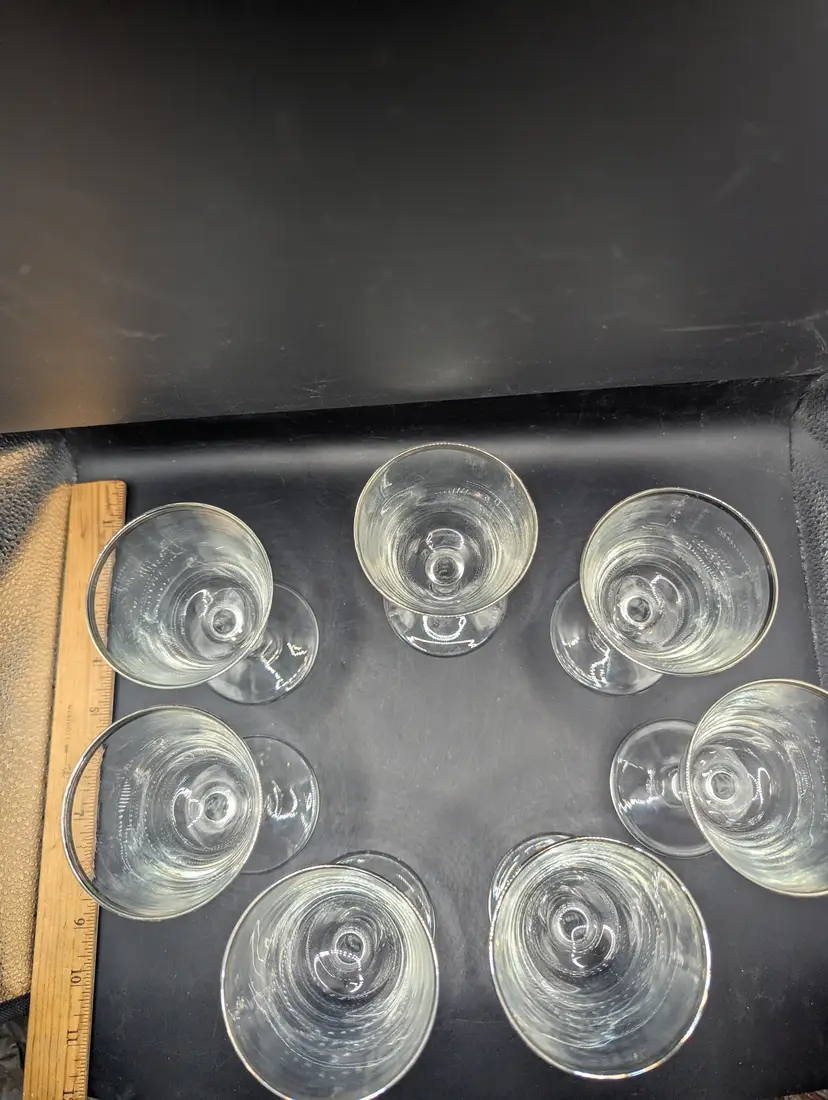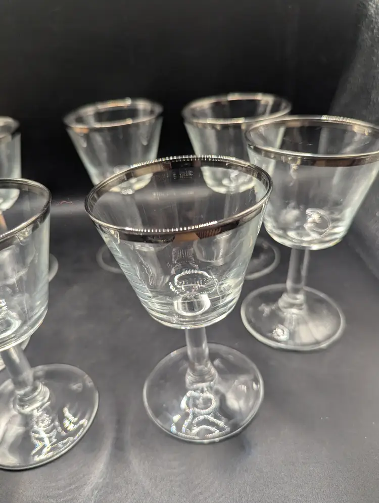 This is a lovely Vintage Set Of 7 France Cristal D'Arques-Durand Wine Glasses Platinum Rim 2.5" Cup from rim to base. No chips or cracks. Please see all pictures for condition and measurements. Please see all other listings that match this pattern including goblets, coupes, cocktail/parfait, etc