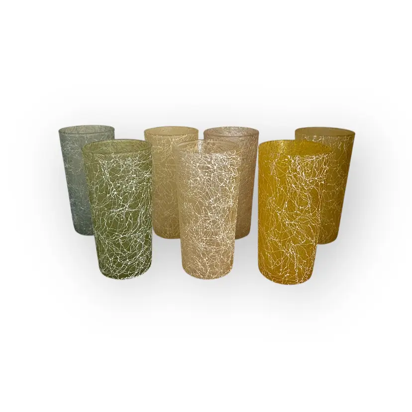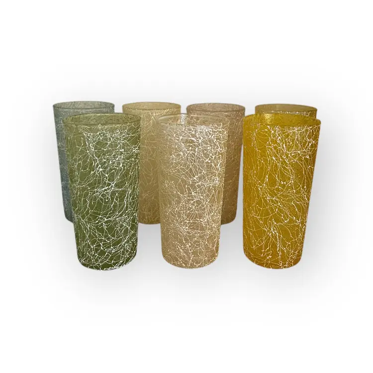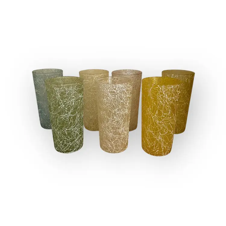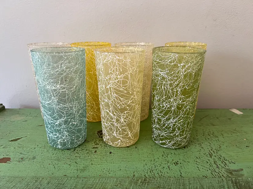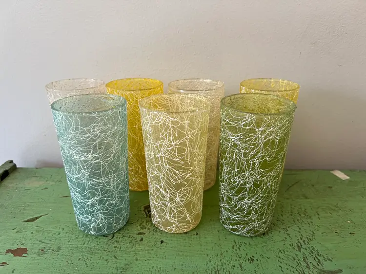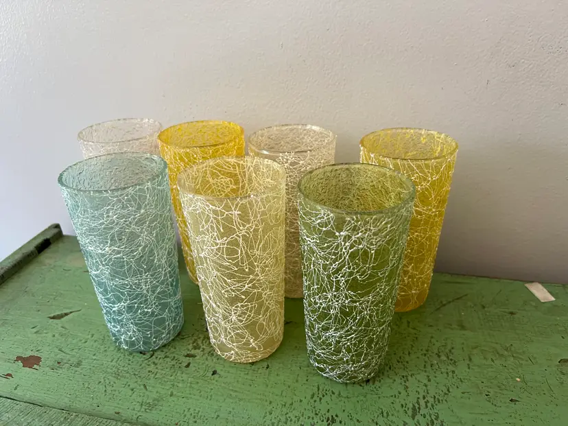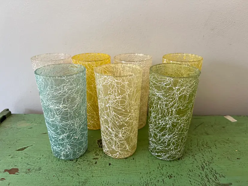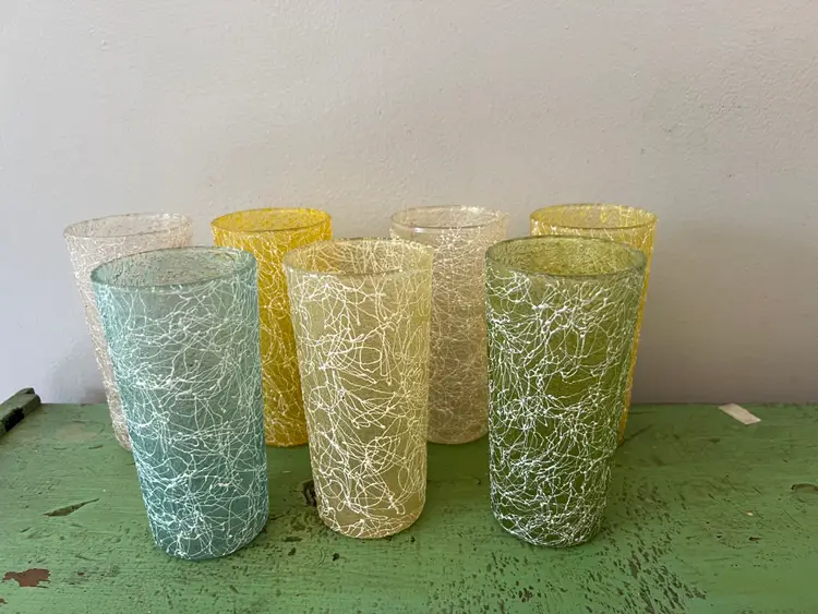 Fantastic set of 7 Hazel Atlas Spaghetti String retro glasses. Great condition- the rubber coating is flawed at the top of one of the lightest colored glasses. As pictured. Glasses are 5.75" tall