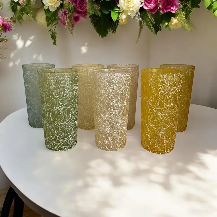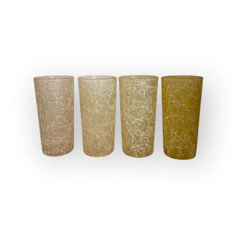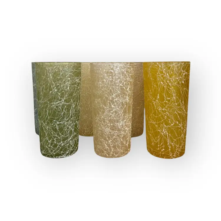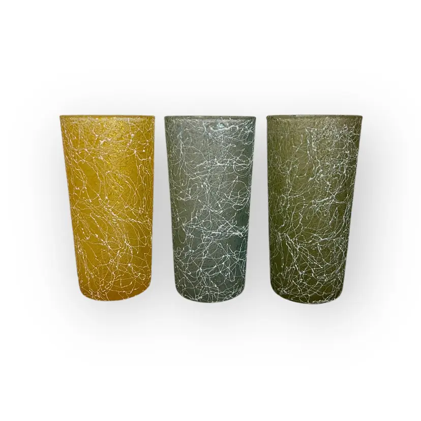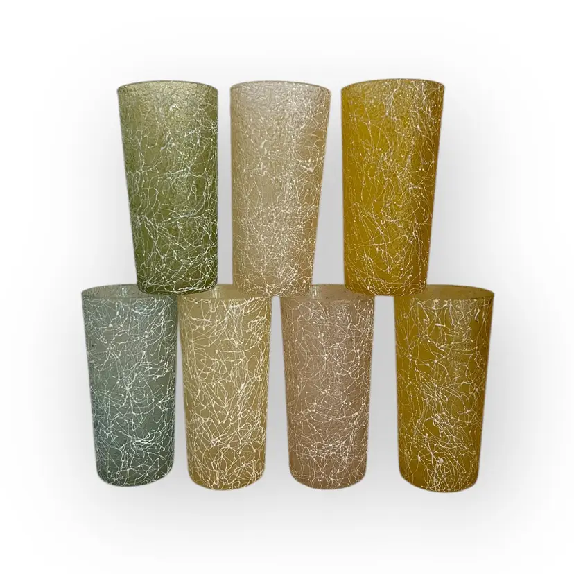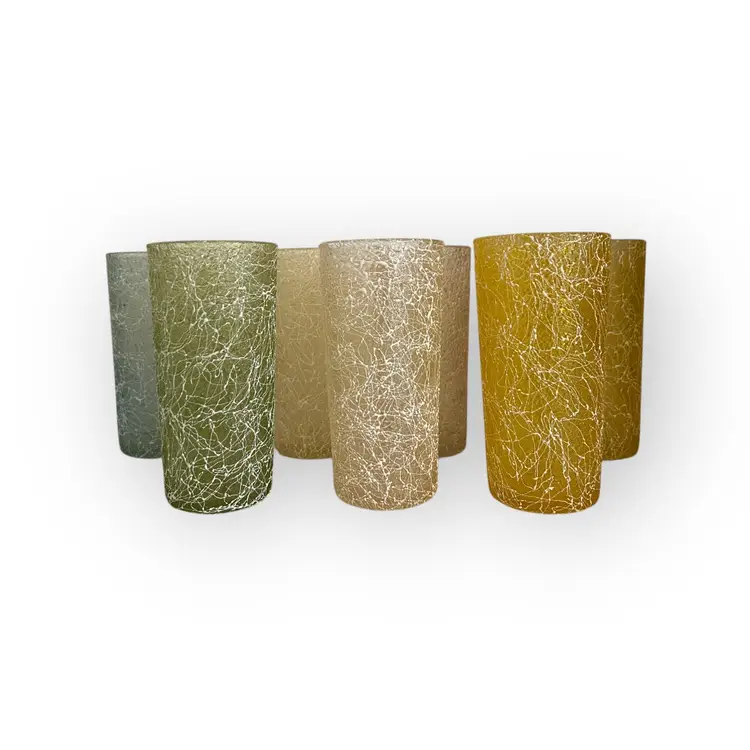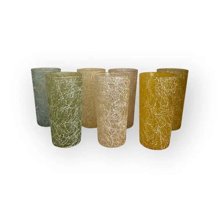 Fantastic set of 7 Hazel Atlas Spaghetti String retro glasses. Great condition- the rubber coating is flawed at the top of one of the lightest colored glasses. As pictured. Glasses are 5.75" tall