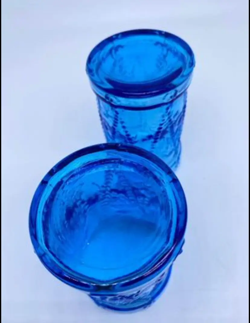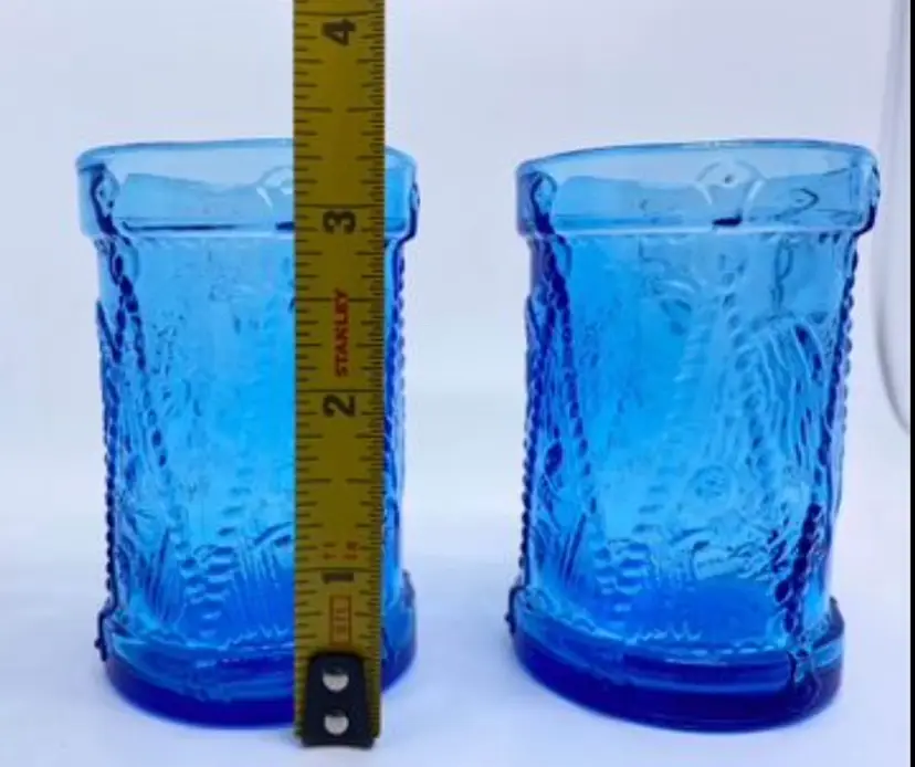 Vintage set of 2 blue glass Wheaton Eagle & Drum glasses. Juice glasses. No chips or cracks.
