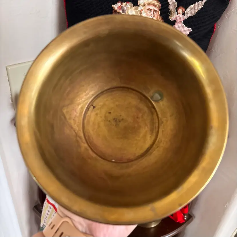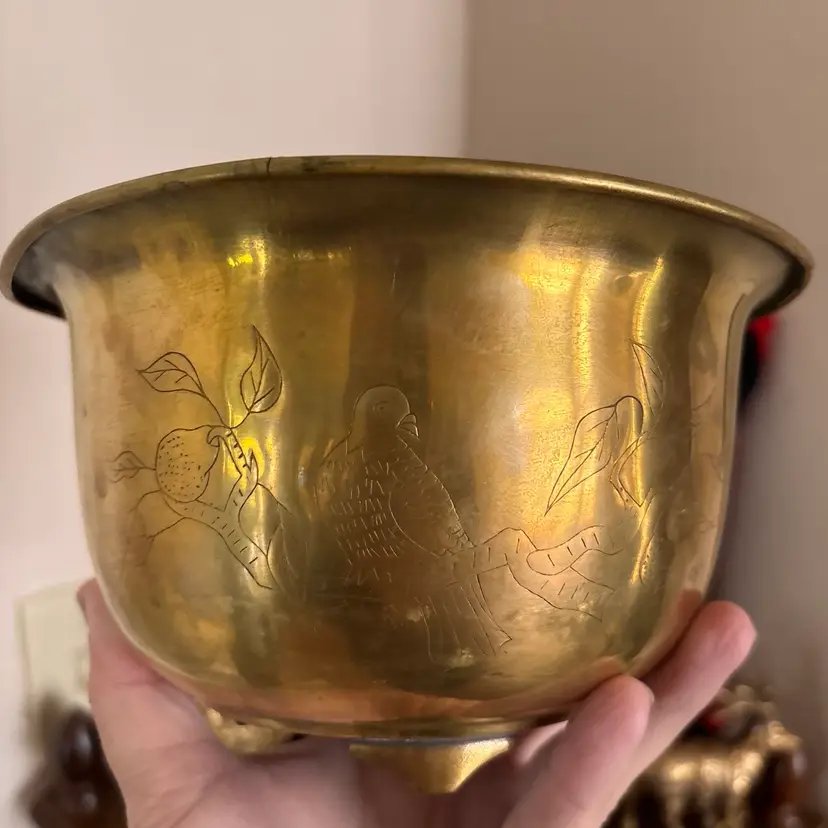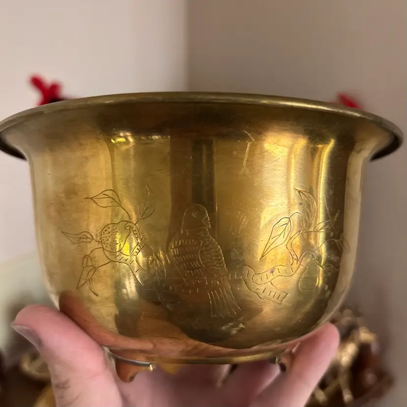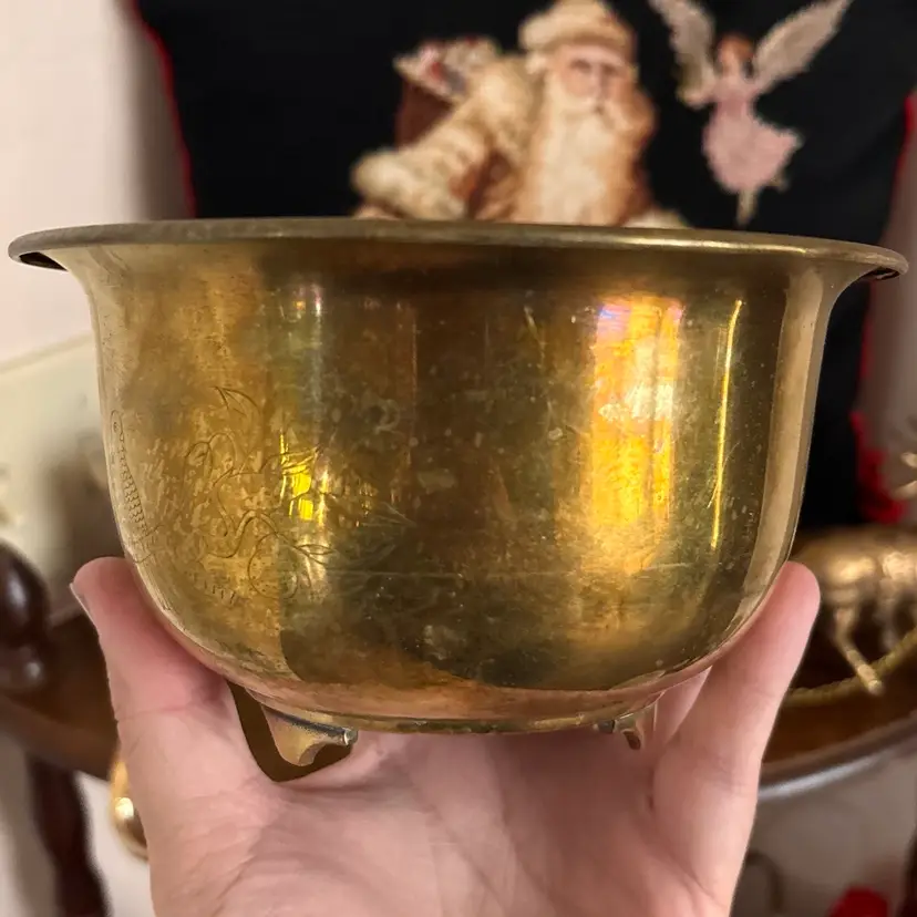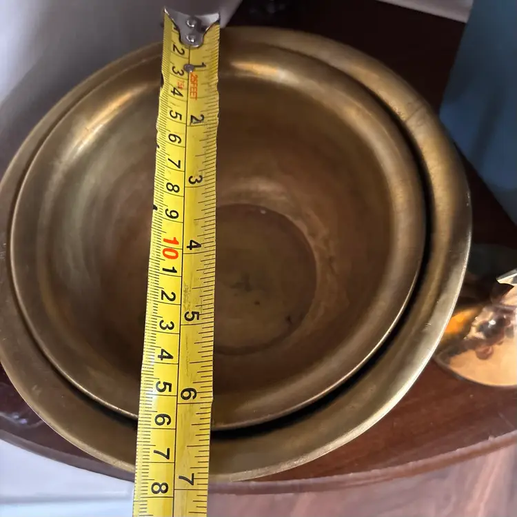 Beautiful brass bowls 3”tall x 7”diameter Vintage wear & patina as shown- dent on side of larger bowl