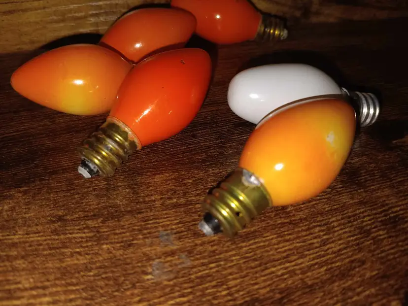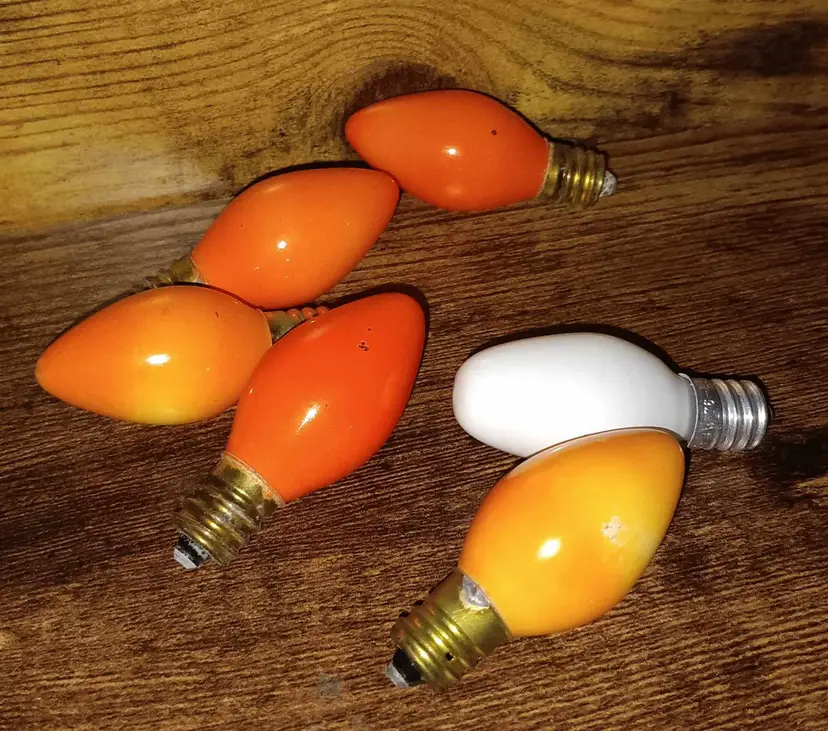 Set of replacement bulbs for Christmas light candles or other uses. There are 5 orange and 1 white bulb. All have been tested and work. There is some light paint loss on the bubs, good condition. The bulb measures 2 inches long.
