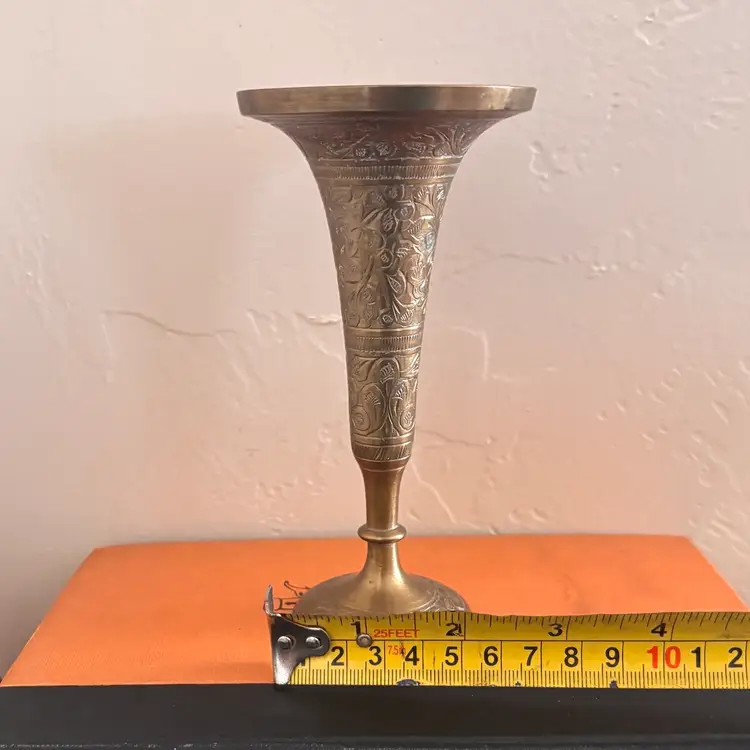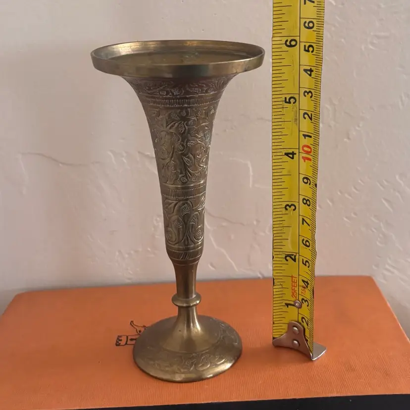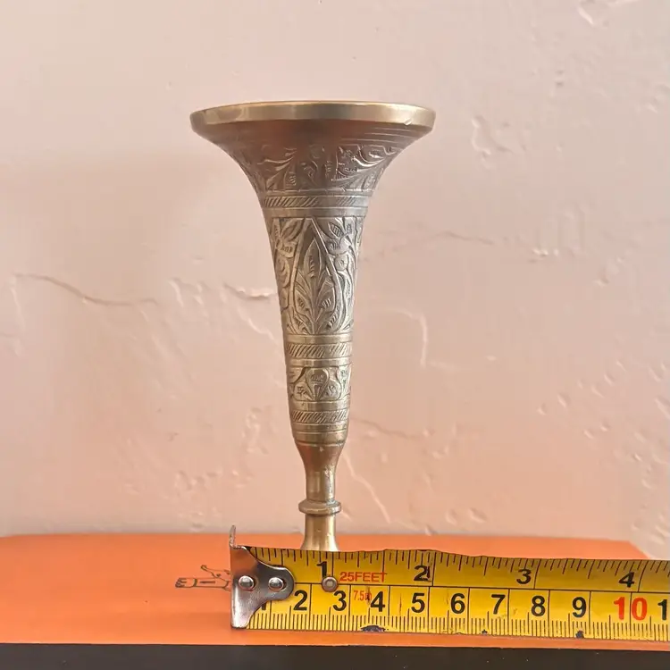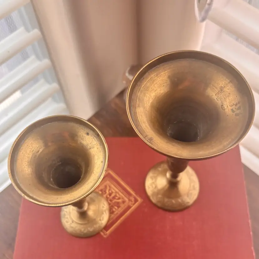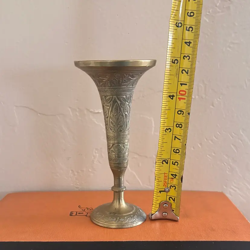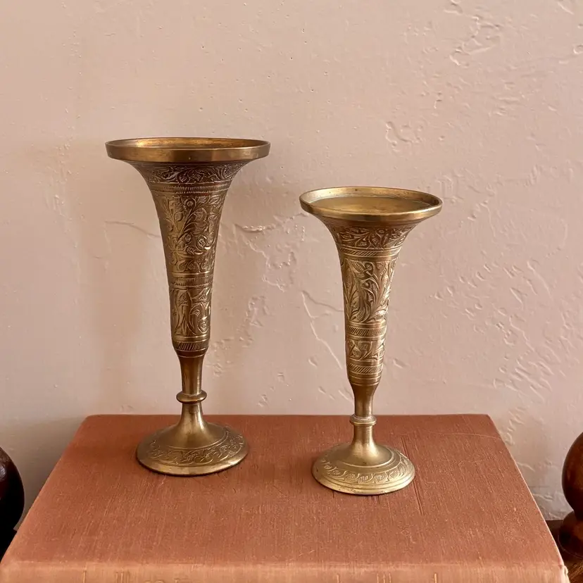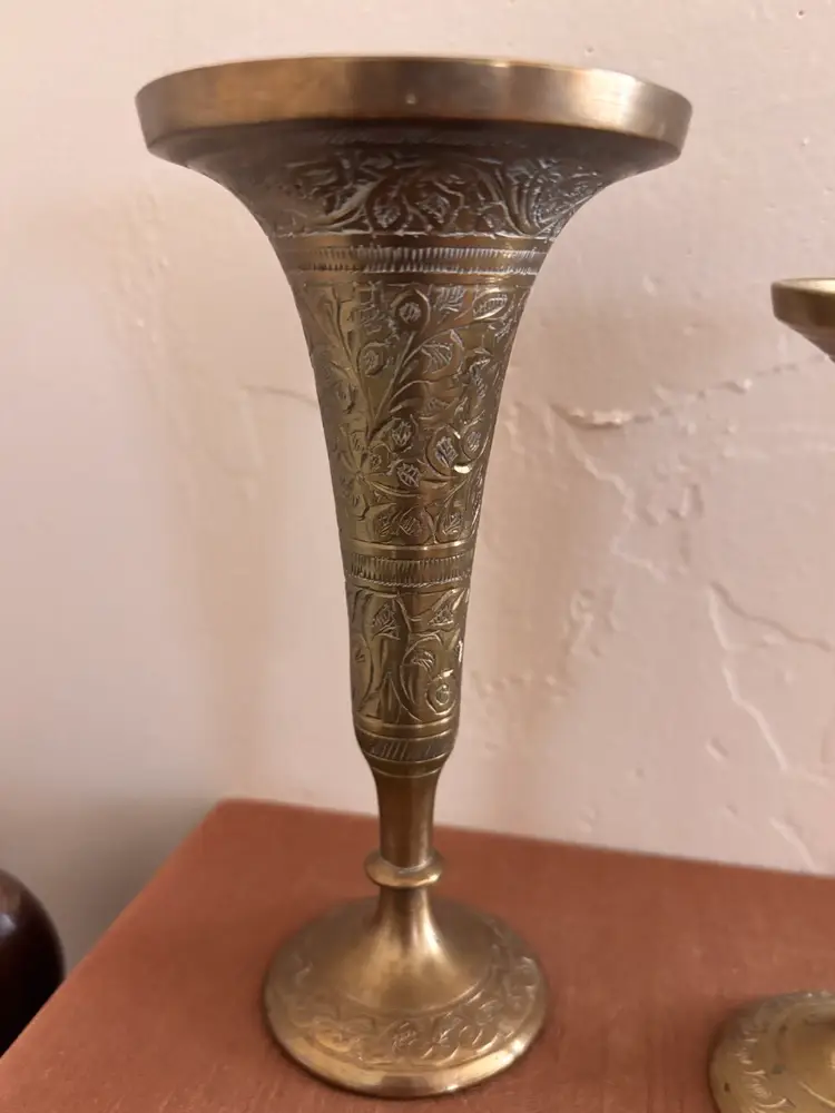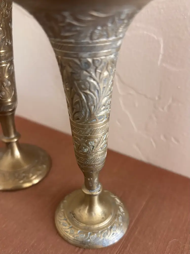 2 Etched floral motif vases 5 & 6”tall Vintage wear and patina as shown, these have not been cleaned and can be shined up