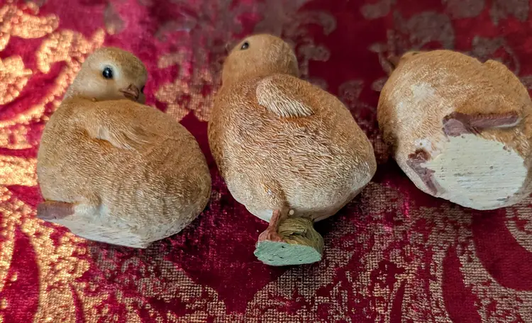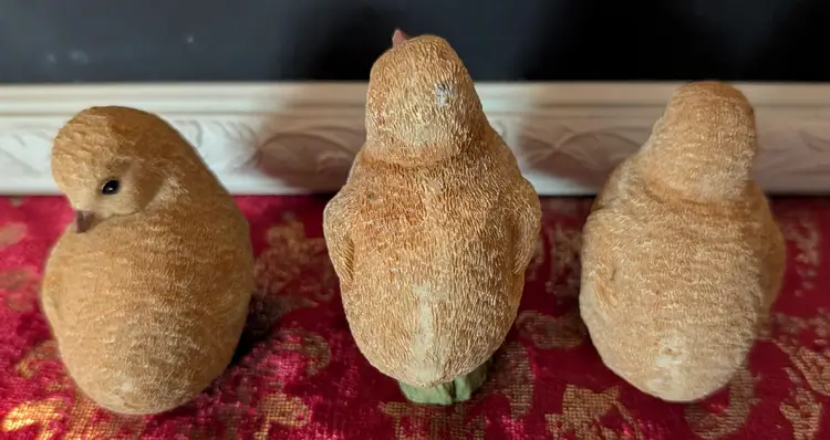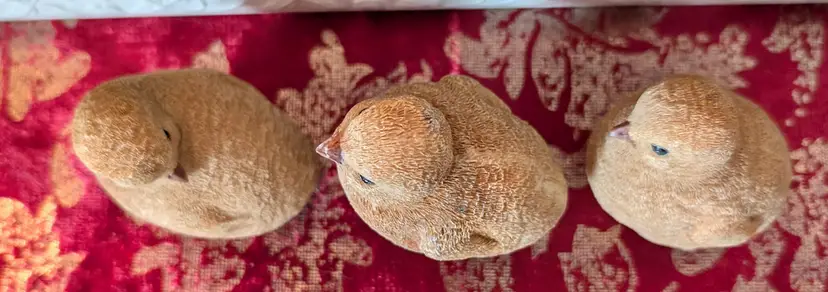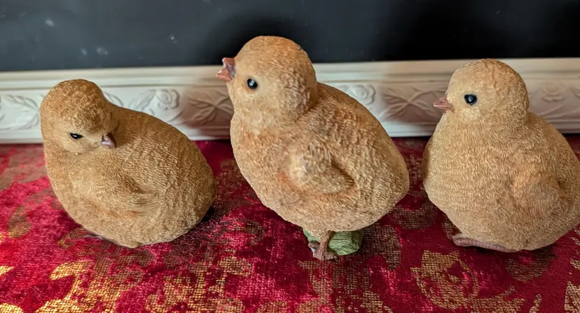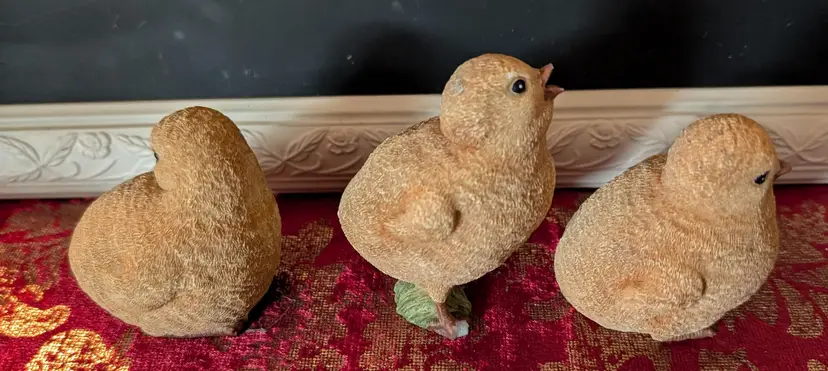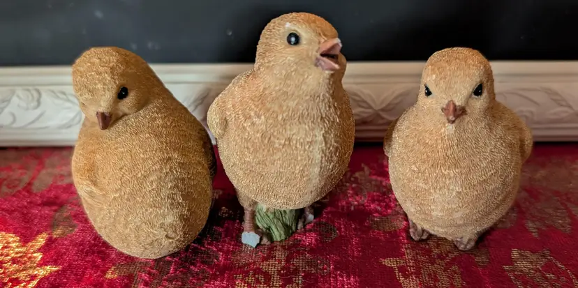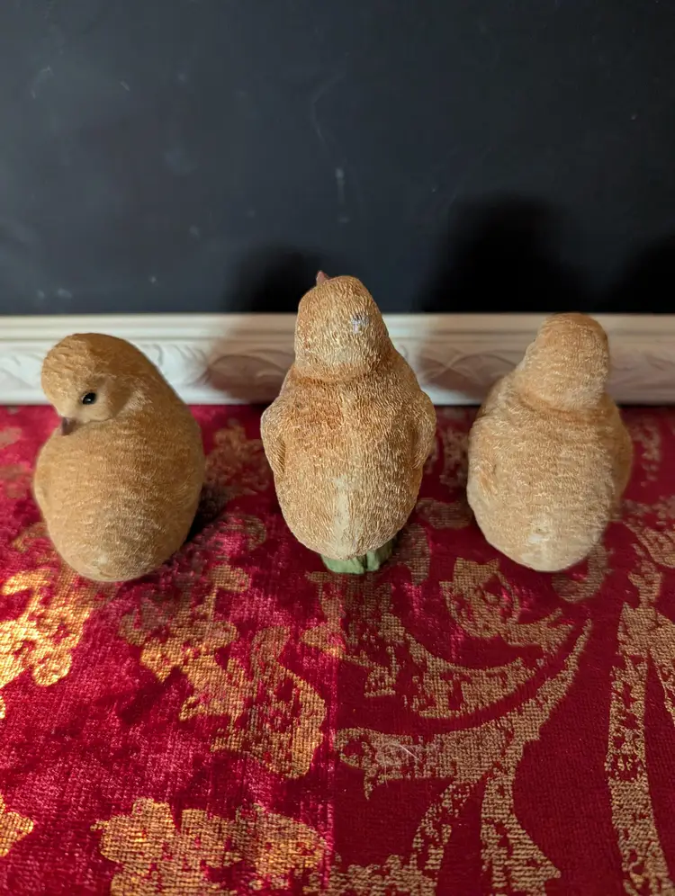 Charming set of three vintage Resin Chicks figurines, each with unique expressions and lifelike detailing. These adorable birds are in good condition with 2 that have no chips or cracks but the one standing chick does have some chips on his toes that are not very noticeable but does make them AS IS and they are still a nice looking set, perfect for adding a touch of whimsy to your home decor or as a delightful addition to your collection. Ideal for bird lovers and vintage enthusiasts alike. Each piece is approximately 3 inches height.
