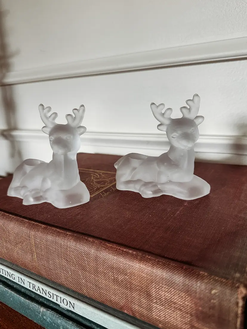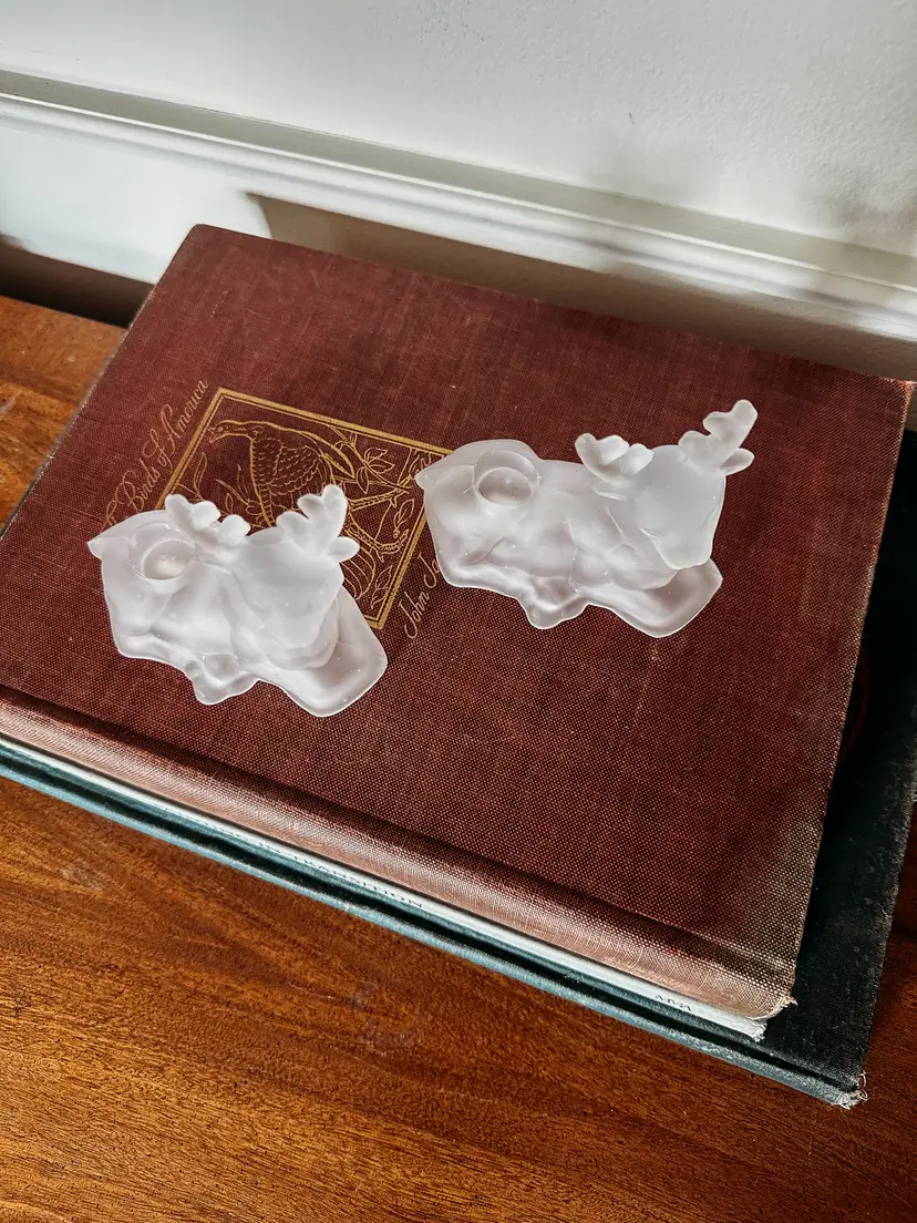 Beautiful pair of frosted glass Crystal reindeer candle holders. I DO have the Red satin ribbon that is meant to go around each reindeer neck. Comes in original box. Made in Taiwan 1993 Macy & Co. Approximate measurements are 4.5”L x 4.5”H each one.