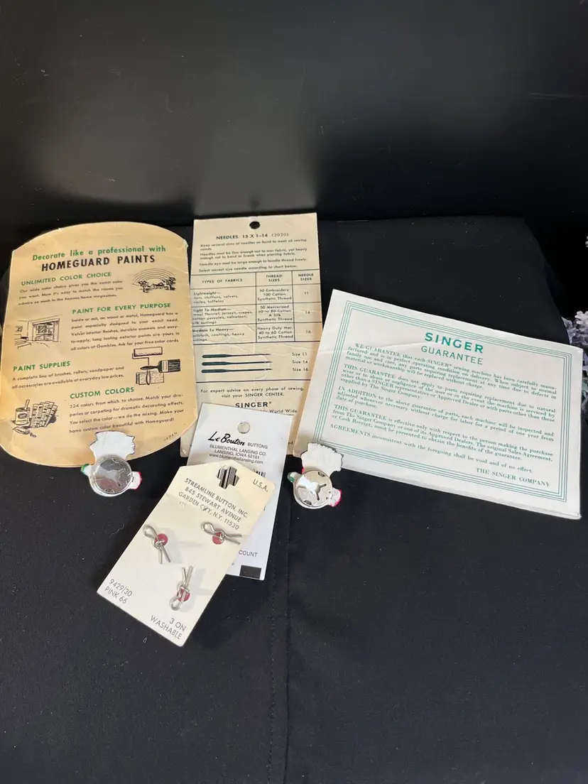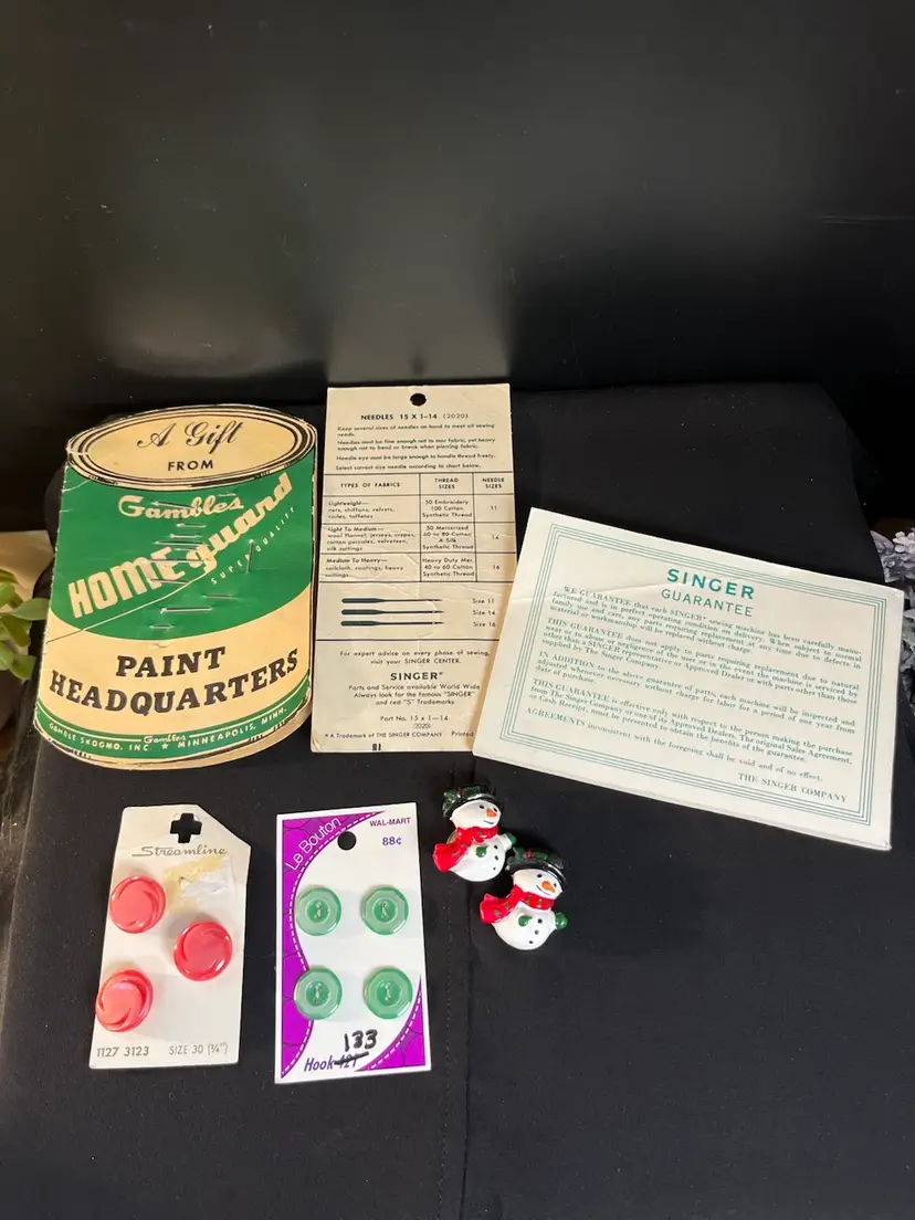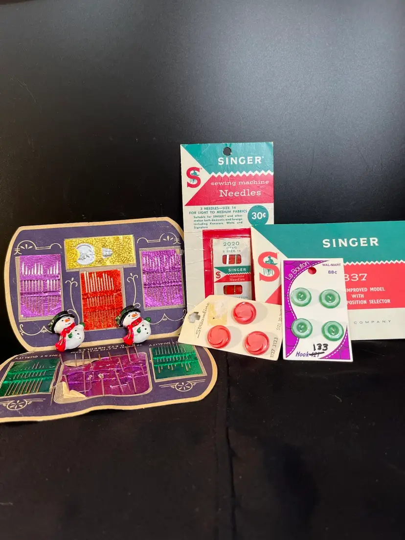 Includes: Singer "337 New, Improved Model w/ Needle Position Selector" owner's manual, Advert from Home Guard w/ Gambles Paint Headquarters-w/ a fantastic variety of sewing needles, 2 cards of buttons, Singer Sewing machine Needles-2 needles still in package & 2 Snowman button covers. Total pre shipping wt is approx 2.8 Oz