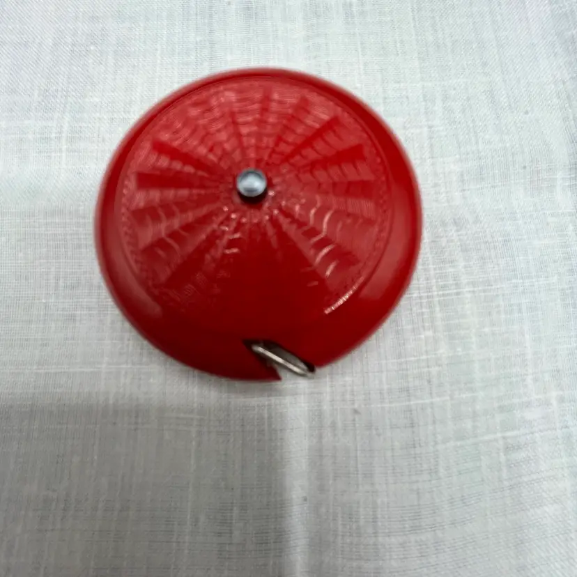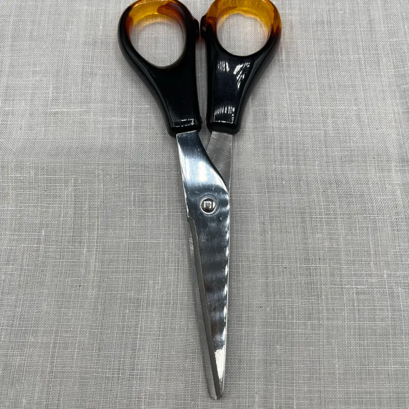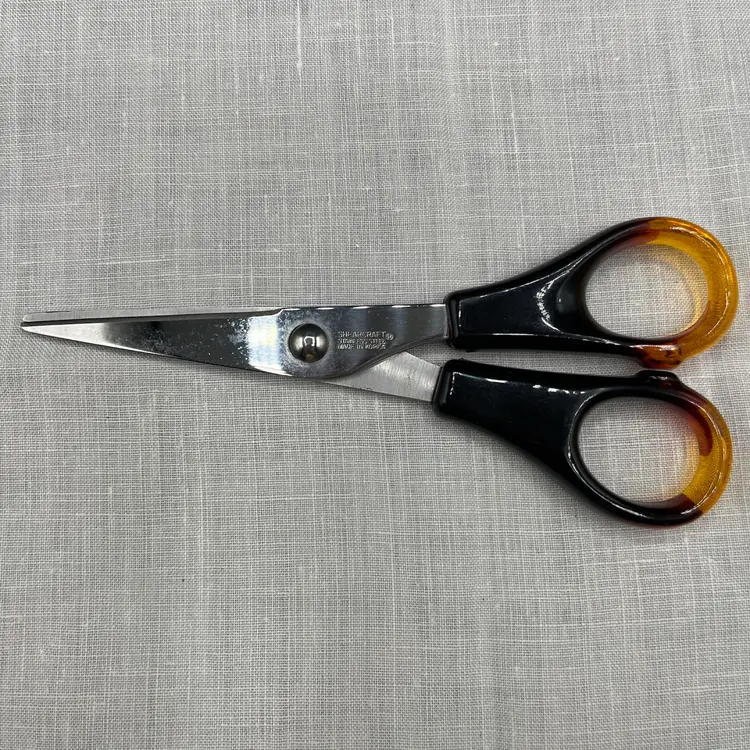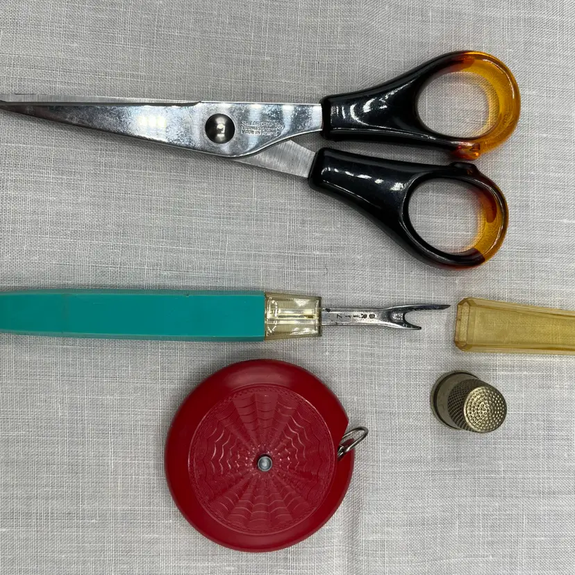 Shearcraft 5” tortoise shell handle stainless steel scissors made in Korea, clean and sharp. Measuring tape 40” red plastic made in Germany. Brass thimble #8. Dritz seam ripper aqua plastic handle.
