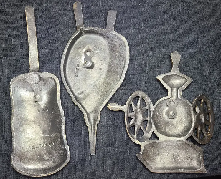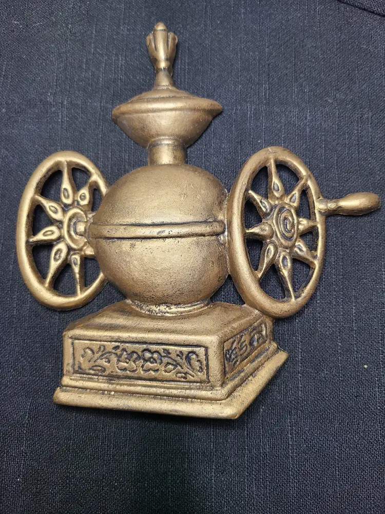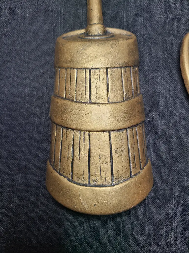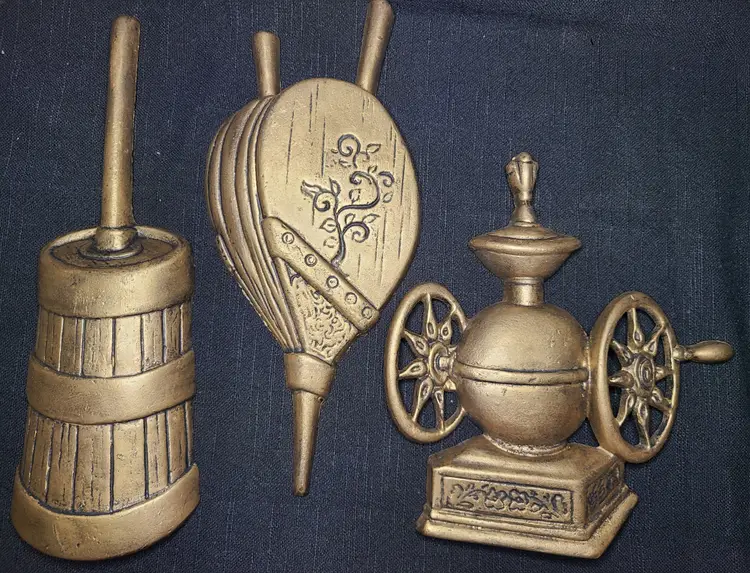 I have altered these pieces. They were originally matte black, but I've added an antique Rub 'N Buff to give a vintage brass patina. Butter churn measures approximately 8.5” long x 2.75” wide. Coffee grinder measures approximately 6” long x 5.5” wide. Bellow is approximately 8" long and 3.5" wide. All have the hardware for hanging on a wall. Fits a farmhouse or cottage kitchen decor. Made in the USA.