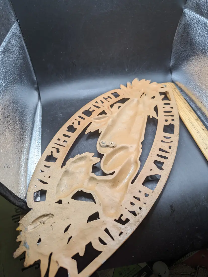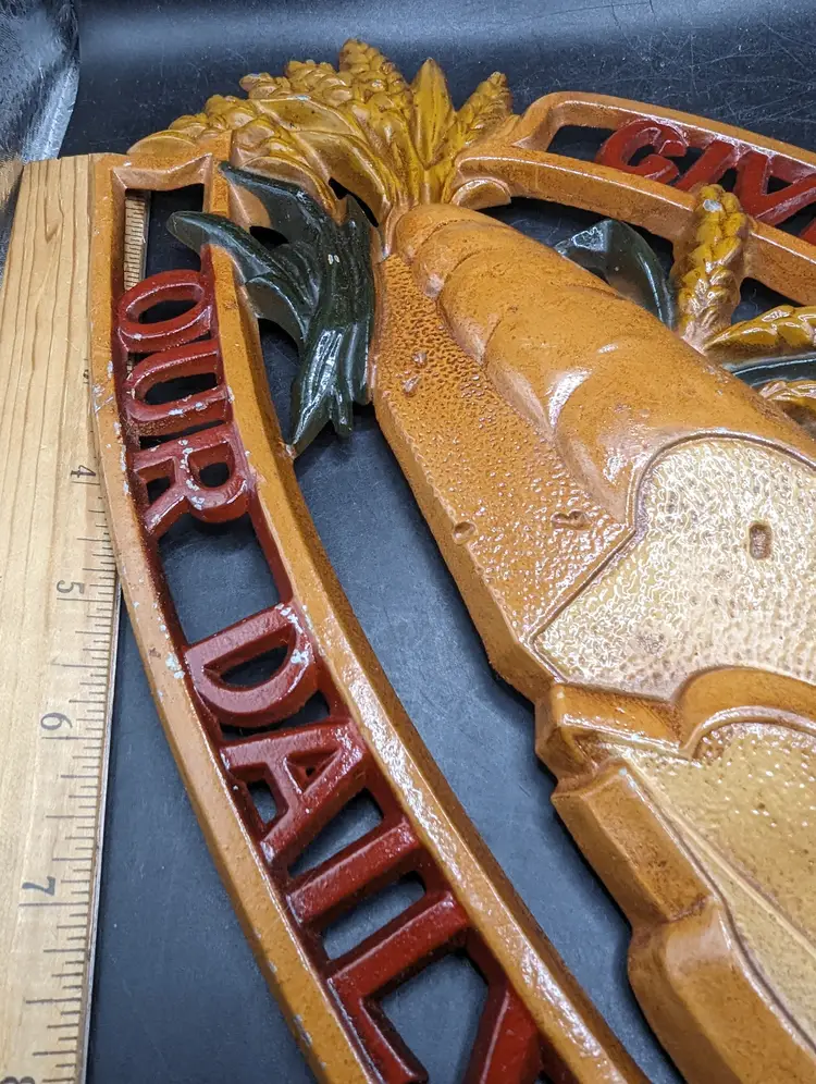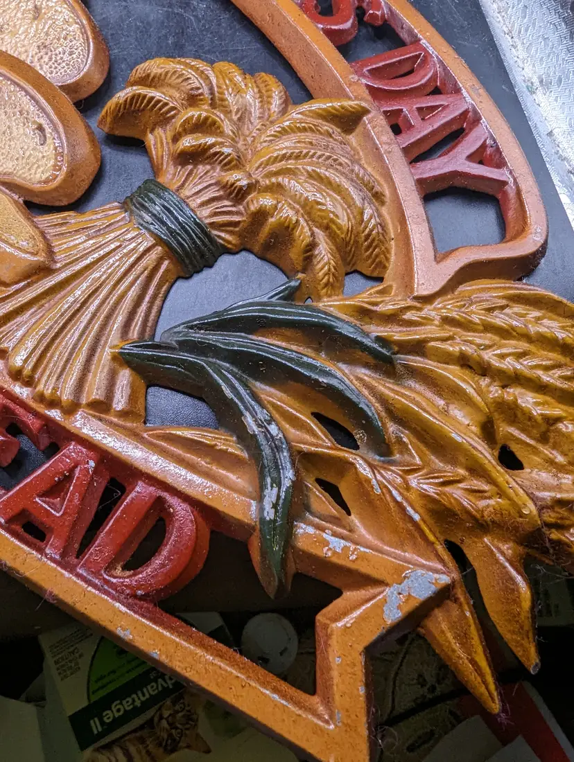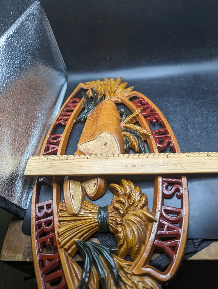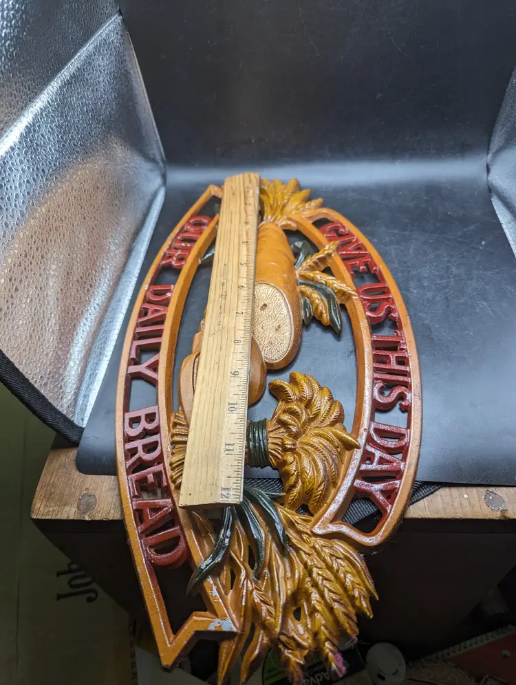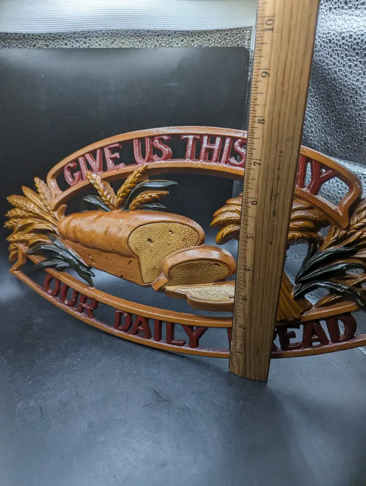 This is a lovely Vintage Sexton Give Us Our Daily Bread Metal Sign Plaque Religious Decor. It measures about 16 inches by 8 inches. There is some paint wear as seen in last two pictures. Please see all pictures for condition and measurements.