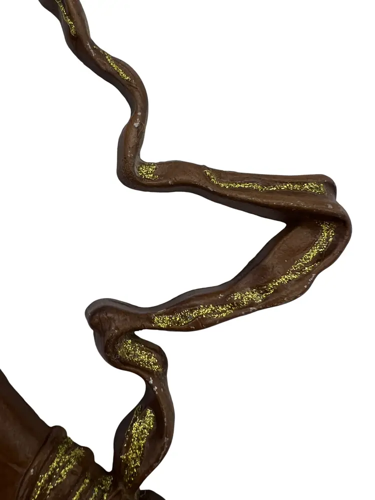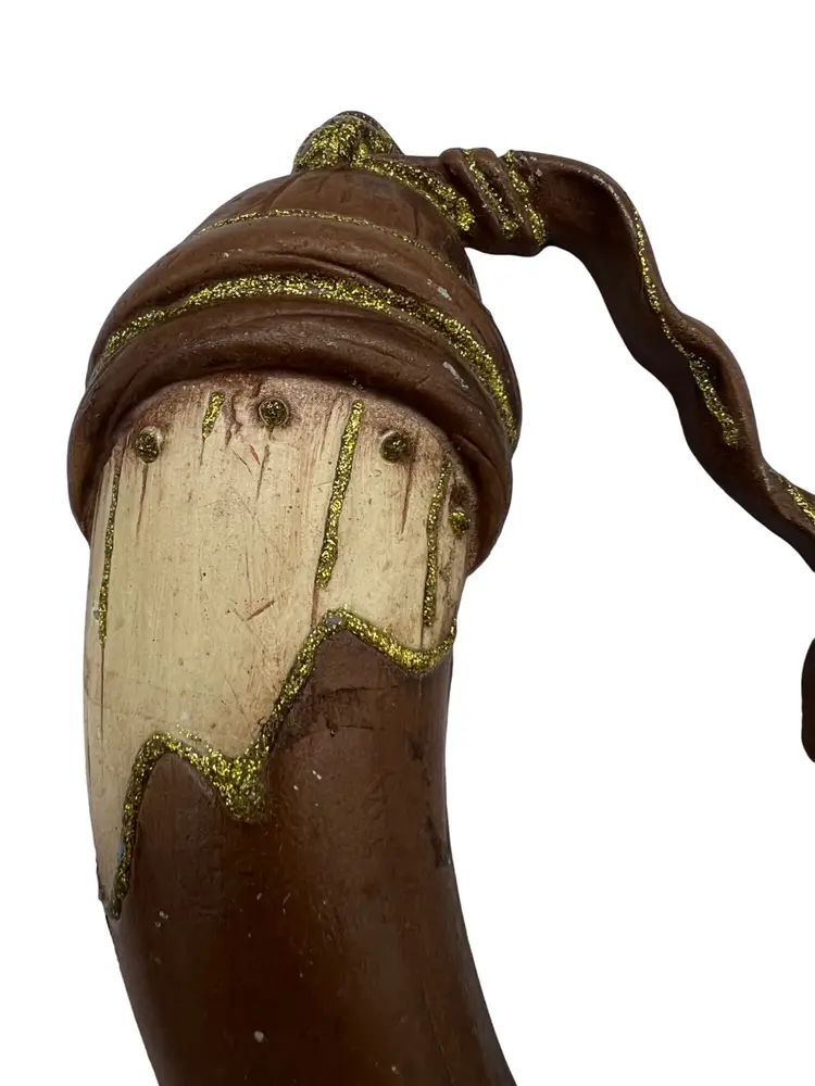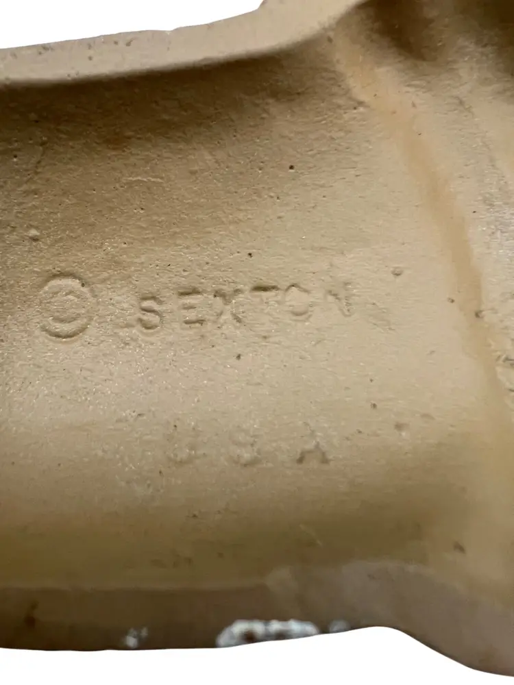 Vintage Sexton USA cast-metal wall plaque in the shape of a colonial style powder horn. Piece is painted brown and cream with gold glitter accenting the horn and strap and a black tip at the end. Back is marked © Sexton USA and includes an integrated hanger, ready to display. Measures about 9" long by 6" tall and works well with Americana, western, cabin, or mid-century wall décor.