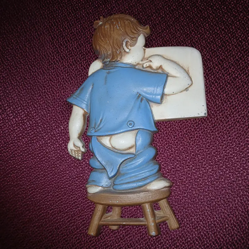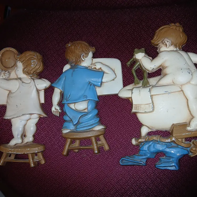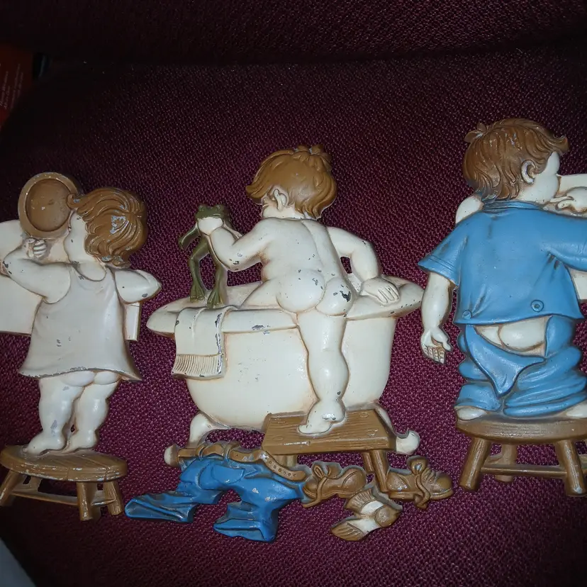 Adorable children in the bathroom wall plaques made of metal and marked 1966 and 1970 could use a little paint or just leave as is! Would be so cute in your bathroom