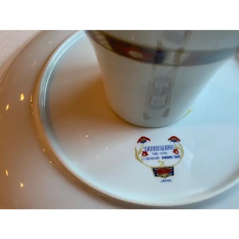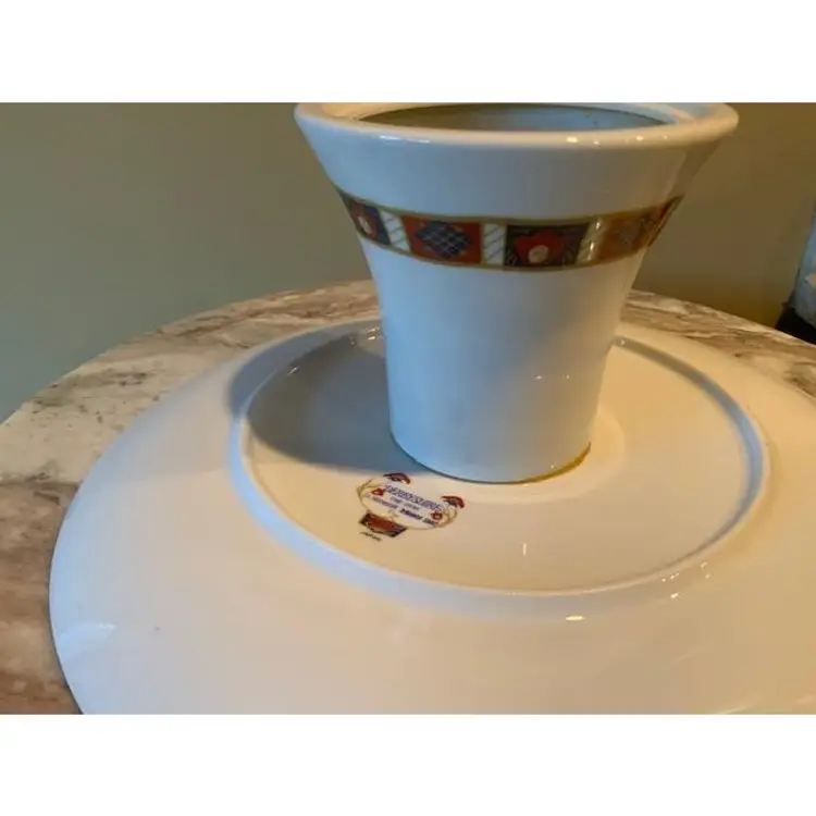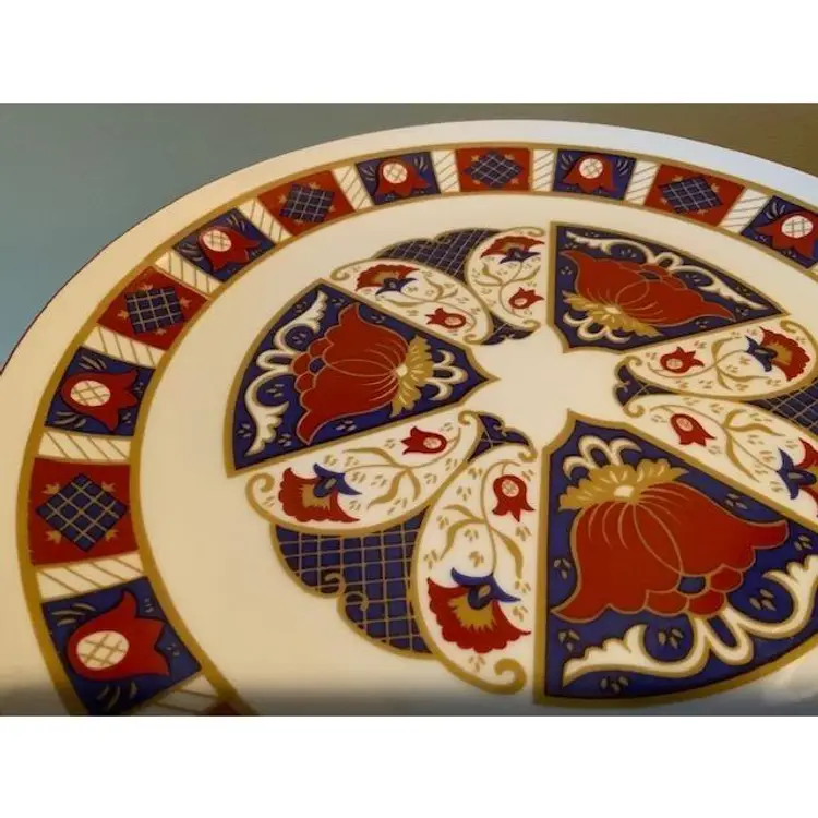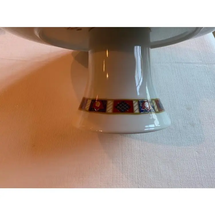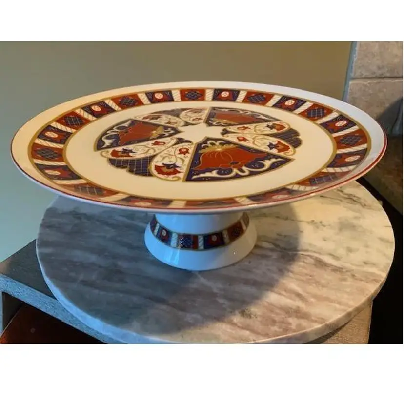 Made in Japan, this footed cake plate measures approximately 4-1/2” high and 10-1/4” in diameter. White background with rust/red and gold flowers in blue panels with the same colors in the trim around the diameter. Excellent condition with no chips, cracks or paint loss – looks unused.