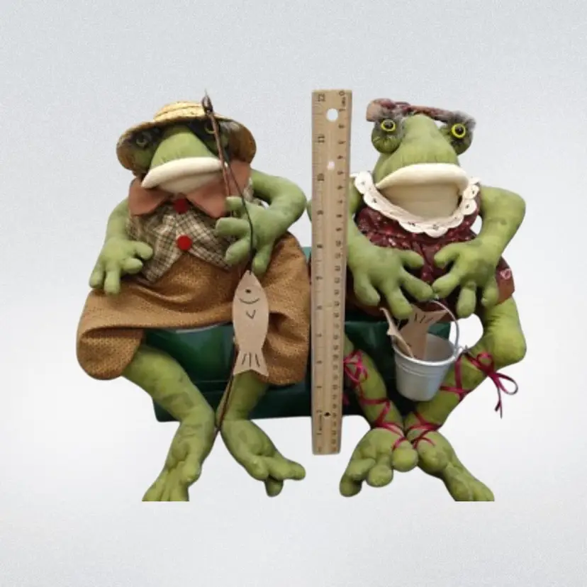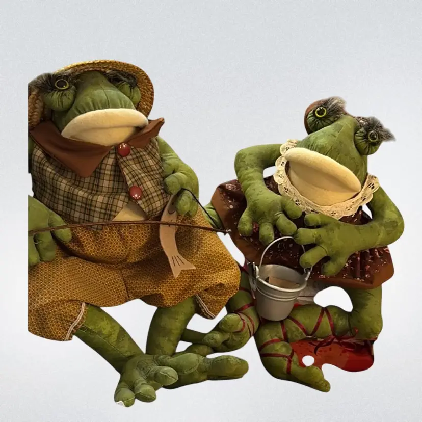 This pair of soft-sculpture cloth frogs is dressed in country-style outfits and accessorized with fun props: • Male Frog: Straw hat, plaid vest, and fishing pole with a felt fish. • Female Frog: Floral dress with lace collar, headscarf, and tiny metal bucket.