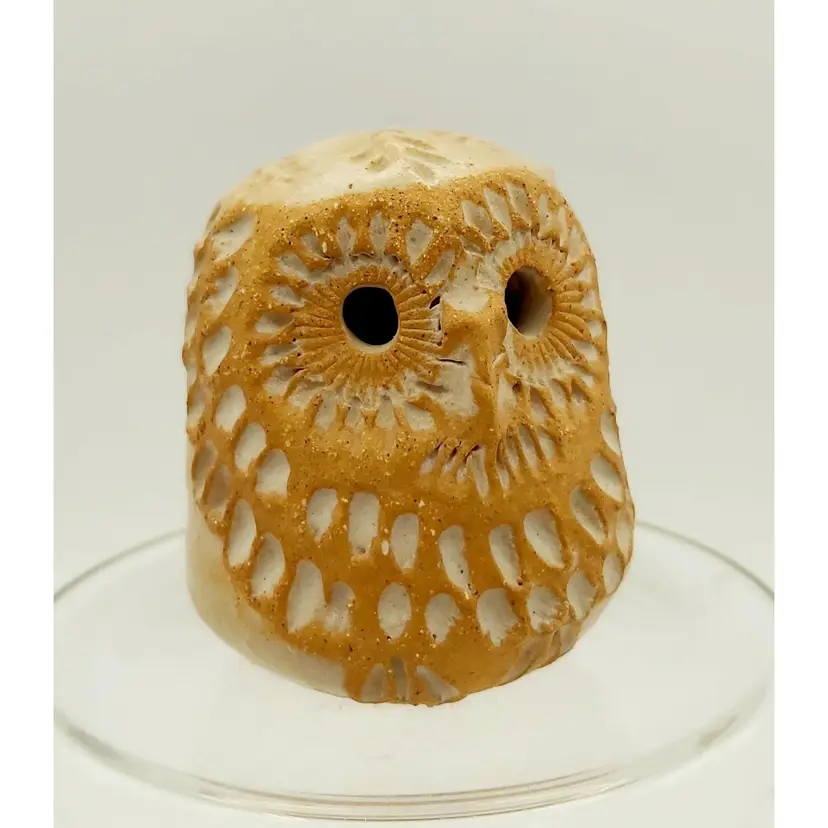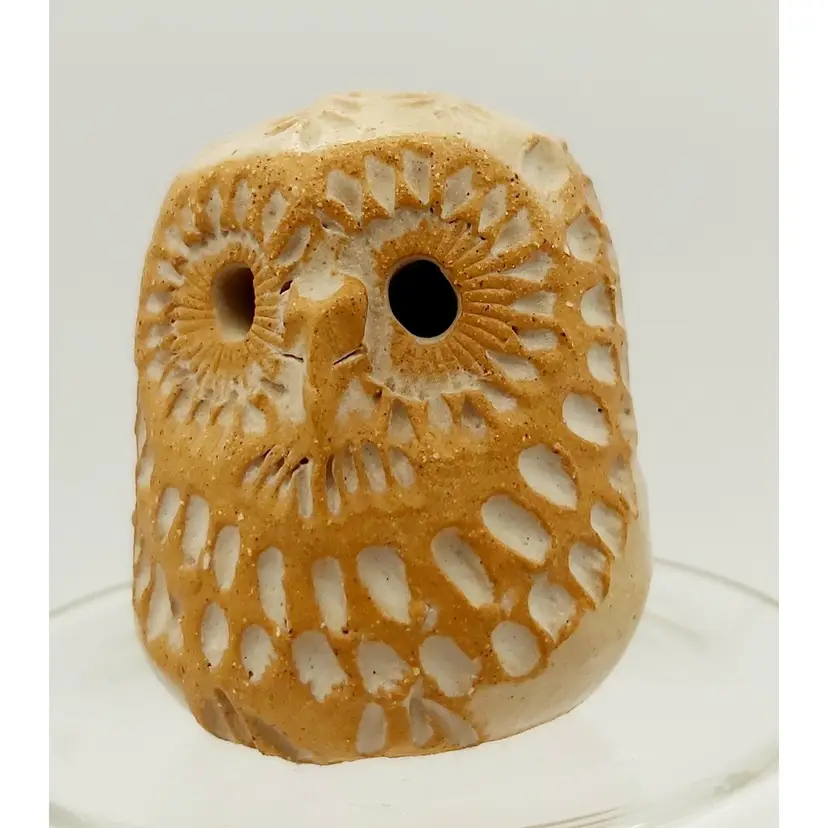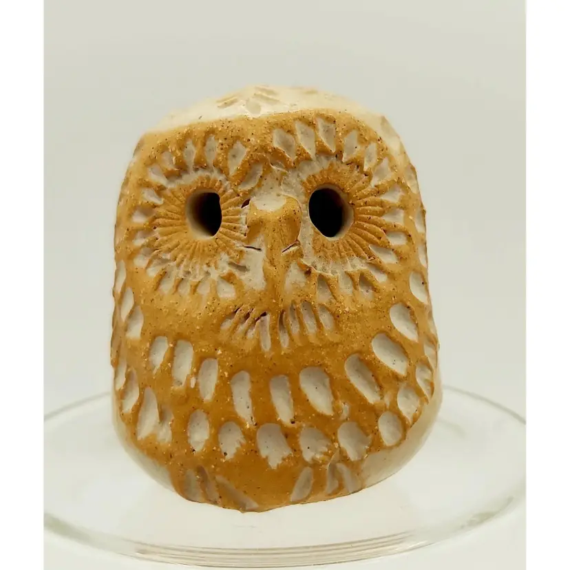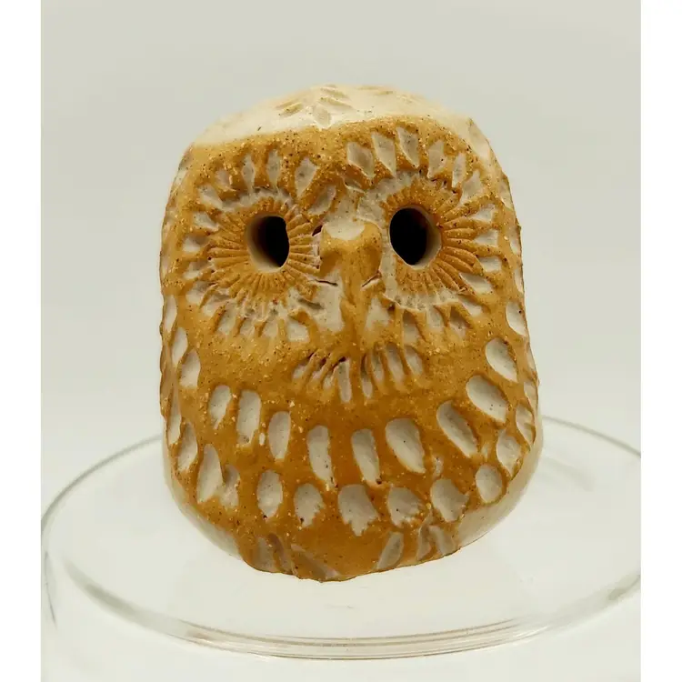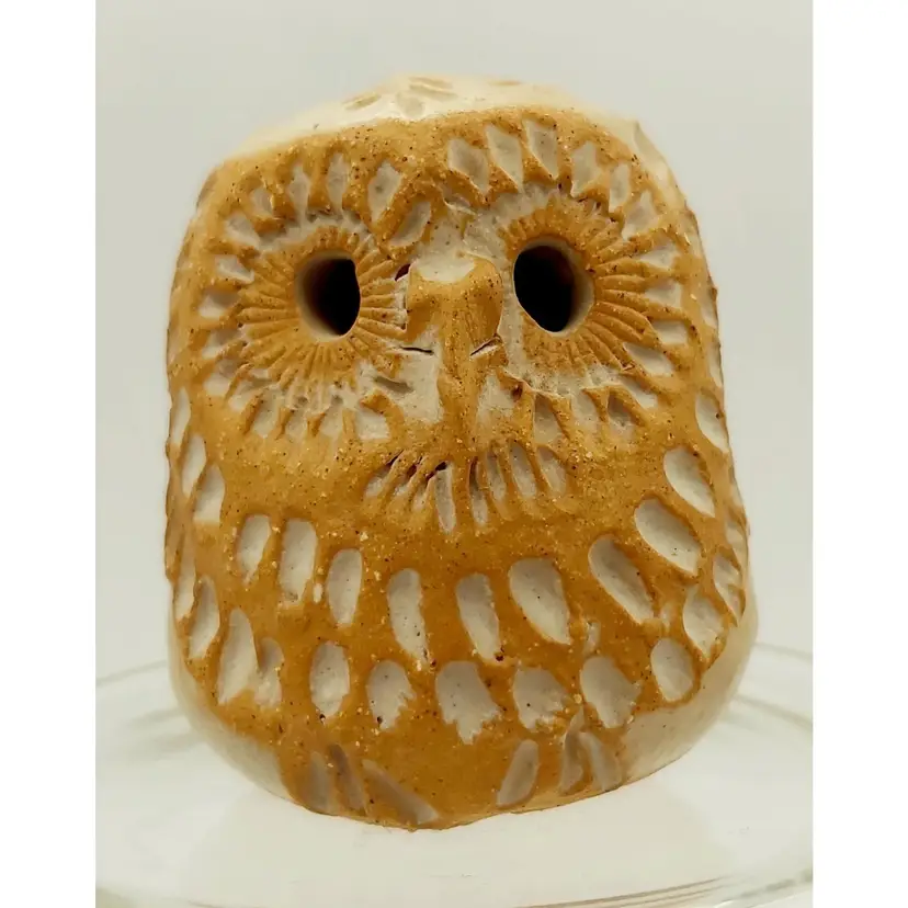 This owl is small but mighty. Beige overglaze is carved out to show the terracotta clay underneath, to give this owl amazing detail and texture. This technic is known as Sgraffito. Artisan stamped and signed. Canadian Studio made. No chips or cracks. Measures approx. 2.25" high x 2" wide diameter.