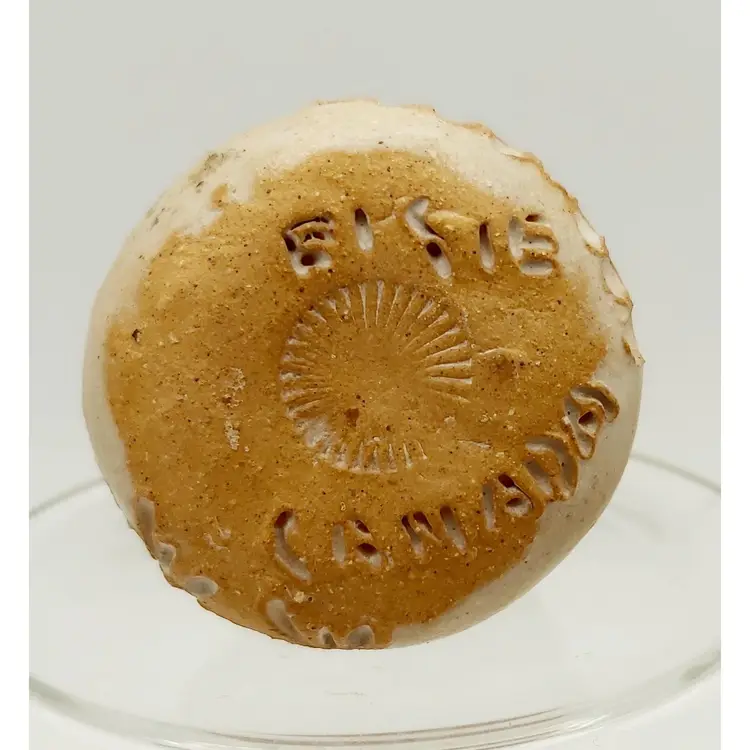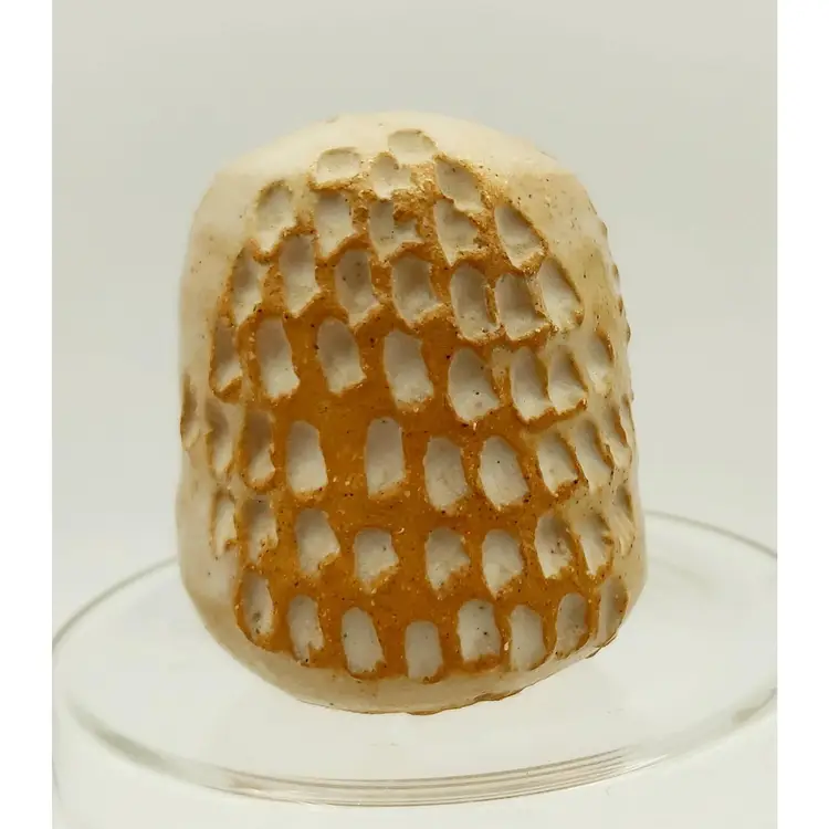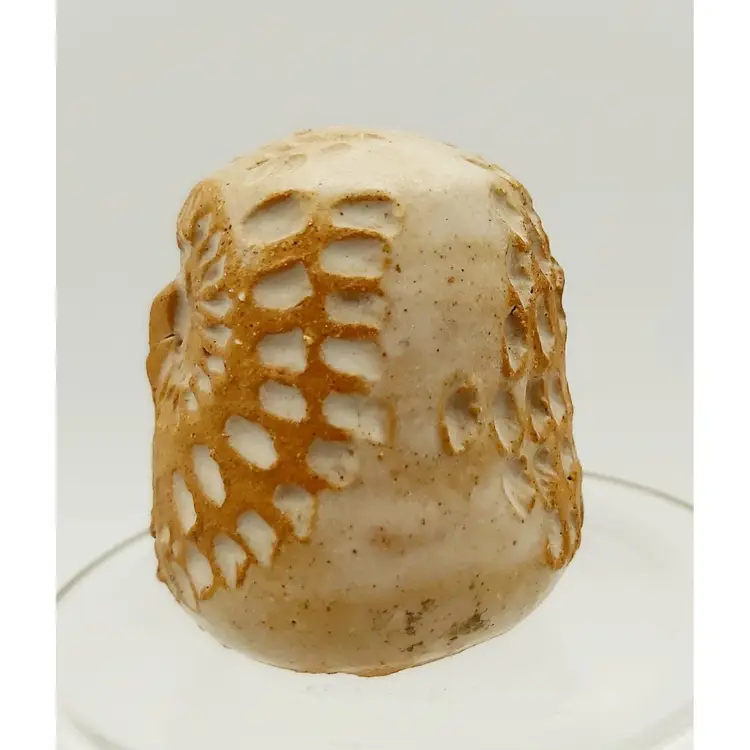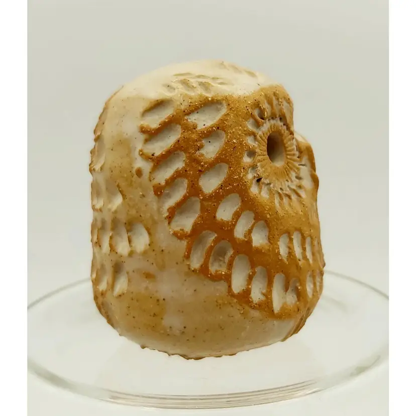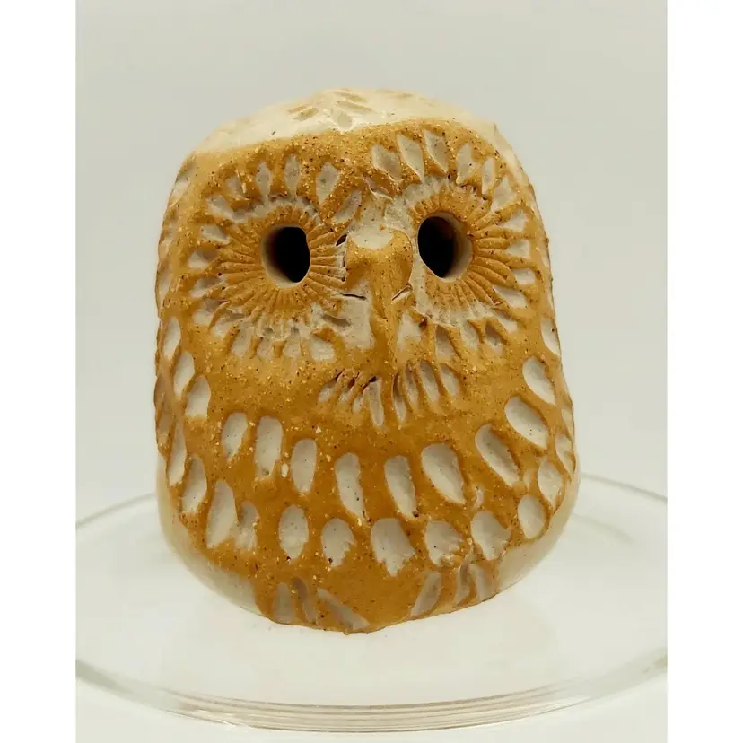 This owl is small but mighty. Beige overglaze is carved out to show the terracotta clay underneath, to give this owl amazing detail and texture. This technic is known as Sgraffito. Artisan stamped and signed. Canadian Studio made. No chips or cracks. Measures approx. 2.25" high x 2" wide diameter.