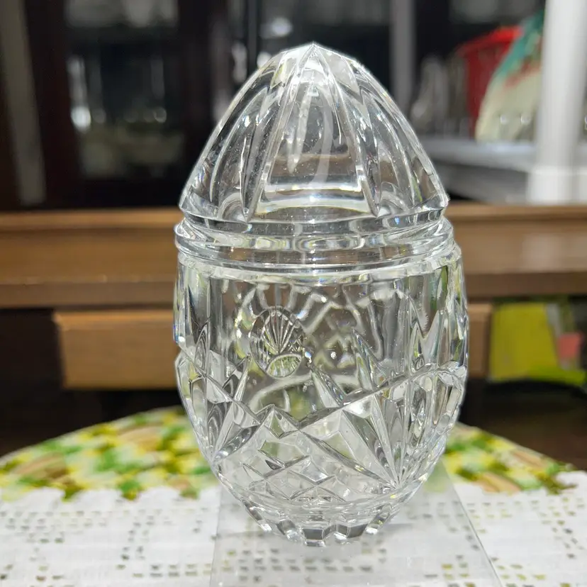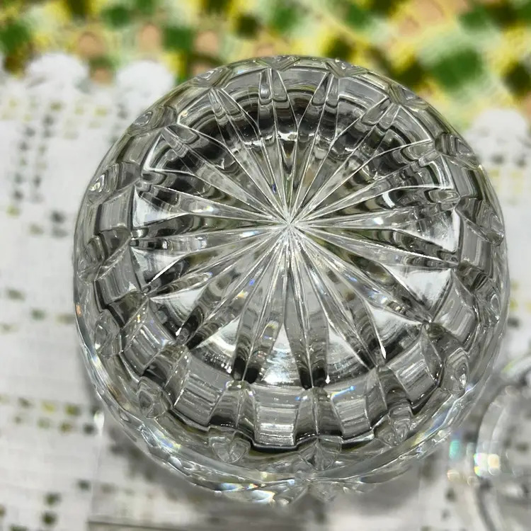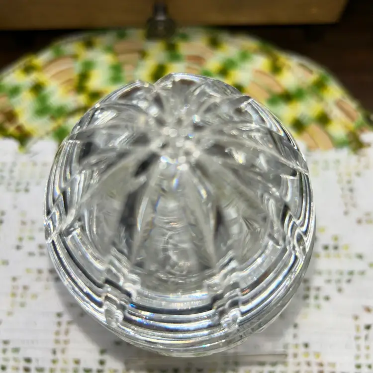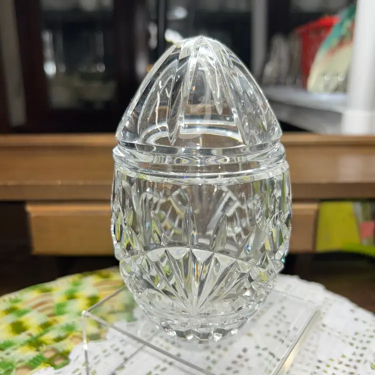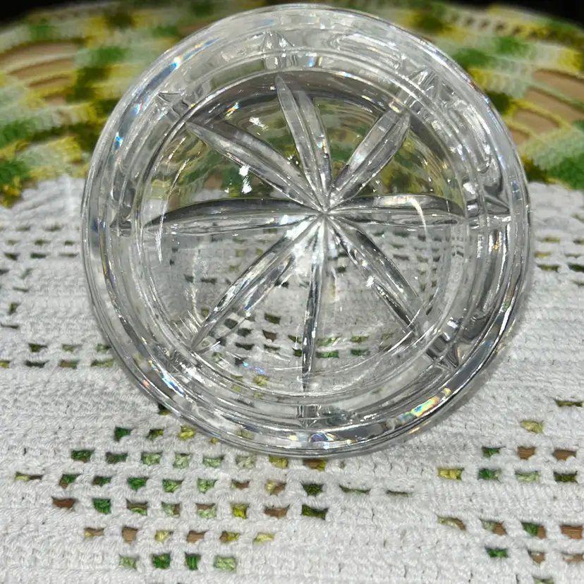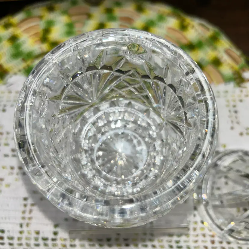 Hand cut and faceted crystal. 6” tall (approximately). 3” diameter at top of jar. Excellent condition. Superior quality. Unusual pattern from a top company.