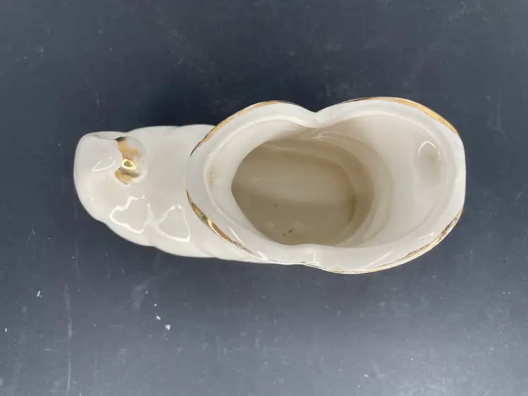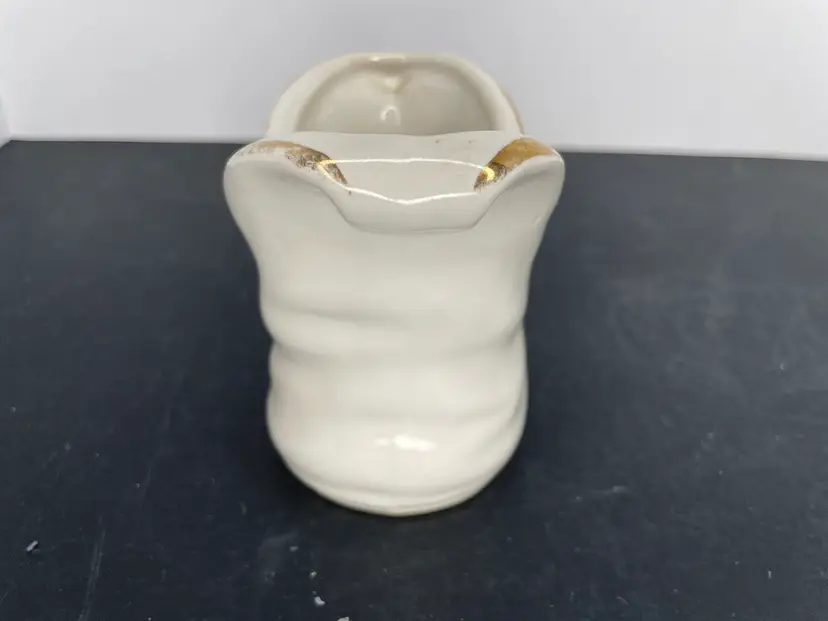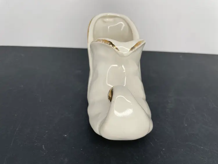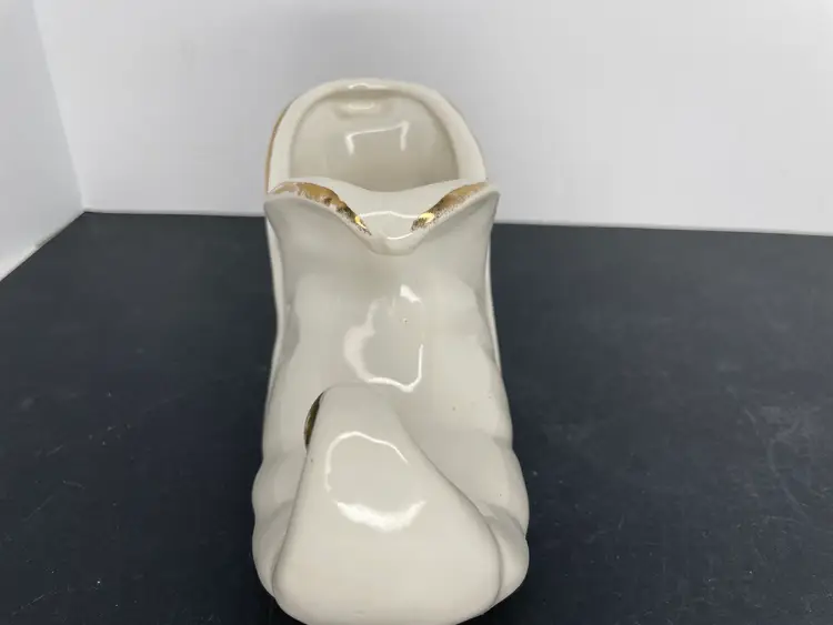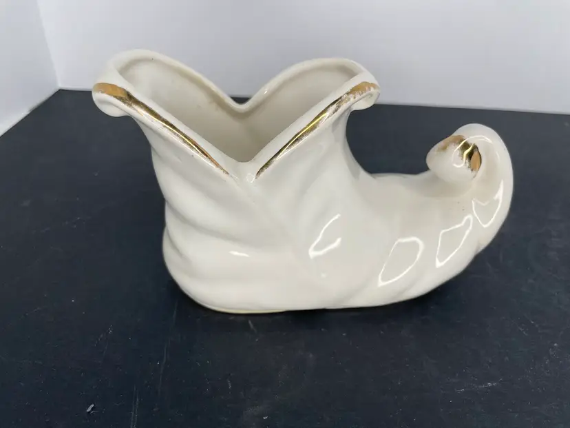 Add a vintage touch to your Christmas decor with this beautiful Shawnee ceramic planter vase. The white elf design is perfect for any room and suitable for various items, including bottle brush trees, candy canes, plants, and flowers. The glossy finish and gold trim make it an original piece that will stand out in any collection.