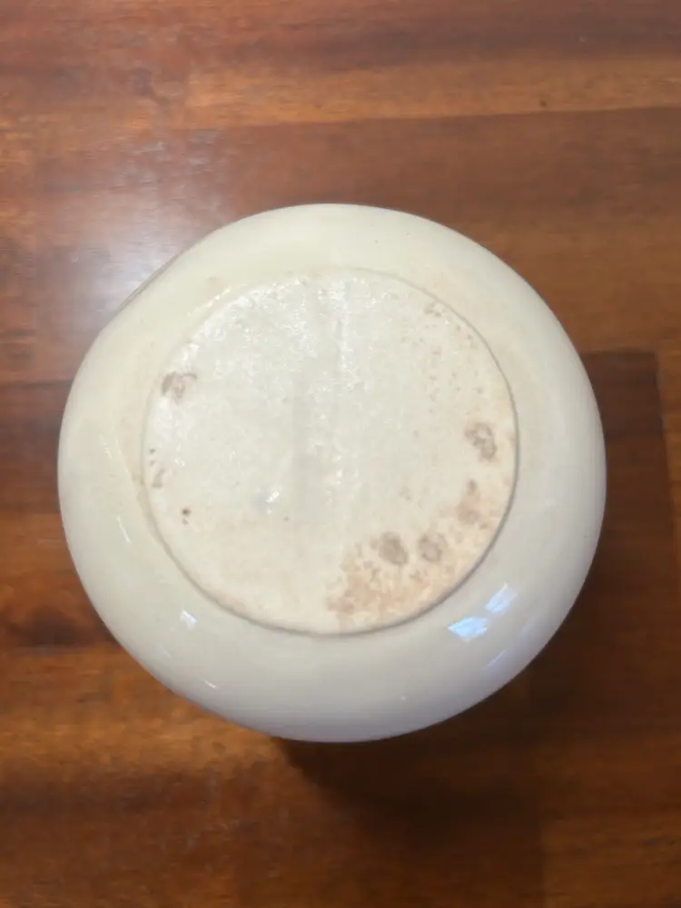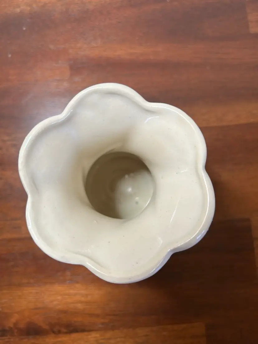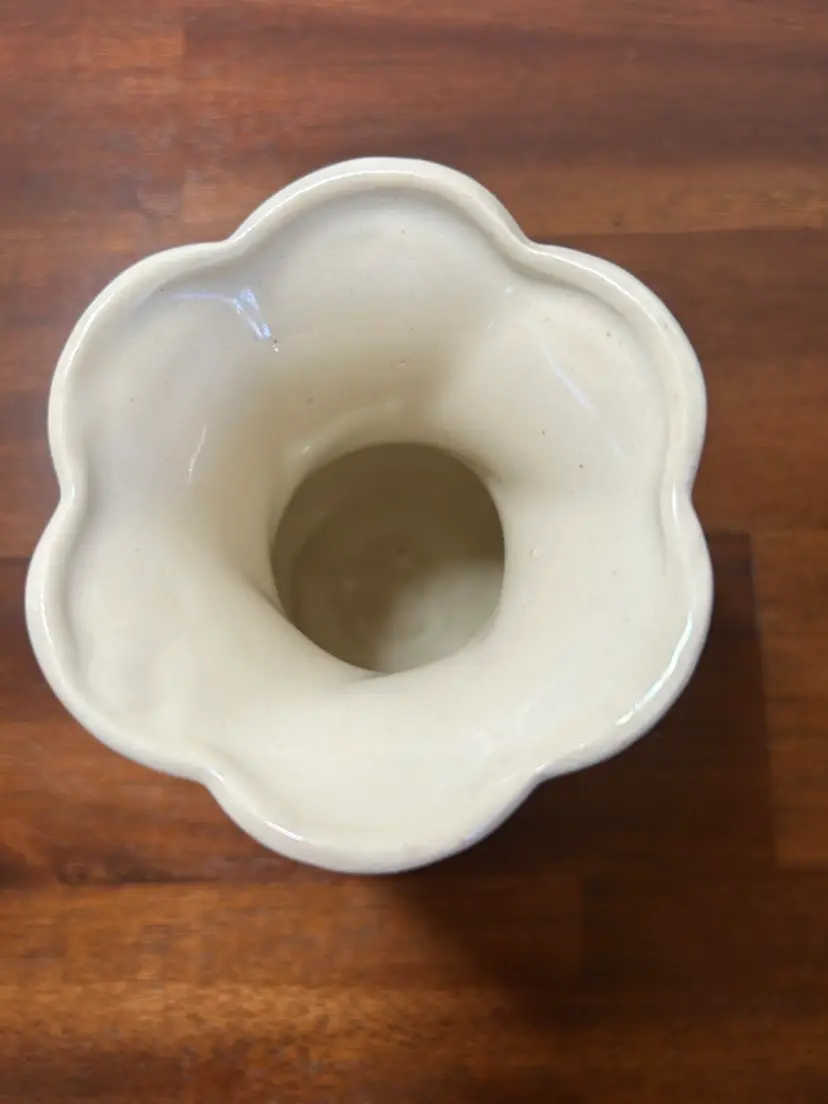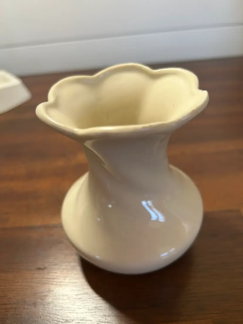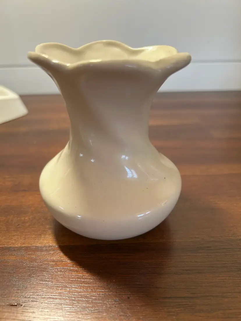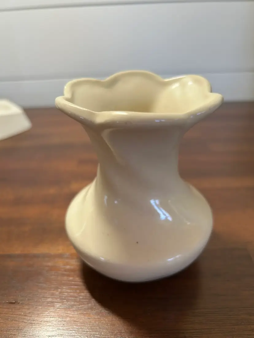 This is a vintage, fluted rim and a twisted or swirled body design. There are no chips or cracks. It stands 4 inches tall and is 3.5 inches across the top. Some sites during my research say this may be a McCoy piece but there are no markings.