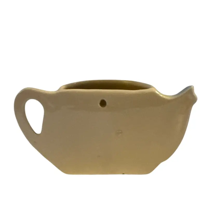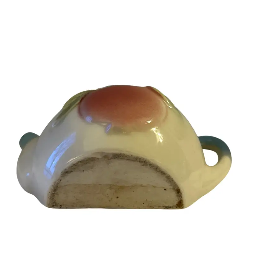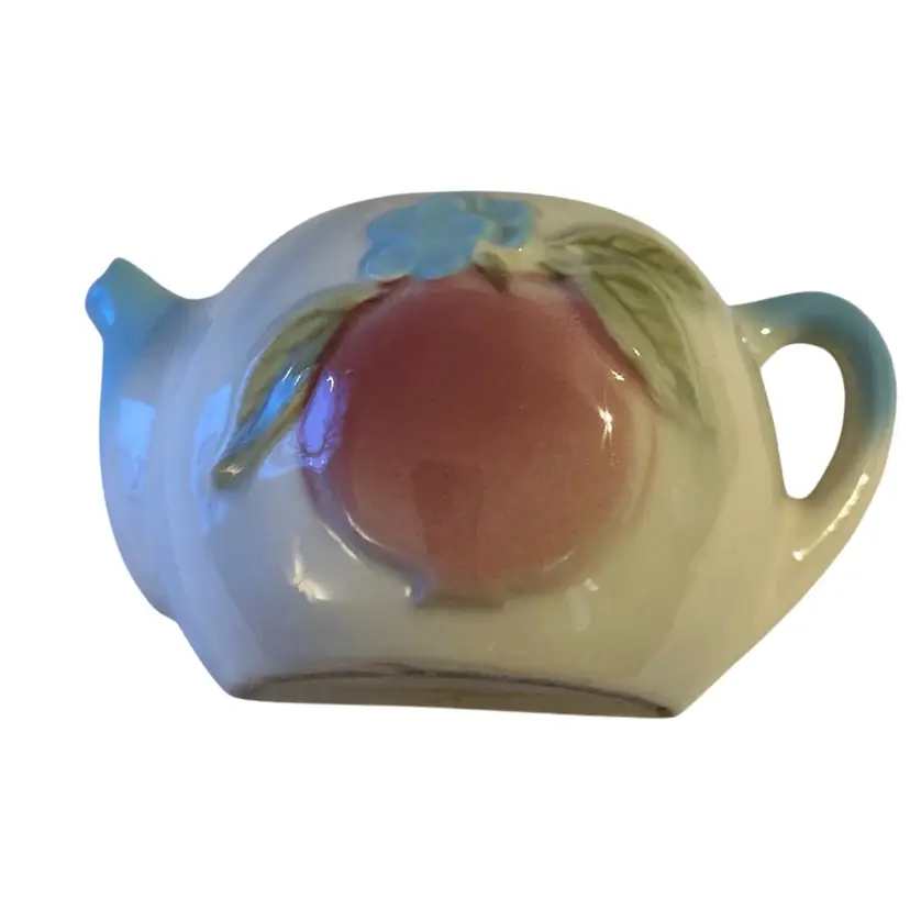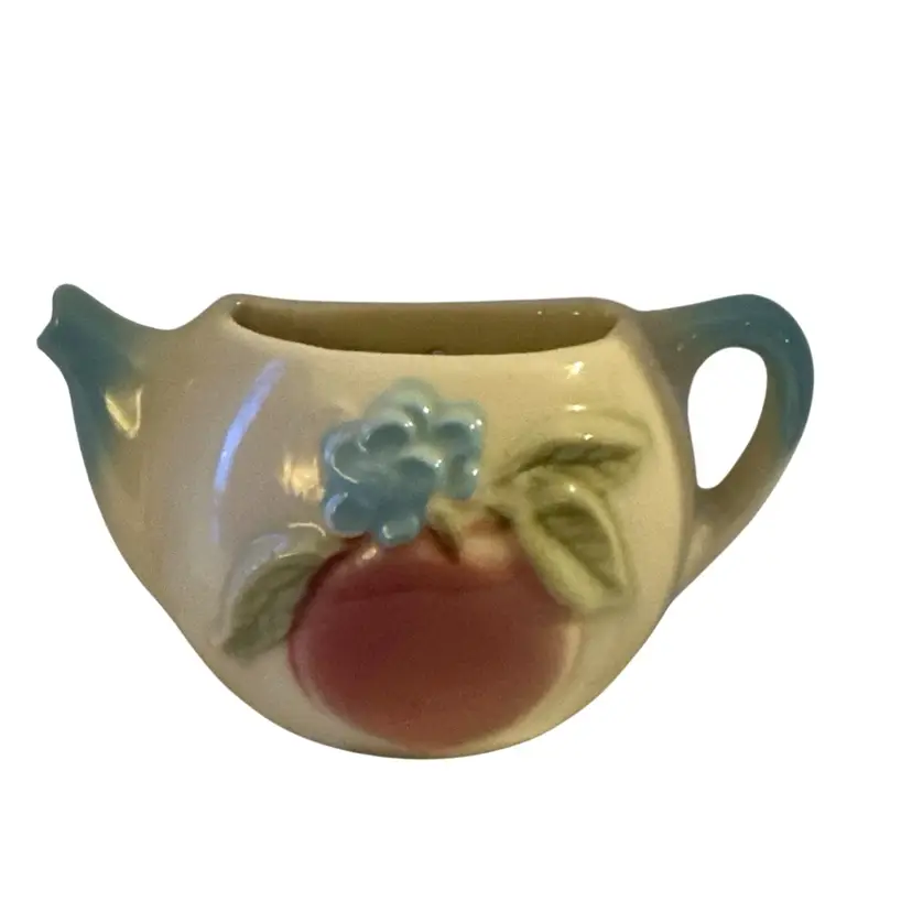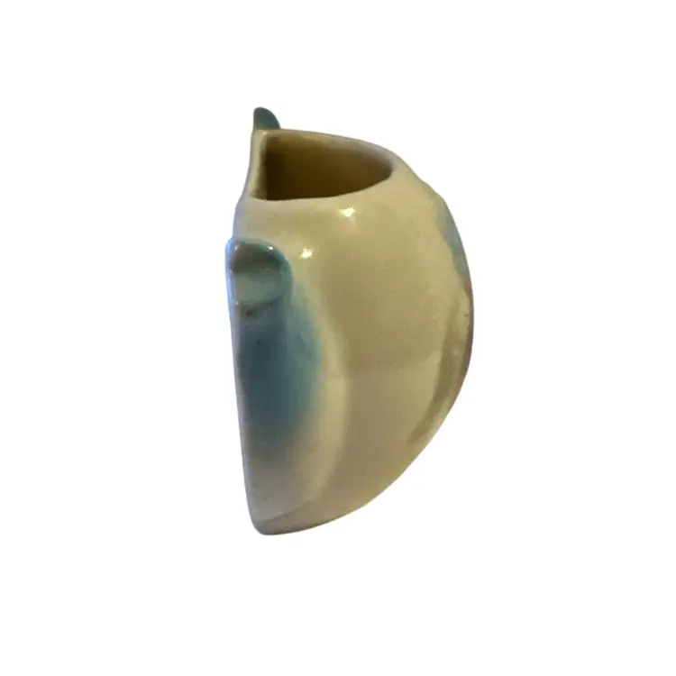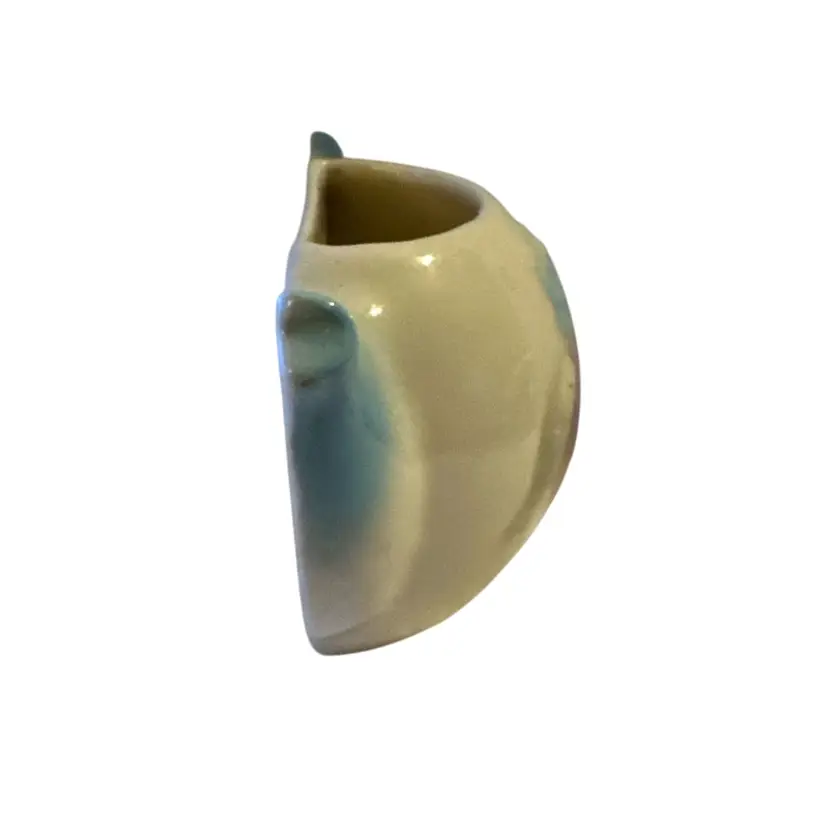 This vintage Shawnee Pottery wall ceramic pocket/planter features a teapot shape, perfect for indoor use in the mid-century modern style of the 1950s. Handmade in the United States, this art pottery piece showcases a glossy finish with a maroon, blue, and white color palette, featuring a plum and floral pattern. Measuring 6.25 inches in length, 3.25 inches in height, and 2.5 inches in width, this original piece by Shawnee Pottery is a unique addition to any collection of decorative pottery and glassware from the mid-20th century.
